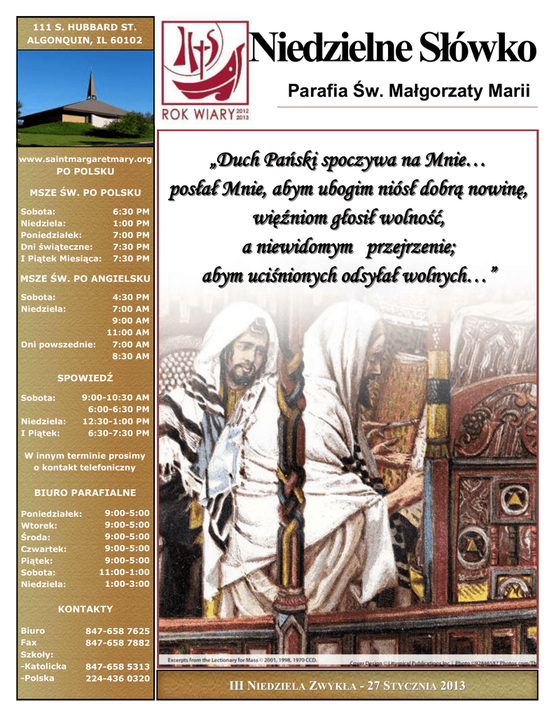 111 S. HUBBARD ST. ALGONQUIN, IL 60102 Niedzielne Słówko Parafia Św. Małgorzaty Marii www.saintmargaretmary.org PO POLSKU MSZE ŚW. PO POLSKU Sobota: Niedziela: Poniedziałek: Dni świąteczne: I Piątek Miesiąca: 6:30 1:00 7:00 7:30 7:30 PM PM PM PM PM MSZE ŚW. PO ANGIELSKU Sobota: Niedziela: Dni powszednie: 4:30 7:00 9:00 11:00 7:00 8:30 „Duch Pański spoczywa na Mnie… posłał Mnie, abym ubogim niósł dobrą nowinę, więźniom głosił wolność, a niewidomym przejrzenie; abym uciśnionych odsyłał wolnych…” PM AM AM AM AM AM SPOWIEDŹ Sobota: Niedziela: I Piątek: 9:00-10:30 AM 6:00-6:30 PM 12:30-1:00 PM 6:30-7:30 PM W innym terminie prosimy o kontakt telefoniczny BIURO PARAFIALNE Poniedziałek: Wtorek: Środa: Czwartek: Piątek: Sobota: Niedziela: 9:00-5:00 9:00-5:00 9:00-5:00 9:00-5:00 9:00-5:00 11:00-1:00 1:00-3:00 KONTAKTY Biuro Fax Szkoły: -Katolicka -Polska 847-658 7625 847-658 7882 847-658 5313 224-436 0320 III NIEDZIELA ZWYKŁA - 27 STYCZNIA 2013 Niedzielne Słówko Refleksja Czytać, by widzieć W średniowieczu mnóstwo ludzi było analfabetami, więc budowniczowie katedr zdobywali się na to, by epopeje biblijne tłumaczyć na język obrazów, rzeźb i witraży. Wiemy, że wiara zaczyna się od słuchania, ale czy jest coś wcześniej, czy jest coś przed słuchaniem? Przed słowem jest wizja, niekoniecznie nadprzyrodzone objawienie. Nigdy nie zapomnę słów, które wypowiedział Henri de Lubac, komentując konstytucję soborową „Dei verbum”: „Choć objawienie biblijne jest istotnie objawieniem słowa, jest jednak nie tylko tym. Teofanie Starego Testamentu sugerują nam, że ponad słowem jest jeszcze wizja, a cała Biblia jest wręcz przepeł- Wielu już starało się ułożyć opowiadanie niona tęsknotą i pragnieniem ujrzenia Boga”. o zdarzeniach, które się dokonały pośród nas, Żeby spisać ewangelię, św. Łukasz wysłuchiwał od naocz- tak jak je przekazali ci, którzy od początku byli świadkami i sługami słowa. nych świadków wszystkiego, co było smakiem ich oczu, gdy naocznymi pośród nich przebywał Jezus. Niewykluczone, że wtedy wła- Postanowiłem więc i ja zbadać dokładnie śnie spotkał też Matkę Jezusa. Zanim cokolwiek spisał, chciał wszystko od pierwszych chwil i opisać ci po zobaczyć na własne oczy miejsca i ludzi, którzy widzieli i słykolei, dostojny Teofilu, abyś się mógł przekonać szeli Jezusa. Jezus najpierw chciał być widziany na ulicach Nazaretu jako zwykły człowiek, by nikt później nie miał wąt- o całkowitej pewności nauk, których ci pliwości, że Bóg może stać się człowiekiem. Piłat miał przed udzielono. sobą tego samego Syna Boga, ale mimo intelektualnego wyW owym czasie: robienia i kultury, niczego poza człowiekiem nie potrafił się dopatrzeć. Chodzi o to, by nie tylko słyszeć o Nim, ale też by Jezus powrócił w mocy Ducha do Galilei, a wiw końcu Go zobaczyć, i nie tylko widzieć, ale też dopatrzeć eść o Nim rozeszła się po całej okolicy. On zaś się Boga. nauczał w ich synagogach, wysławiany przez Widzenie kogoś czyni go bliższym, niż słyszenie o nim lub wszystkich. słyszenie jego słów. Gdy kogoś widzę, doświadczam go bezPrzyszedł również do Nazaretu, gdzie się wypośrednio, mogę do niego przylgnąć, zjednoczyć się z nim, słysząc o kimś, mogę tylko sobie go wyobrazić, a wyobraże- chował. W dzień szabatu udał się swoim nia bywają zwodnicze. Widzenie jest odczuwaniem smaku zwyczajem do synagogi i powstał, aby czytać. czyjegoś istnienia. Benedykt XVI komentował Psalm: Podano Mu księgę proroka Izajasza. Rozwi„»Chodźcie i zobaczcie, jak słodki jest Pan«, dopiero skosz- nąwszy księgę natrafił na miejsce, gdzie było towanie prowadzi do zobaczenia. Pomyślmy o uczniach napisane: „Duch Pański spoczywa na Mnie, poz Emaus: dopiero podczas wspólnej biesiady z Jezusem, dopiero podczas przełamywania chleba otwierają im się oczy. nieważ Mnie namaścił i posłał Mnie, abym uboDopiero gdy rzeczywiście doświadczą jedności z Panem, gim niósł dobrą nowinę, więźniom głosił wolprzejrzą. To dotyczy nas wszystkich: oprócz myślenia i mó- ność, a niewidomym przejrzenie; abym uciśniowienia potrzebujemy doświadczenia wiary, życiowej relacji nych odsyłał wolnych, abym obwoływał rok z Jezusem Chrystusem”. łaski od Pana”. Ewangelia według św. Łukasza 1,1-4;4,14-21 Czytając Biblię, chcę widzieć. Widząc, chcę kosztować, jak Zwinąwszy księgę oddał słudze i usiadł; a oczy słodki jest Pan. Dla człowieka kultury euroamerykańskiej wszystkich w synagodze były w Nim utkwione. słowo jest nośnikiem informacji intelektualnych, dla człowiePoczął więc mówić do nich: „Dziś spełniły się te ka Biblii słowo natchnione jest przestrzenią ukrywającą obecność Boga, możliwością spotkania się z Nim. Czytając słowa Pisma, któreście słyszeli”. Biblię, mam szansę widzieć Chrystusa w każdym słowie, a nie tylko o Nim czegoś się dowiedzieć. W Księdze Wyjścia, tam, gdzie mowa o objawieniu się Boga na Synaju, zapisano, iż Izraelici widzieli dźwięki, a nie, że je słyszeli (Wj 20,18). Raszi tłumaczył ten fenomen tak: „widzieli oni rzeczy, które są do usłyszenia i były niemożliwe do zobaczenia kiedykolwiek indziej”. Augustyn Pelanowski OSPPE Niedzielne Słówko Ogłoszenia W najbliższy poniedziałek 28-go stycznia zapraszamy na Mszę Świętą o 7 wieczorem i adorację Najświetszego Sakramentu, a po niej na spotkanie biblijne w holu kościoła. W przyszły piątek przypada Pierwszy Piątek miesiąca. Zapraszamy na Spowiedź Św. od godziny 6:30 wieczorem i Mszę św. o godzinie 7:30 z udziałem dzieci pierwszo-komunijnych. W czasie tej Mszy zostaną poświęcone świece i książeczki modlitewne do pierwszej komunii. W tym dniu nie odbędzie się spotkanie z cyklu poznajemy Katechizm Kościoła Katolickiego. W sobotę 2-go lutego przypada Święto Ofi