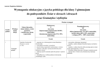 Autorka Magdalena Bobińska Wymagania edukacyjne z języka polskiego dla klasy 3 gimnazjum do podręczników Świat w słowach i obrazach oraz Gramatyka i stylistyka Poziom wymagań Liczba godzin Wiodący temat lekcji Teksty literackie, teksty kultury, treści językowe i stylistyczne, formy wypowiedzi Stanisław Grochowiak Rozmowa o poezji (s. 261) 1 Czym jest poezja? Podstawowy P (na ocenę dopuszczającą [opanowanie 30-50% materiału]) i dostateczną [opanowanie 51%-70% materiału]) Ponadpodstawowy PP (na ocenę dobrą [opanowanie 71%-83% materiału], bardzo dobrą [84%-94% materiału] i celującą [95% - 100% materiału]) Uczeń: Uczeń: – zapoznaje się z informacjami na temat Stanisława Grochowiaka – czyta głośno (wyraźnie i wyraziście) – nazywa formę wypowiedzi wykorzystaną w wierszu – zestawia z sobą sądy o poezji prezentowane przez bohaterów wiersza – analizuje sposób wyrażenia opinii obu postaci w sprawie poezji – identyfikuje się z wybraną opinią na temat poezji, uzasadniając wybór 1 – czyta głośno, dokonując interpretacji – wyjaśnia, z jakim rodzajem literackim kojarzy się budowa utworu – wyjaśnia, w jakiej relacji do siebie pozostają sądy na temat poezji zaprezentowane w wierszu – formułuje refleksje dotyczące własnego rozumienia poezji – zapisuje tekst w formie sceny dramatycznej, dopisując didaskalia 1 Przepis na interpretację (s. 208) – czyta cicho ze zrozumieniem, mając na uwadze informacje podane w tekście – określa problematykę i charakter tekstu – zapisuje najważniejsze pytania dotyczące interpretacji utworu lirycznego – wymienia główne działania związane z interpretacją utworu lirycznego – analizuje rysunek koła interpretacyjnego – wyjaśnia, na czym polega i jak przebiega interpretacja utworu lirycznego – przedstawia własną interpretację wiersza, wykorzystując rysunek koła interpretacyjnego Krzysztof Kamil Baczyński Przypowieść (s. 240) – zapoznaje się z informacjami na temat Krzysztofa Kamila Baczyńskiego – czyta głośno (wyraźnie i wyraziście) – nazywa swoje odczucia, wrażenia czytelnicze – analizuje proces powstawania świata pokazany w wierszu – zapisuje w punktach kolejne etapy powstawania świata – omawia wizerunek Boga ukazany w wierszu – wypełnia podany schemat fragmentami wiersza i ich interpretacją – określa stosunek do rzeczywistości i światopogląd osoby mówiącej – wyjaśnia, jakie refleksje o człowieku przekazuje wiersz – czyta głośno, dokonując interpretacji – wyjaśnia, co sugeruje tytuł utworu – porównuje wizerunek Boga z wiersza z wizerunkami Boga w innych, znanych utworach – wskazuje znany tekst literatury światowej, do którego nawiązuje wiersz – określa charakter nawiązań – uzasadnia, że czas powstania utworu może mieć związek z wymową wiersza – przekształca fragment wiersza o stworzeniu człowieka na tekst prozatorski o charakterze opowieści mitologicznej Miron Białoszewski Przesuwa się... (s. 272) – na podstawie notki biograficznej krótko charakteryzuje autora – czyta głośno (wyraźnie i wyraziście) – wymienia okoliczności i zdarzenia, które obserwuje osoba mówiąca – określa właściwości przedstawionej sytuacji – odczytuje fragmenty Księgi Rodzaju, do których nawiązuje wiersz – uzupełnia i rozwija treść podanego zdania – odczytuje wymowę wiersza – wnioskuje na temat budowy tekstu – czyta głośno, dokonując interpretacji – wyjaśnia, jakiego znaczenia nabiera wiersz w zestawieniu z Księgą Rodzaju – porównuje tekst z Przypowieścią Baczyńskiego i Piosenką o końcu świata Miłosza – na podstawie analizy wybranych fragmentów wiersza podaje charakterystyczne cechy twórczości Białoszewskiego Zbigniew Herbert Sprawozdanie z raju – wyjaśnia potoczne znaczenie słowa raj – czyta fragmenty Katechizmu Kościoła Katolickiego – podaje synonimy pojęcia raj – czyta głośno, dokonując interpretacji Jak czytać poezję? 2 2 Poetyckie wizje stworzenia świata Biblijne motywy 2 przetworzone poetycko (s. 278) Czesław Miłosz Piosenka o końcu świata (s. 257) 2 Potop – najstarsza plaga ludzkości? Zagłada i ocalenie – motyw potopu w najstarszych opowieściach ludzkości Dzieje Utanapisztima (s. 8), Deukalion i Pyrra (s. 11) – zapoznaje się z informacjami na temat Zbigniewa Herberta – czyta głośno (wyraźnie i wyraziście) – wskazuje w opisie elementy „rajskie” i „ziemskie” – odtwarza przeszłość, stan obecny i przyszłość tytułowego miejsca – określa właściwości przedstawionej rzeczywistości, uzasadniając wypowiedź – określa nastawienie osoby mówiącej do opisywanej rzeczywistości – pisze sprawozdanie z raju, wykorzystując własne przeczucia i wyobraźnię – wypowiada się na temat tytułu wiersza – porównuje język wiersza z językiem katechizmu w celu wyciągnięcia wniosków – interpretuje wiersz, wybierając i rozwijając jedną z podanych hipotez – wyjaśnia znaczenie metafory zawartej w ostatnim wersie utworu – dostrzega ironię – redaguje na podstawie zdjęcia ironiczne sprawozdanie ze współczesnego raju – zapoznaje się z informacjami na temat Czesława Miłosza – czyta fragment Apokalipsy św. Jana – czyta głośno (wyraźnie i wyraziście) – opowiada o pierwszych wrażeniach wywołanych lekturą wiersza – określa tematykę wiersza – odtwarza wygląd opisywanego świata – relacjonuje zachowanie się ludzi, odtwarza ich sposób myślenia – wyjaśnia, jaka wizja końca świata została przedstawiona w wierszu – wypowiada się na temat tytułu – analizuje język wiersza – zapoznaje się z definicjami parafrazy i aluzji literackiej – czyta głośno, dokonując interpretacji – wskazuje dziedzinę sztuki, która mogłaby najwierniej odtworzyć zawartość wiersza, uzasadniając wypowiedź – formułuje wnioski wynikające z porównania treści oraz języka 