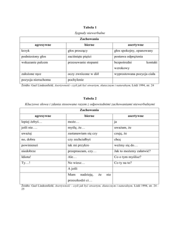Tabela 1 Sygnały niewerbalne Zachowania agresywne bierne asertywne krzyk głos proszący głos spokojny, opanowany podniesiony głos zaciśnięte pięści postawa odprężenia wskazanie palcem przesuwanie stopami bezpośredni kontakt wzrokowy założone ręce oczy zwrócone w dół pozycja nieruchoma pochylenie wyprostowana pozycja ciała Źródło: Gael Lindeenfield, Asertywność- czyli jak być otwartym, skutecznym i naturalnym, Łódź 1994, str. 24 Tabela 2 Kluczowe słowa i zdania stosowane razem z odpowiednimi zachowaniami niewerbalnymi Zachowania agresywne bierne asertywne lepiej żebyś… może… ja jeśli nie…. myślę, że… uważam, że uważaj zastanawiam się czy czuję, że no, dobra czy zechciałbyś chcę powinieneś tak mi przykro weźmy się do… niedobrze przepraszam, czy… Jak to możemy załatwić? Idiota! Ale… Co o tym myślisz? Ty…! No wiesz… Co ty na to? A jeśli Mam nadzieję, że nie przeszkodzi ci… Źródło: Gael Lindeenfield, Asertywność - czyli jak być otwartym, skutecznym i naturalnym, Łódź 1994, str. 24 25