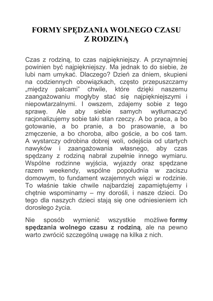 FORMY SPĘDZANIA WOLNEGO CZASU Z RODZINĄ Czas z rodziną, to czas najpiękniejszy. A przynajmniej powinien być najpiękniejszy. Ma jednak to do siebie, że lubi nam umykać. Dlaczego? Dzień za dniem, skupieni na codziennych obowiązkach, często przepuszczamy „między palcami” chwile, które dzięki naszemu zaangażowaniu mogłyby stać się najpiękniejszymi i niepowtarzalnymi. I owszem, zdajemy sobie z tego sprawę. Ale aby siebie samych wytłumaczyć racjonalizujemy sobie taki stan rzeczy. A bo praca, a bo gotowanie, a bo pranie, a bo prasowanie, a bo zmęczenie, a bo choroba, albo goście, a bo coś tam. A wystarczy odrobina dobrej woli, odejścia od utartych nawyków i zaangażowania własnego, aby czas spędzany z rodziną nabrał zupełnie innego wymiaru. Wspólne rodzinne wyjścia, wyjazdy oraz spędzane razem weekendy, wspólne popołudnia w zaciszu domowym, to fundament wzajemnych więzi w rodzinie. To właśnie takie chwile najbardziej zapamiętujemy i chętnie wspominamy – my dorośli, i nasze dzieci. Do tego dla naszych dzieci stają się one odniesieniem ich dorosłego życia. Nie sposób wymienić wszystkie możliwe formy spędzania wolnego czasu z rodziną, ale na pewno warto zwrócić szczególną uwagę na kilka z nich. 1. Organizowanie rodzinnych wycieczek. Nie tylko w czasie urlopu, wakacji lub ferii, ale również podczas weekendu można wyjechać i w atrakcyjny dla całej rodziny sposób, oderwać się od codzienności. Pomysłów można szukać w miejscach atrakcyjnych dla dzieci, dobierając je w zależności od wieku, a istnieje wiele miejsc, które warto odwiedzić z pociechami. Istnieje też wiele form organizacyjnych wycieczek. Mogą to być wycieczki piesze, rowerowe, autokarowe czy organizowane własnym autem, indywidualne, grupowe, krajowe czy zagraniczne. Plan wycieczki można ułożyć samemu, można posiłkować się przewodnikami i poradnikami, Turystyka rodzinna jest jedną z ciekawszych form spędzania czasu wolnego. To dzięki niej mogą być realizowane wychowawcze i poznawcze funkcje turystyki kształtujące rozwój człowieka oraz przygotowujące go do życia w społeczeństwie. Poznawanie kraju ojczystego, regionu, miejsca zamieszkania, jak również gromadzenie o nim różnych wiadomości, ciekawostek i informacji jest motywem przewodnim tego rodzaju turystyki. Zdobywając określony zasób wiedzy, umiejętności i sprawności poszczególni członkowie rodziny mają możliwość orientacji w otaczającej rzeczywistości pod względem przyrodniczym i społecznym oraz kształtują w sobie nawyki właściwych zachowań turystycznych. Ponadto wycieczki zbliżają do siebie członków rodziny i skłaniają do ponownego ich poznania w warunkach innych, niż domowe. 2. Rodzinne spacery. Rodzinne spacery od wycieczek różnią się tym, że są wyłącznie piesze i odbywają się na niedługich dystansach. Jednocześnie są dość krótkie, aby móc je organizować codziennie, i dość długie, aby mogły być jednocześnie ciekawą przygodą. Na rodzinny spacer można pójść do pobliskiego parku lub lasu. Dzięki spacerom nasze pociechy poznają najbliższe otoczenie, odkrywają jego walory przyrodnicze, topografię. Podobnie jak w przypadku wycieczek dzięki rodzinnym spacerom realizowane są funkcje wychowawcze rodziny, przy czym szczególnie modelowana jest funkcja emocjonalno-ekspresyjna. Dzieci spędzając czas na świeżym powietrzu z rodzicami chętniej się otwierają, częściej mówią o swoich odczuciach, łatwiej wchodzą w relacje. Dodatkowo chętniej przyjmują wyzwania. Z takiej wycieczki możemy zaproponować dzieciom zrobienie zielnika, w trakcie spaceru fotografujmy ciekawe okazy przyrody. Możemy też szukać oznak charakterystycznych dla danej pory roku. 3. Zabawy na świeżym powietrzu. Będąc na spacerze, aż żal nie skorzystać z możliwości jaką stwarzają nam zabawy ruchowe. Bieganie, skakanie, gra w piłkę – to typowe przykłady zabaw na świeżym powietrzu. Skorzystać też można z placów zabaw, na których dostępne są huśtawki, zjeżdżalnie, drabinki czy ścianki wspinaczkowe. Przebywanie dzieci na świeżym powietrzu wpływa korzystnie na ich rozwój organizmu. Połączone z ruchem pozwala na rozładowanie energii wewnętrznej. Dzieci w trakcie gier i zabaw mają kontakt z rówieśnikami, tworzą grupy oraz rywalizują ze sobą. Każde zaangażowanie dzieci w grę lub zabawę ma pozytywny wpływ na ich rozwój osobowości. Uczy współdziałania w grupie, wyzwala chęć walki, pozwala na świadome przeżywanie zwycięstw i godne przyjmowanie porażek. 4. Aktywność sportowa (fizyczna). Sport to zdrowie – prawda to znana od dawien dawna. Rodzice już w kilkuletnim dziecku powinni zaszczepiać tę myśl. Najprostszym rozwiązaniem, by to osiągnąć – dającym wiele przyjemności i pozytywnych korzyści dla wszystkich domowników – będzie wspólne i aktywne uprawianie sportu. Jednak na motywację naszych dzieci do podjęcia jakiejkolwiek aktywności sportowej bardzo duży wpływ ma nasz sposób zachowywania się. Jeżeli rodzice są aktywni, mają mnóstwo zainteresowań i chętnie uprawiają sport to z dużym prawdopodobieństwem ich dziecko przyjmie taką postawę za prawidłową i będzie ich naśladować. Taka zaszczepiona i rozwijana postawa pozwoli w przyszłości cieszyć się zdrowiem i dobrym samopoczuciem naszych dzieci. Różnorodność form aktywności fizycznej daje możliwość wyboru związane go z potrzebami, oczekiwaniami i sprawnością każdego człowieka. Całą rodziną możemy wybrać się na wycieczkę rowerową, pochodzić po górach, popływać lub po prostu pograć w piłkę. Możemy też uczestniczyć w imprezach sportowych organizowanych przez lokalne instytucje i organizacje sportowe. Takie zachowanie nie tylko pokaże dziecku, że sport jest ciekawą alternatywą do siedzenia przed komputerem lub telewizorem, ale znakomicie wpłynie na relacje rodzinne. Wspólne sp