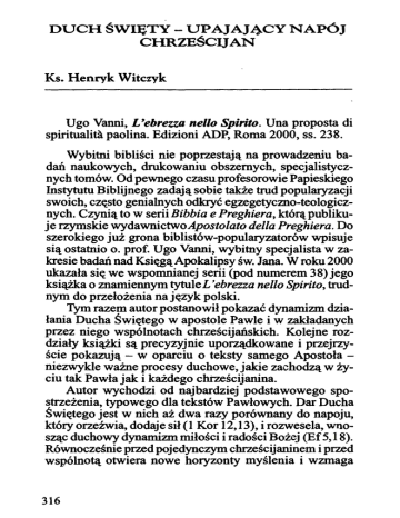 DUCH ŚWIĘTY- UPAJAJ4CY NAPÓJ CHRZEŚCIJAN Ks. Henryk Witczyk U go Vanni, L'ebrezza nello Spirito. Una proposta di spiritualita paolina. Edizioni ADP, Roma 2000, ss. 238. Wybitni bibliści nie poprzestają na prowadzeniu badań naukowych, drukowaniu obszernych, specjalistycznych tomów. Od pewnego czasu profesorowie Papieskiego Instytutu Biblijnego zadają sobie także trud popularyzacji swoich, często genialnych odkryć egzegetyczno-teologicznych. Czynią to w serii Bibbia e Preghiera, którą publikuje rzymskie wydawnictwoApostolato delia Preghiera. Do szerokiego już grona biblistów-popularyzatorów wpisuje sią ostatnio o. prof. U go Vanni, wybitny specjalista w zakresie badań nad Księgą Apokalipsy św. Jana. W roku 2000 ukazała się we wspomnianej serii (pod numerem 38) jego książka o znamiennym tytule L 'ebrezza nello Spirito, trudnym do przełożenia na język polski. Tym razem autor postanowił pokazać dynamizm działania Ducha Świętego w apostole Pawle i w zakładanych przez niego wspólnotach chrześcijańskich. Kolejne rozdziały książki są precyzyjnie uporządkowane i przejrzyście pokazują- w oparciu o teksty samego Apostoła niezwykle ważne procesy duchowe, jakie zachodzą w ży ciu tak Pawła jak i każdego chrześcijanina. Autor wychodzi od najbardziej podstawowego spostrzeżenia, typowego dla tekstów Pawiowych. Dar Ducha Świętego jest w nich aż dwa razy porównany do napoju, który orzeźwia, dodaje sił (l Kor 12, 13), i rozwesela, wnosząc duchowy dynamizm miłości i radości Bożej (Ef 5, 18). Równocześnie przed pojedynczym chrześcijaninem i przed wspólnotą otwiera nowe horyzonty myślenia i wzmaga 316 entuzjazm działania. Na tym polega owa "ebrezza'' - upojenie podobne do uniesienia, w jakim znajduje się czło wiek odnoszący życiowy sukces. Następnie auto;r książki wyjątkowo dużo mieją poświę ca ukazaniu najważniejszego działania Ducha Swiętego w chrześcijaninie. To On sprawia żywą więź chrześcijanina z Jezusemjako PANEM (l Kor 12,3) i z Bogiemjako Ojcem (Rz 8, 15). Tra:fuie również zauważa, że całe życie chrześcija nina podlega prawu ,,Ducha życia" (Rz 8,2): Duch objawia mu to, co jest wolą Ojca, przybliżoną ludziom najpierw w Jezusie. Poddając się temu wpływowi Ducha objawiającemu tajemnice życia Bożego chrześcijanin staje się "dzieckiem Bożym", którym kieruje Duch (Rz 8,14). Osią ga w ten sposób pełnię człowieczeństwa, zamierzonąprzez Boga Stworzyciela i Ojca. Dynamizmowi Ducha w chrześcijaninie przeciwstawia się dynamizm "ciała". Tam, gdzie św. Paweł mówi negatywnie o "ciele", ma na myśli egoizm, wyniesiony do rangi systemu lub modelu życia, który w sposób dyktatorski wręcz determinuje wszystkie decyzje i działania człowie ka. Skutki działania tego mechanizmu w człowieku to "uczynki ciała" (por. Ga 5,19-21). Tak więc dynamizm "ciała" wprowadza w egzystencję człowieka grzech, który w ujęciu Pawłowym oznacza wielką »yrwę w duchowo-cielesnym organizmie człowieka, a tym samym irytuje Boga. Nagromadzenie się takich wyrw prowadzi do całkowitego upadku człowieka, do -:jak to trafnie ujmuje U. Vanni - śmierej ·"antropologicznej". Jest to taki stan człowieka, który przypomina znieruchomiałego trupa. Paweł nazywa ten stan ,,zagładą'' (apóleia) por. l Kor 1,18; Flp 1,28; 2 Tes 2,3). "Ich losem- zagłada (apóleia), ich bogiem - brzuch, a chwała - w tym, czego winni się wstydzić. To ci, których dążenia są przyziemne" (Flp 3, 19). ,~ ci, którzy chcą się bogacić, wpadają w pokusę i w zasadzkę oraz w liczne nierozumne i szkodliwe pożądania. One to pogrążają ludzi w zgubę i zatracenie" (l Tm 6,9). "Ci, którzy się takich rzeczy dopuszczają, Królestwa Bożego nie odziedziczą'' (Ga 5,21). "317 W zdecydowanej mierze jednak pneumatologia Pawło wa, a co za tym idzie także ta prezentowana w książce L'ebrezza nello Spirito, dotyczy działania Ducha w czło wieku, który pozwala Mu się prowadzić. Działając od wewnątrz Duch Święty nade wszystko ułatwia człowieko wi "wyzbyć się samego siebie", stać się prawdziwie ubogim, czyli odczuwającym życie jako największy dar od Boga. Kiedy już ten stan chrześcijanin osiągnie, wówczas Duch pozwala mu doznawać prawdziwej wolności, typowej dla chrześcijanina, czyli daje mu żyć miłością ofiarną i bezinteresowną. To ta przestrzeń - sfera wolności, która jest miłością - stanowi uprzywilejowane pole działania Ducha, który jako Miłość Boża ,,został wlany w nasze serca" (Rz 5,5) i prowadzi człowieka na niewyobrażalne poziomy, pozwala mu naśladować miłość samegoBoga. Działanie Ducha porywa nie tylko pojedynczego, wyjątkowego chrześcijanina, ale każdego autentycznego! W spólnota złożona z autentycznych chrześcijan staje się podobna do Oblubienicy, która oddając się Chrystusowimiłością całkowitą i wyłączną- potrafi kochać jak On. Autor poświęca wiele miejsca życiu Pawła, które nazywa wręcz ,,życiem konsekrowanym". Chodzi rzecz jasna o życie, którym we wszystkich momentach kieruje Duch Święty. Nawet jeżeli Apostoł nie znał współczesnych form tego życia, to radykalizm i intensywność jego posłu gi sprawia, że "winien być uważany za protagonistę i inspiratora życia konsekrowanego". Wreszcie, działanie Ducha, który wlewa w serce czło wieka miłość właściwą Bogu, zmierza do tego, aby chrześcijanin nieustannie uobecniał w swoim życiu Prawdę Chrystusa (por. Ef 4,15). Jedynie takie życie pozwala mu mieć żywy kontakt z Bogiem - z Ojcem. Jest to kontakt, który nosi cechy starotestamentowego "twarzą w twarz" z Bogiem, ale przeżywanego już nie od czasu do czasu w świątyni, ale nieustannie - we wszystkich momentach codziennych zmagań. W ten sposób chrześcijanin sprawuje nowy kult "w Duchu i Prawdzie". Jego finałem będzie spotkanie z Bogiem "twarzą w twarz" w niebie. 318 Zarysowane przez o. prof. U go Vanniego za