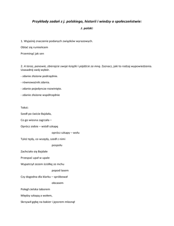 Przykłady zadań z j. polskiego, historii i wiedzy o społeczeństwie: J. polski: 1. Wyjaśnij znaczenie podanych związków wyrazowych. Oblad się rumieocem Przeminąd jak sen 2. A teraz, panowie, zbierajcie swoje książki i pójdźcie za mną. Zaznacz, jaki to rodzaj wypowiedzenia. Uzasadnij swój wybór. - zdanie złożone podrzędnie. - równoważnik zdania. - zdanie pojedyncze rozwinięte. - zdanie złożone współrzędnie Tekst: Szedł po świcie Bajdała, Co go wiosna zagrzała – Oprócz siebie – wiódł szkapę oprócz szkapy – wołu Tyleż tędy, co wszędy, szedł z nimi pospołu Zachciało się Bajdale Przespad upał w upale Wypatrzył zezem ściółkę ze mchu popod lasem Czy dogodna dla klarku – spróbował obcasem Poległ cielska taborem Między szkapą a wołem, Skrzywił gębę na bakier i jęzorem mlasnął I ziewnął w niebogłosy i splunął i zasnął. Nie wiadomo dziś wcale, Co się śniło Bajdale. Lecz wiadomo, że szpecąc przystojnośd przestworza, Wylazł z rowu Dusiołek jak półbabek z łoża. Pysk miał z żabia ślimaczy – (że też taki żyd raczy!) – A zad tyli, co kwoka, kiedy znosi jajo. Milcz, gębo nieposłuszna, bo dziewki wyłają! Ogon miał Ci z rzemyka, Podogonie zaś z łyka. Siadł Bajdale na piersi, jak ten kruk na snopie – Póty dusił i dusił, aż coś warkło w chłopie! Warkło, trzasło, spotniało! Cod się stało, Bajdało? Dmucha w wąsy ze zgrozy, jękiem złemu przeczy – Słuchajta wszystkie wierzby jak chłop przez sen beczy! Sterał we śnie Bajdała Pół duszy i ciała, Lecz po prawdzie niedługo ze zmorą marudził – Wyparskał ją nozdrzami, zmarszczył się i zbudził. Rzekł Bajdała do szkapy: Czemu zwieszasz swe chrapy? Trzeba było kopytem Dusiłka przetrącid, Zanim zdążył mój spokój w całym polu zmącid. Rzekł Bajdała do wołu: Czemuś skąpił mozołu? Trzeba było rogami Dusiłka przetrącid, Gdy chciał na mnie swej duszy paskudę wyłonid. Rzekł Bajdała do Boga: O, rety – olaboga! Nie dośd Ci, żeś potworzył mnie, szkapę i wołka? Jeszcześ musiał takiego zmajstrowad Dusiołka? Bolesław Leśmian, Dusiołek [w:] Poezje wybrane, Zakład Narodowy im. Ossolioskich, Wrocław 1983 Zadanie 3. Fabuła utworu mówi: a) O pochodzeniu i paskudnym wyglądzie dusiołka. b) O przygodzie niejakiego Bajdały podczas snu. c) O walce szkapy i wołu z senną zmorą. Zadanie 4. Dusiołek jest postacią: a) b) c) d) Realistyczną. Miologiczną. Prawdziwą. Fantastyczną. Zadanie 5. Dusiłka można uznad za metaforę: a) b) c) d) Zgubnych skutków spania w lesie. Rozbójników czyhających na podróżnych. Dręczących bohatera obaw. Smutku i nieszczęścia. Zadanie 6. Imię Dusiołek kojarzące się z czasownikiem dusid jest: a) b) c) d) Neologizmem. Archaizmem. Wyrazem gwarowym. Wyrazem potocznym. Zadanie 7. Wypisz z utworu Leśmiana zgrubienie i wyjaśnij jego funkcję. Zadanie 8. Utwór Dusiołek można nazwad balladą. Podaj jedną cechę ballady, którą odnajdujesz w tekście. Historia: Zadanie 1. a) Podaj nazwę obiektu przedstawionego na ilustracji. ……………………………… b) Podaj wiek, w którym powstał przedstawiony wynalazek. …………………………………… Tekst: Kronika Polska Gala Anonima "*...+ cesarz Otto *...+ przybył do *grobu+ św. Wojciecha dla modlitwy i pojednania, a zarazem w celu poznania sławnego Bolesława, jak o tym można dokładnie wyczytad w księdze o męczeostwie *tego+ świętego. Bolesław przyjął go zaszczytnie i okazale, jak wypadło przyjąd króla, cesarza rzymskiego i dostojnego gościa. (...) Zważywszy jego chwałę, potęgę i bogactwo, cesarz rzymski zawołał w podziwie: " Na koronę mego cesarstwa! To, co widzę większe jest, niż wieśd głosiła!" I za radą swych magnatów dodał wobec dostojników: " Nie godzi się takiego i tak wielkiego męża, jakby jednego spośród dostojników, księciem nazywad lub hrabią, lecz *wypada+ chlubnie wynieśd go na tron królewski i uwieoczyd koroną". A zdjąwszy z głowy diadem cesarski, włożył go na głowę Bolesława na *zadatek+ przymierza i przyjaźni i za chorągiew triumfalną dał mu w darze gwóźdź z Krzyża Paoskiego wraz z włócznią św. Maurycego, w zamian za co Bolesław ofiarował mu ramię św. Wojciecha." I tak wielką owego dnia złożyli się miłością, że cesarz mianował go bratem i współpracownikiem cesarstwa i nazwał go sprzymierzeocem i przyjacielem narodu rzymskiego. *…+ Zadanie 2. W wyniku zjazdu gnieźnieoskiego: a) b) c) d) Pozycja Bolesława Chrobrego uległa wzmocnieniu. Otton III odwiedził grób biskupa zamordowanego przez Prusów. Cesarz negatywnie odniósł się do koronacji Bolesława. Uległy pogorszeniu stosunki polsko – niemieckie. Zadanie 3. Otton otrzymał w darze od Bolesława: a) b) c) d) Diadem. Ramię św. Wojciecha. Włócznię św. Maurycego. Gwóźdź z Krzyża Paoskiego. Zadanie 4. Włożenie diademu cesarskiego na głowę Bolesława Chrobrego mogło oznaczad: a) b) c) d) Koronację polskiego księcia na króla. Przekazanie władzy nad polskim kościołem. Uznanie Bolesława Chrobrego za sprzymierzeoca cesarza. Podarowanie polskiemu księciu cennej relikwi. WOS Zadanie 1. Patriotyzm to postawa: a) Wyrażająca się bezkrytycznym stosunkiem do własnego narodu oraz pogardą i nienawiścią do innych narodów. b) Uznająca interes własnego narodu za wartośd najwyższą. c) Pewności, że więzy narodowe i tradycja są nieistotne, a prawdziwą ojczyzną człowieka jest cały świat. d) Charakteryzująca się przywiązaniem i miłością do ojczyzny oraz solidarnością z własnym narodem.
