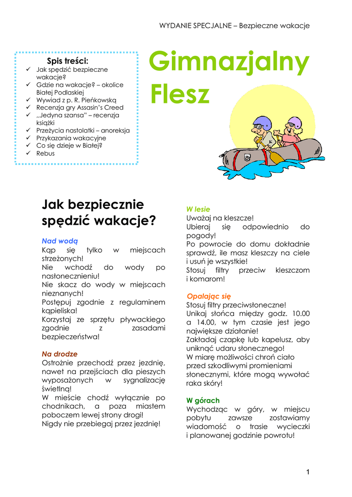 WYDANIE SPECJALNE – Bezpieczne wakacje Spis treści: Jak spędzić bezpieczne wakacje? Gdzie na wakacje? – okolice Białej Podlaskiej Wywiad z p. R. Pieńkowską Recenzja gry Assasin’s Creed ,,Jedyna szansa” – recenzja książki Przeżycia nastolatki – anoreksja Przykazania wakacyjne Co się dzieje w Białej? Rebus Gimnazjalny Flesz Jak bezpiecznie spędzić wakacje? Nad wodą Kąp się tylko w miejscach strzeżonych! Nie wchodź do wody po nasłonecznieniu! Nie skacz do wody w miejscach nieznanych! Postępuj zgodnie z regulaminem kąpieliska! Korzystaj ze sprzętu pływackiego zgodnie z zasadami bezpieczeństwa! Na drodze Ostrożnie przechodź przez jezdnię, nawet na przejściach dla pieszych wyposażonych w sygnalizację świetlną! W mieście chodź wyłącznie po chodnikach, a poza miastem poboczem lewej strony drogi! Nigdy nie przebiegaj przez jezdnię! W lesie Uważaj na kleszcze! Ubieraj się odpowiednio do pogody! Po powrocie do domu dokładnie sprawdź, ile masz kleszczy na ciele i usuń je wszystkie! Stosuj filtry przeciw kleszczom i komarom! Opalając się Stosuj filtry przeciwsłoneczne! Unikaj słońca między godz. 10.00 a 14.00, w tym czasie jest jego największe działanie! Zakładaj czapkę lub kapelusz, aby uniknąć udaru słonecznego! W miarę możliwości chroń ciało przed szkodliwymi promieniami słonecznymi, które mogą wywołać raka skóry! W górach Wychodząc w góry, w miejscu pobytu zawsze zostawiamy wiadomość o trasie wycieczki i planowanej godzinie powrotu! 1 WYDANIE SPECJALNE – Bezpieczne wakacje Wyruszając w trasę zabieraj ze sobą przewodniki i mapy turystyczne do zaplanowania wycieczki! Do plecaka schowaj telefon komórkowy z naładowaną do pełna baterią, a w nim zapisany numer górskiego ochotniczego pogotowia ratunkowego (601-100-300) Wybierz szlak jak najbardziej odpowiedni dla Ciebie, pod względem trudności dotarcia na szczyt. ____________________________________________________________________ Gdzie na wakacje? Serpelice – miejsce wypoczynkowe, w którym można popływać na kajaku oraz łódce. Znajdują się tam też tereny wędkarskie i szlaki turystyczne. Kazimierz Dolny – miasteczko, które posiada dużą ilość obiektów i miejsc zabytkowych (m.in. obiekty sakralne, zabytkowe budynki Muzeum Nadwiślańskiego, synagoga, zespół zamkowy, budownictwo drewniane). Poza rynkiem i centrum miasta można zobaczyć również: Korzeniowy Dół, Wąwóz Plebanka i Wąwóz Granicznik. Poza trasami spacerowymi i zabytkami Kazimierz oferuje szeroki wachlarz atrakcji turystycznych, tj. flotylla rzeczna - organizująca rejsy wycieczkowe po Wiśle i imprezy na statkach, przejażdżki bryczkami i parki liniowe. Firlej – miasto te należy do tych miejsc regionu Lubelszczyzny, gdzie warto pojechać w porze wiosennych i letnich urlopów czy weekendów. Jest to znakomite miejsce, gdzie można odpocząć od codziennej pracy. Atrakcjami turystycznymi są m.in. jezioro, trasy wycieczkowe piesze i rowerowe oraz tereny wędkarskie. Janów Podlaski – główną atrakcją tego miasta jest stadnina koni – jedna z najstarszych i najpiękniejszych w Polsce. Okuninka – wieś letniskowa, nad którą leży Jezioro Białe. W czasie wakacji można zatrzymać się na polu namiotowym oraz skorzystać ze spływów kajakowych. Nałęczów – miejscowość rekreacyjno-wypoczynkowa, w której znajduje się Park Zdrojowy, liczne placówki muzealne, ścieżki rowerowe, szlaki spacerowe i turystyczne. 2 WYDANIE SPECJALNE – Bezpieczne wakacje Krasnobród – miasto, w którym znajduje i pałaców, rezerwat przyrody oraz park linowy. Tym razem opowiem Wam o grze Assassin’s Creed, w której spotykamy Desmond’a Miles. Dzięki maszynie Amimus wciela się w swojego przodka Altaira, który należał do zakonu Assasynów. Może się zdarzyć, iż na kilka dni odłożymy grę na półkę, ponieważ akcja polega na tym, że lokalizujemy i zabijamy 10 osób w ten sam sposób. Mimo tego wielkiego minusa gra nadrabia wieloma ciekawymi urozmaiceniami tj. grafika czy sposób walki. się duża ilość muzeów Moim zdaniem najciekawsze w tej grze jest to, że możemy wspinać się na każdy budynek, który chcemy. W połączeniu z miastami, po których się poruszamy, tworzy to wspaniały duet. Jeśli to Wam nie wystarczy, możecie zbierać inne przedmioty ukryte w różnych częściach świata lub pomagać ludziom. Polecam tę grę każdemu, a także jej kolejne części, które są jeszcze ciekawsze. Dawid Krasucki 3 WYDANIE SPECJALNE – Bezpieczne wakacje „Jedyna szansa” Książkę Harlana Cobena pt. "Jedyna szansa" przeczytałam już bardzo dawno. Był to mój pierwszy kryminał. Opisana jest w nim historia Marca Seidmana, chirurga plastycznego. Ten człowiek, który nie miał wrogów, został postrzelony we własnym domu i zapadł w śpiączkę. Kiedy obudził się po kilkunastu dniach, okazało się, że jego a żona Monica sześciomiesięczna zniknęła bez nie żyje, córka śladu. "Jedyna szansa" to idealna propozycja dla miłośników książek tego gatunku. Trzyma w napięciu od początku do końca. Dużym plusem są świetne zwroty akcji i różnorodni bohaterowie. Nie wiadomo, jak wszystko się skończy i czy ostatecznie będzie happy end, czy dramat. Duża ilość dialogów sprawia, że książkę czyta się bardzo szybko. Polecam wszystkim. Tara Policja podejrzewała go o udział w tej zbrodni. Marc żądanie zapłaty milionów dolarów, o tym FBI. pieniądze, w dalszym otrzymał pocztą okupu poinformował Przekazane ale ciągu dwóch zostają porywacze nie oddają dziecka. Mija osiemnaście miesięcy, a śledztwo punkcie. tkwi w martwym Niespodziewanie porywacze znów się kontaktują, a Marc jest gotowy zrobić wszystko, aby odzyskać Tarę... 4 WYDANIE SPECJALNE – Bezpieczne wakacje Przeżycia nastolatki - anoreksja Kolejny dzień i kolejna kłótnia z rodzicami o te głupie oceny... Szkoła, obiad, lekcje i sen-właśnie tak „koch