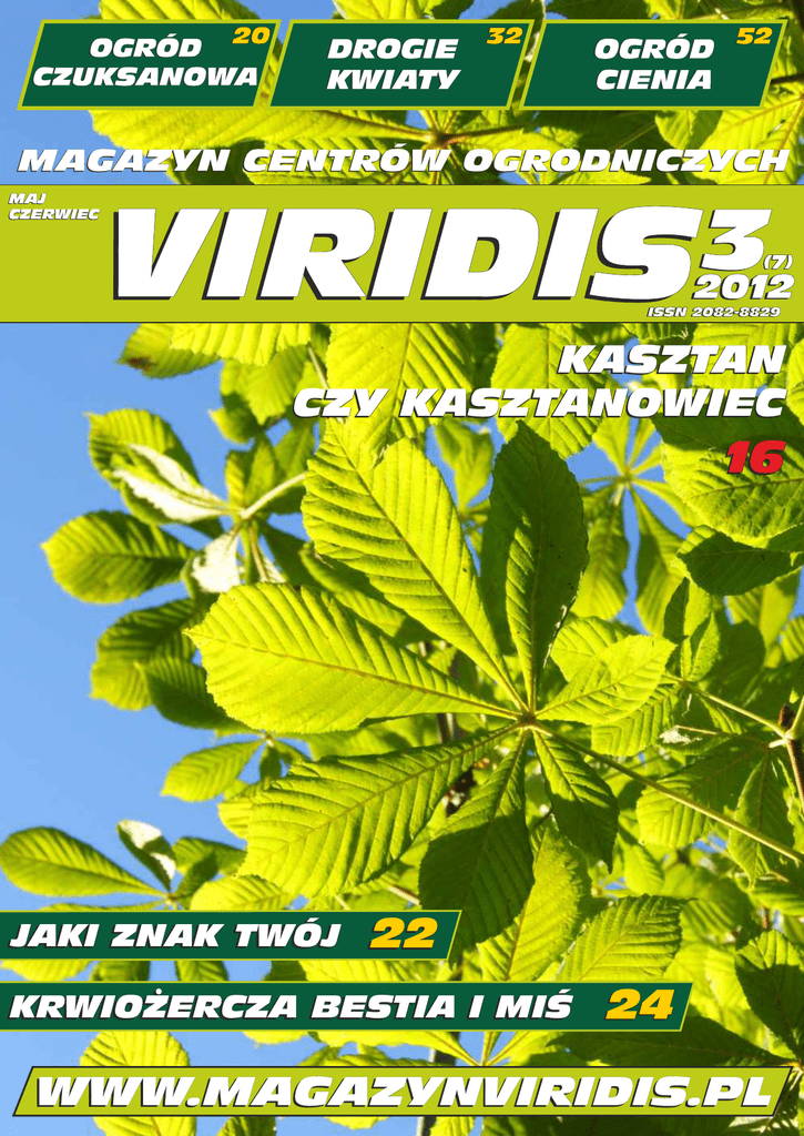 20 OGRÓD CZUKSANOWA DROGIE KWIATY 32 OGRÓD CIENIA 52 MAGAZYN CENTRÓW OGRODNICZYCH MAJ CZERWIEC 3 VIRIDIS (7) 2012 ISSN 2082-8829 KASZTAN CZY KASZTANOWIEC 16 JAKI ZNAK TWÓJ 22 KRWIOŻERCZA BESTIA I MIŚ 24 WWW.MAGAZYNVIRIDIS.PL W NUMERZE I PORADNIK SEZONOWY 4.Dwa miesiące w ogrodzie, M – jak Mech 5. Maj - czas pracy 6. Bodziszki - ozdoba ogrodu 7. Kompozycje propozycje 8. Regeneracja trawnika po okresie zimy 10. Gorzki cytrus z Azji 11. Skalniak nadal modny 12. Do swej sałatki wrzuć także bratki 13. Do ziemi z nimi ... 14. Ekologiczne sposoby zwalczania szkodników 16. Kasztan czy kasztanowiec ? II VIRIDIS METEO 18. Deszczośnieg ze śniegodeszczem 19. Towarzystwo zimnej adoracji III JAK DOBRZE MIEĆ SĄSIADA 20. Ogród Czuksanowa 22. Jaki znak twój ? 23. 17 sposobów i 5 preparatów na pozbycie się mrówek 24. Krwiożercza bestia i miś 26. Nie murem go, to bramą VIRIDIS MAGAZYN OGRODNICZY DWUMIESIĘCZNIK NAKŁAD 7000 EGZ. WYDAWCA: KROKUS UL.KAZIMIERZA WIELKIEGO 58 32-400 MYŚLENICE ADRES REDAKCJI UL.KAZIMIERZA WIELKIEGO 58 32-400 MYŚLENICE Tel. 12 372-11-01 [email protected] REDAKTOR NACZELNY TOMEK JANOW [email protected] Tel.516-034-095 REDAKTORZY KATARZYNA MARCINKIEWICZ WIESIEK CIELECKI FELIETONY Tymon Crawl OPRACOWANIE GRAFICZNE I SKŁAD JöTTE-Graphics OSOBY WSPÓŁPRACUJĄCE: Hanna i Andrzej Antoszczuk, Adam Chajęcki, Roman Berkowski, Witold Czuksanow, Jan Godyń, Teresa Góral, Jerzy Kalisiak, Kasia Kapias, Elżbieta Kocemba, Alicja Kołakowska, Stanisław Komperda, Mariusz Lewandowski, Monika Matelska-Rusin, Michał Nimiro, Piotr Nowak, Małgorzata Rosa, Wiola Szubska, Agnieszka i Radek Szymscy, Bożena Sibers, Halina Śnieżek-Wilk, Anna Smęda, Joanna Wołejszo, Maciej Wołkowicz, Sylwester Zelek, Danuta Złocka. Redakcja zastrzega sobie prawo do skracania i redagowania nadesłanych tekstów. Redakcja zastrzega sobie prawo do odmowy publikacji reklam bez podania przyczyny. IV PASIKONIK 1.Miejsce do pływania 2.Jak pomagałem tacie sadzić drzewka 3.Ognioodporna” salamandra 4.Krzyżówka V PORADY FACHOWCÓW 31. Dobre Rady Pana Romana 32. Drogie kwiaty 34. Kwiatowe hity 2012 36. W królestwie pelargonii 37.Oczko wodne nie dla oszczędnych 38. Motyle - żywe kwiaty 40. Sadzimy winorośl 41. Złoto dla zuchwałych 42. Iluzja w ogrodzie 43. Moment zamiast konia 44. Shtil - oczy zwrócone na jakość VI VIRIDIS POLECA 46. Przygotuj trawnik na mistrzostwa 47. NOWOŚCI 2012 48. Czysty i zadbany basen 49. TOP PRODUKT 50. Parkowe lekarstwa VII W OBIEKTYWIE 51. 20 lat Skalniaka 52. Ogród cienia VIII ROZRYWKA 54. Krzyżówka, Rozwiązania, Nagrody PORADNIK SEZONOWY DWA MIESIACE NIE W OGRODZIE ZAPOMNIJ Uruchamiamy oczko wodne- montujemy fontanny i pompy kaskadowe, sadzimy rośliny. Jeśli temperatura powietrza ustabilizowała się na poziomie pow. 13 stopni – zaczynamy karmienie ryb. Przeglądamy skalniak – przerzedzamy rośliny, ograniczamy rozrost. Początek wysiewu kwiatów dwuletnich na rozsadniki: dzwonki, lak, malwy, naparstnica, Na miejsce stałe siejemy dwuletnie, które nie lubią przesadzania: mak syberyjski, miesiącznicę. Sadzimy rozsady warzyw do gruntu. Sadzimy cebule kwiatów letnich. Przycinamy krzewy po kwitnieniu. Walczymy ze szkodnikami. Przyglądamy się roślinom, czy nie zaatakowały je choroby grzybowe. Siejemy do gruntu warzywa i kwiaty jednoroczne. Zwalczamy chwasty w trawniku. Sadzimy dalie i pacioreczniki. Nawozimy wrzosy, wrzośce, róże i rododendrony. Rozpoczynamy okres koszenia trawnika. Sadzimy rośliny balkonowe, ukwiecamy tarasy, balkony. Hartujemy rośliny tarasowe przechowywane w domu. Zakładamy siatki przeciw ptakom na czereśnie, borówki. Możemy sporządzać sadzonki krzewów ozdobnych (dereń,forsycja, hortensja, jaśminowiec, krzewuszka, tamaryszek, żylistek, winobluszcz). MAJ Dokonujemy selekcji zawiązków owoców na drzewach. Siejemy dwuletnie na rozsadnik – bratki, niezapominajki, stokrotki, goździki brodate. Wysiewamy poplony na miejscach po wczesnych odmianach warzyw. Uszczykujemy wierzchołki krzewów pomidora i ogórka w celu rozkrzewienia. Pielimy grządki. Od 15 czerwca zaczynamy wykopywanie cebul kwiatów wiosennych. Zakładamy siatki ochronne przeciw szpakom na drzewa czereśni, krzewy borówki (jeśli nie założyliśmy w maju). Walczymy z chwastami na grządkach. Odmładzamy zioła. Jeśli mamy w żywopłocie gniazdujące ptaki- cięcie przenosimy na sierpień. Przycinamy bukszpan. Obrywamy przekwitłe kwiatostany rododendronów. Zwalczamy glony w oczku wodnym. CZERWIEC Forte 4 M-JAK MECH Przyglądając się naszym trawnikom po zimie, w niejednym zapewne miejscu zauważymy mech. Gość niechciany i nielubiany, jednak często odwiedza nasz ogród i niestety niełatwo go wyprosić. Powodów pojawiania się mchu może być kilka, pisaliśmy o tym w nr 3/2011 („Walczymy z mchem w trawniku”), sposobów na jego pozbycie się również. Najszybszą metodą jest zastosowanie środka chemicznego, lub – lepiej – nawozu do trawnika zwalczającego mech. Rynek ogrodniczy oferuje ich wiele, a skuteczność zależy głównie od zawartości żelaza. Godny uwagi jest nawóz z serii Forte – mech. Jest to produkt zawierający najwięcej żelaza w swoim składzie, bo aż 12%. Nie spotkaliśmy na rynku nawozu o tak dużej zawartości tego pierwiastka. Oprócz walki z intruzem, dawka żelaza wzmocni źdźbła traw i korzystnie wpłynie na ich wybarwienie. Jest to istotne szczególnie wczesną wiosną. Forte mineral- mech jest nawozem szybko rozpuszczalnym, a więc szybko działającym. Efekty widoczne są już po kilkunastu godzinach od jego zastosowania i mają postać brązowych placów w miejscach, gdzie jeszcze niedawno panoszył się mech. Kiedy Forte mineral – mech spełni zadanie, przyjdzie kolej na nas. Miejsca te należy dokładnie wygrabić i uzupełnić regeneracyjną mieszanką traw. Należy pamiętać, że zastosowanie nawozu jest tylko doraźną pomocą w walce z mchem, a nie sposobem na jego definitywn