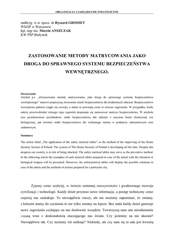 ORGANIZACJA I ZARZĄDZANIE STRATEGICZNE nadbryg. w st. spocz. dr Ryszard GROSSET WSZiP w Warszawie kpt. mgr inŜ. Marcin ANSZCZAK KW PSP Białystok ZASTOSOWANIE METODY MATRYCOWANIA JAKO DROGA DO SPRAWNEGO SYSTEMU BEZPIECZEŃSTWA WEWNĘTRZNEGO. Streszczenie Artykuł p.t. „Zastosowanie metody matrycowania, jako droga do sprawnego systemu bezpieczeństwa wewnętrznego” stanowi propozycję stworzenia siatek bezpieczeństwa dla konkretnych zdarzeń. Bezpieczeństwo wewnętrzne państwa ciągle się rozwija, a mimo to powstają coraz to nowsze zagroŜenia. W przypadku, kiedy naleŜy przeciwdziałać róŜnego typu zagroŜeń proponuje się zastosować matryce bezpieczeństwa. W artykule tym przedstawiono przykładowe siatki bezpieczeństwa dla zdarzeń z uŜyciem broni chemicznej czy biologicznej, jak równieŜ siatki bezpieczeństwa dla wybranego miasta w podejściu zdarzeniowym oraz zadaniowym. Summary The article titled „The application of the safety metrical tables” as the method of the improving of the Home Security System of Poland. The system of The Home Security of Poland is developing all the time. Despite this progress our country is at risk of being attacked. The safety metrical tables may serve as the preventive method. In the following article the examples of such metrical tables prepared in case of the attack with the chemical or biological weapon will be presented. Moreover, the safetymetrical tables will display the possible solutions in case of the attack and the methods of actions prepared for a particular city. śyjemy coraz szybciej, w świecie zmiennej rzeczywistości i gwałtownego rozwoju cywilizacji i technologii. KaŜdy dzień przynosi nowe informacje, a postęp techniczny coraz częściej nas zaskakuje. To niewątpliwie cieszy, ale nie moŜemy zapominać, Ŝe zmiany, z którymi mamy do czynienia to nie tylko zmiany na lepsze. Bez mała kaŜdy dzień generuje nowe zagroŜenia czyhające na nas dosłownie wszędzie. Towarzyszą nam one nieodmiennie i rosną wraz z doskonałością otaczającego nas świata. Czy jesteśmy na nie skazani? Niewątpliwie tak. Czy moŜemy ich uniknąć? Niekiedy, ale czy nam się to uda jest kwestią ORGANIZACJA I ZARZĄDZANIE STRATEGICZNE naszej wiedzy i umiejętności logicznego myślenia. Pewnym jest, Ŝe musimy nauczyć się Ŝycia i w miarę bezkolizyjnego „poruszania się” w świecie otaczających nas niebezpieczeństw i co nie podlega Ŝadnej dyskusji, wypracować metody kompleksowego i prostego budowania przestrzeni bezpieczeństwa wokół nas samych, naszych najbliŜszych, społeczności w której Ŝyjemy. Dysponujemy szerokim katalogiem słuŜb, inspekcji, straŜy i innych instytucji współodpowiedzialnych za budowanie i utrzymanie tej przestrzeni. Coraz szerszy katalog i specyfika zagroŜeń powoduje powstawanie nowych, nowszych i najnowszych form i sposobów odpowiedzi na nie i sposobów łagodzenia ich skutków. Jak grzyby po deszczu rosną na wszelkich poziomach społecznego zorganizowania rozmaite centra monitoringowe i koordynacyjne, obejmujące swoimi kompetencjami szeroko pojętą sferę bezpieczeństwa. To bardzo dobrze, lecz niekiedy w działaniach tych instytucji daje się zauwaŜyć brak spójności i jednolitej koordynacji. Wyzwaniem staje się zatem potrzeba stworzenia swoistej metodyki koordynacji działań w obszarze bezpieczeństwa oraz instrumentarium, które pozwoliłoby ową koordynację sprawować w spójny i kompleksowy sposób. Metodyka prowadząca do stworzenia tego instrumentarium musi być przy tym prosta, logiczna, zrozumiała dla wszystkich i na dodatek, jak to w kryzysowych czasach, niskonakładowa. Owa niskonakładowość wydaje się być w czasie ogólnoświatowego „zaciskania pasa” elementem o niebagatelnym znaczeniu. Czy w ogóle moŜliwe jest rozwiązanie tak postawionego problemu? Oczywiście i to w stosunkowo prosty sposób. Sposobem tym jest wykorzystanie tzw. matryc bezpieczeństwa. Spróbujmy wyjaśnić na czym to polega. OtóŜ w przypadku wystąpienia większości zagroŜeń, zarówno o charakterze naturalnym jak i technologicznym, warunkiem skutecznej i optymalnie przygotowanej reakcji jest sprawne, szybkie i skoordynowane działanie wielu komponentów systemu bezpieczeństwa. Ich ilość i stopień zaangaŜowania zaleŜy w wielu przypadkach od lokalizacji zdarzenia, jego rozmiarów i oczywiście charakteru. PosłuŜmy się dwoma prostymi przykładami o zupełnie odmiennych charakterach. Pierwszym niech będzie rozszczelnienie magistrali gazowej. W wariancie pierwszym magistrala rozszczelnia się na poboczu wiejskiej drogi w nisko zaludnionej miejscowości. Kogo wezwiemy na pomoc? Oczywiście pogotowie gazowe, straŜ poŜarną i policję, która zamknie ruch na odcinku drogi…. No moŜe jeszcze pogotowie energetyczne, które odetnie zasilanie do budynków znajdujących się w strefie zagroŜenia. Popatrzmy teraz na wariant drugi, to samo zdarzenie ale na ruchliwym skrzyŜowaniu duŜego miasta. W tym wypadku moŜe nam być potrzebna znacznie większa ilość komponentów budowy obszaru bezpieczeństwa. Być moŜe trzeba będzie wyłączyć zasilanie trakcji tramwajowej, być moŜe sygnalizację świetlną, a nie daj BoŜe nad skrzyŜowanie moŜe ORGANIZACJA I ZARZĄDZANIE STRATEGICZNE przebiegać linia kolejowa….. I inny z kolei przykład: zachorowanie na chorobę wysoce zakaźną. W pierwszym przypadku w domowych pieleszach i tu procedura jest jasna: lekarz pierwszego kontaktu lub pogotowie, transport na oddział zakaźny chorego i poddanie obserwacji jego najbliŜszych. A teraz to samo, ale na pokładzie samolotu. W takim przypadku jako pierwsza, wspólnie ze słuŜbą medyczną powinna zadziałać straŜ poŜarna organizując dekontaminację pasaŜerów, zaś współpasaŜerowie powinni zostać poddani obserwacji na równi z najbliŜszymi chorego. Dlaczego przytaczamy te przykłady? OtóŜ chcielibyśmy udowodnić, Ŝe w większości przypadków z jakimi „zderza” n