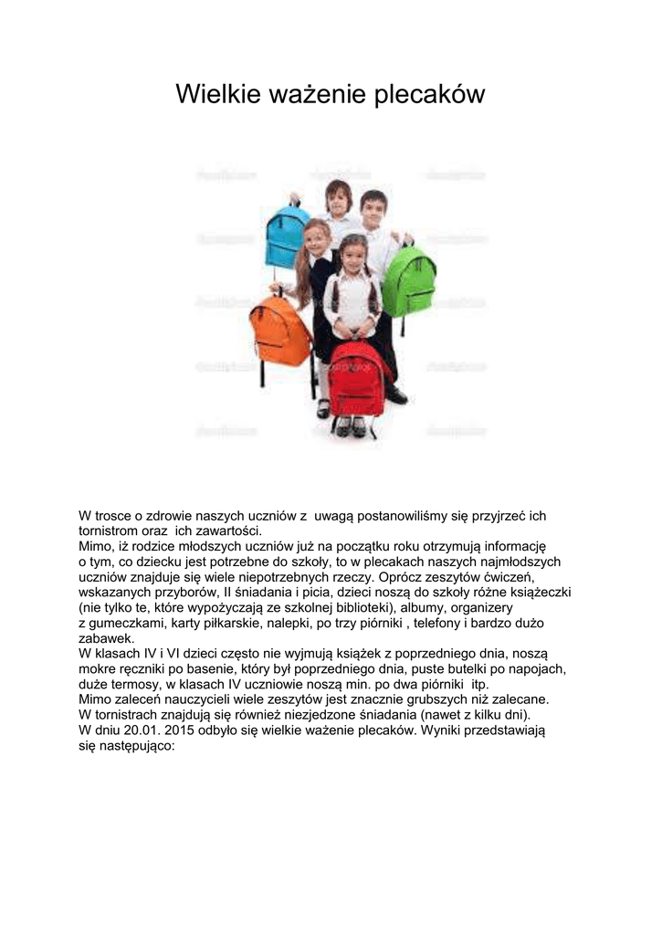 Wielkie ważenie plecaków W trosce o zdrowie naszych uczniów z uwagą postanowiliśmy się przyjrzeć ich tornistrom oraz ich zawartości. Mimo, iż rodzice młodszych uczniów już na początku roku otrzymują informację o tym, co dziecku jest potrzebne do szkoły, to w plecakach naszych najmłodszych uczniów znajduje się wiele niepotrzebnych rzeczy. Oprócz zeszytów ćwiczeń, wskazanych przyborów, II śniadania i picia, dzieci noszą do szkoły różne książeczki (nie tylko te, które wypożyczają ze szkolnej biblioteki), albumy, organizery z gumeczkami, karty piłkarskie, nalepki, po trzy piórniki , telefony i bardzo dużo zabawek. W klasach IV i VI dzieci często nie wyjmują książek z poprzedniego dnia, noszą mokre ręczniki po basenie, który był poprzedniego dnia, puste butelki po napojach, duże termosy, w klasach IV uczniowie noszą min. po dwa piórniki itp. Mimo zaleceń nauczycieli wiele zeszytów jest znacznie grubszych niż zalecane. W tornistrach znajdują się również niezjedzone śniadania (nawet z kilku dni). W dniu 20.01. 2015 odbyło się wielkie ważenie plecaków. Wyniki przedstawiają się następująco: Klasa I a sześciolatki Najlżejszy pełny: 2.7 kg Najcięższy pełny: 4.2 kg Średnia waga plecaka w przeliczeniu na jednego ucznia: 3.64 kg Klasa II b Najlżejszy pełny: 2.7 kg Najcięższy pełny: 5.8 kg Średnia waga plecaka w przeliczeniu na jednego ucznia: 4.00 kg Klasa III b Najlżejszy pełny: 2.9 kg Najcięższy pełny: 4.4 kg Średnia waga plecaka w przeliczeniu na jednego ucznia: 3.43 kg Klasa IV e Najlżejszy pełny: 4.1 kg Najcięższy pełny: 6.8 kg Średnia waga plecaka w przeliczeniu na jednego ucznia: 5.36kg Klasa IV a sportowa Najlżejszy pełny: 5.0 kg Najcięższy pełny: 8.0 kg Średnia waga plecaka w przeliczeniu na jednego ucznia: 6.45kg Klasa V a sportowa Najlżejszy pełny: 4.0 kg Najcięższy pełny: 8.0 kg Średnia waga plecaka w przeliczeniu na jednego ucznia: 6.46 kg Klasa V b Najlżejszy pełny: 4.3 kg Najcięższy pełny: 8.1 kg Średnia waga plecaka w przeliczeniu na jednego ucznia: 6.00 kg Klasa VI b Najlżejszy pełny: 2.7 kg Najcięższy pełny: 7.3 kg Średnia waga plecaka w przeliczeniu na jednego ucznia: 5.98 kg KLASY I-III : każdy uczeń ma możliwość pozostawienia w klasie wyprawki (farby, bloki, bibuły, teczki, plastelinę itp. ) oraz dodatkowych podręczniów np. ćwiczenia komputerowe, śpiewniczek. Stroje i obuwie sportowe - do pozostawienia w szafkach (zabierać tylko do prania) W klasach pierwszych uczniowie mogą zostawiać w domu podręczniki z języka angielskiego. ZAJĘCIA KOMPUTEROWE: uczniowie klas II i III zostawiają podręczniki w pracowni komputerowej. JĘZYK POLSKI: uczniowie klas IV- VI mają możliwość pozostawienia książek w sali polonistycznej WF: stroje i obuwie sportowe - do pozostawienia w szafkach (zabierać tylko do prania) PRZYRODA: uczniowie klas IV- VI mają możliwość pozostawienia podręczników w pracowni przyrody Ponadto: - uczniowie zakładają cieńsze zeszyty ( do 32 stron, w miękkiej oprawie)
