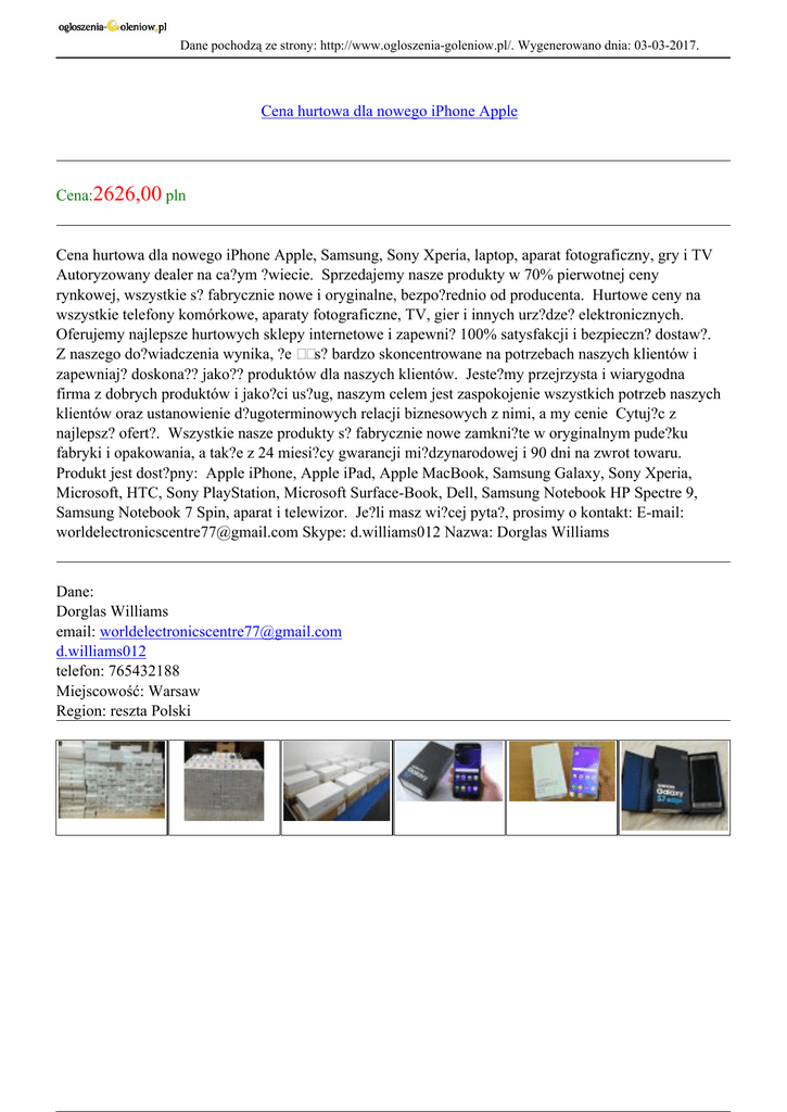 Dane pochodzą ze strony: http://www.ogloszenia-goleniow.pl/. Wygenerowano dnia: 03-03-2017. Cena hurtowa dla nowego iPhone Apple Cena:2626,00 pln Cena hurtowa dla nowego iPhone Apple, Samsung, Sony Xperia, laptop, aparat fotograficzny, gry i TV Autoryzowany dealer na ca?ym ?wiecie. Sprzedajemy nasze produkty w 70% pierwotnej ceny rynkowej, wszystkie s? fabrycznie nowe i oryginalne, bezpo?rednio od producenta. Hurtowe ceny na wszystkie telefony komórkowe, aparaty fotograficzne, TV, gier i innych urz?dze? elektronicznych. Oferujemy najlepsze hurtowych sklepy internetowe i zapewni? 100% satysfakcji i bezpieczn? dostaw?. Z naszego do?wiadczenia wynika, ?e s? bardzo skoncentrowane na potrzebach naszych klientów i zapewniaj? doskona?? jako?? produktów dla naszych klientów. Jeste?my przejrzysta i wiarygodna firma z dobrych produktów i jako?ci us?ug, naszym celem jest zaspokojenie wszystkich potrzeb naszych klientów oraz ustanowienie d?ugoterminowych relacji biznesowych z nimi, a my cenie Cytuj?c z najlepsz? ofert?. Wszystkie nasze produkty s? fabrycznie nowe zamkni?te w oryginalnym pude?ku fabryki i opakowania, a tak?e z 24 miesi?cy gwarancji mi?dzynarodowej i 90 dni na zwrot towaru. Produkt jest dost?pny: Apple iPhone, Apple iPad, Apple MacBook, Samsung Galaxy, Sony Xperia, Microsoft, HTC, Sony PlayStation, Microsoft Surface-Book, Dell, Samsung Notebook HP Spectre 9, Samsung Notebook 7 Spin, aparat i telewizor. Je?li masz wi?cej pyta?, prosimy o kontakt: E-mail: [email protected] Skype: d.williams012 Nazwa: Dorglas Williams Dane: Dorglas Williams email: [email protected] d.williams012 telefon: 765432188 Miejscowość: Warsaw Region: reszta Polski
