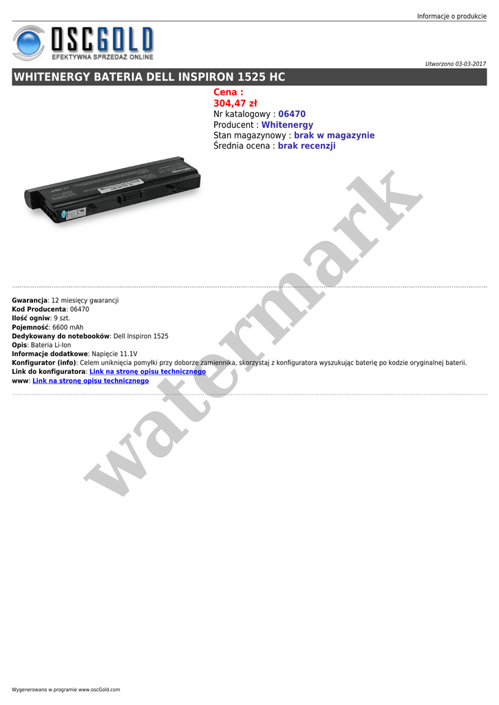 Informacje o produkcie Utworzono 03-03-2017 WHITENERGY BATERIA DELL INSPIRON 1525 HC Cena : 304,47 zł er m ar k Nr katalogowy : 06470 Producent : Whitenergy Stan magazynowy : brak w magazynie Średnia ocena : brak recenzji w at Gwarancja: 12 miesięcy gwarancji Kod Producenta: 06470 Ilość ogniw: 9 szt. Pojemność: 6600 mAh Dedykowany do notebooków: Dell Inspiron 1525 Opis: Bateria Li-Ion Informacje dodatkowe: Napięcie 11.1V Konfigurator (info): Celem uniknięcia pomyłki przy doborze zamiennika, skorzystaj z konfiguratora wyszukując baterię po kodzie oryginalnej baterii. Link do konfiguratora: Link na stronę opisu technicznego www: Link na stronę opisu technicznego Wygenerowano w programie www.oscGold.com