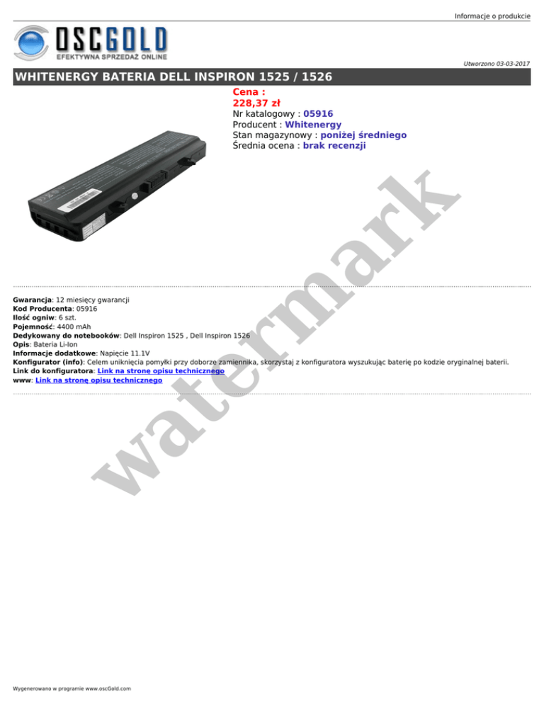 Informacje o produkcie Utworzono 03-03-2017 WHITENERGY BATERIA DELL INSPIRON 1525 / 1526 Cena : 228,37 zł er m ar k Nr katalogowy : 05916 Producent : Whitenergy Stan magazynowy : poniżej średniego Średnia ocena : brak recenzji w at Gwarancja: 12 miesięcy gwarancji Kod Producenta: 05916 Ilość ogniw: 6 szt. Pojemność: 4400 mAh Dedykowany do notebooków: Dell Inspiron 1525 , Dell Inspiron 1526 Opis: Bateria Li-Ion Informacje dodatkowe: Napięcie 11.1V Konfigurator (info): Celem uniknięcia pomyłki przy doborze zamiennika, skorzystaj z konfiguratora wyszukując baterię po kodzie oryginalnej baterii. Link do konfiguratora: Link na stronę opisu technicznego www: Link na stronę opisu technicznego Wygenerowano w programie www.oscGold.com