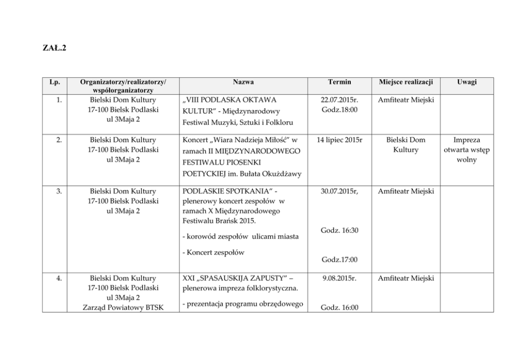 ZAŁ.2 Lp. 1. 2. Organizatorzy/realizatorzy/ współorganizatorzy Bielski Dom Kultury 17-100 Bielsk Podlaski ul 3Maja 2 Bielski Dom Kultury 17-100 Bielsk Podlaski ul 3Maja 2 Nazwa „VIII PODLASKA OKTAWA KULTUR” - Międzynarodowy Termin Miejsce realizacji 22.07.2015r. Godz.18:00 Amfiteatr Miejski 14 lipiec 2015r Bielski Dom Kultury 30.07.2015r, Amfiteatr Miejski Festiwal Muzyki, Sztuki i Folkloru Koncert „Wiara Nadzieja Miłość” w ramach II MIĘDZYNARODOWEGO FESTIWALU PIOSENKI POETYCKIEJ im. Bułata Okużdżawy 3. Bielski Dom Kultury 17-100 Bielsk Podlaski ul 3Maja 2 PODLASKIE SPOTKANIA” plenerowy koncert zespołów w ramach X Międzynarodowego Festiwalu Brańsk 2015. - korowód zespołów ulicami miasta Godz. 16:30 - Koncert zespołów Godz.17:00 4. Bielski Dom Kultury 17-100 Bielsk Podlaski ul 3Maja 2 Zarząd Powiatowy BTSK Uwagi XXI „SPASAUSKIJA ZAPUSTY” – plenerowa impreza folklorystyczna. - prezentacja programu obrzędowego 9.08.2015r. Godz. 16:00 Amfiteatr Miejski Impreza otwarta wstęp wolny przez zespół teatralny „Antrakt” - udział zespołów z Podlasia, z Białorusi i zespołów Bielskiego Domu Kultury 5. Bielski Dom Kultury 17-100 Bielsk Podlaski ul 3Maja 2 Półkolonie profilaktyczne dla dzieci „OPOWIEŚCI MOICH DZIADKÓW”. 1. Warsztaty teatralne Wprowadzenie do historii lokalnej, poszukiwanie ciekawych opowieści rodzinnych wplecionych w wydarzenia historyczne miasta itp. 2. Warsztaty plastyczne – „Dizajn na ludowo” – działania inspirowane tkactwem, wycinanką, i zdobnictwem architektury drewnianej. 3. Warsztaty muzyczne odbywać się będą z wykorzystaniem „Wielkiego Śpiewnika” Agnieszki Osieckie, „Złotej Księgi pieśni polskich” Zbigniewa Arjańskiego i pieśni ludowych Podlasia. 4. Zajęcia poznawcze, historyczne, 3 – 14.08.2015r. Godz. 8:00 – 16:00 Bielski Dom Kultury Grupa 25 osób w wieku 8-13 lat rekreacyjne. 5. Program profilaktyczny. 6. Bielski Dom Kultury 17-100 Bielsk Podlaski ul 3Maja 2 Rodzinne Ogrody Działkowe „POŻEGNANIE LATA” Festyn „PELARGONIA 2015” 29.08.2015r. Godz. 12:00 Amfiteatr Miejski Lipiec – sierpień Bielski Dom Kultury - wystawy, konkursy, - występy zespołów ludowych, - prezentacje dziecięcych zespołów tanecznych, - koncerty zaproszonych zespołów - Teatr FALKO SHOW i warsztaty teatralne dla młodzieży 7. Bielski Dom Kultury 17-100 Bielsk Podlaski ul 3Maja 2 Koło Wędkarskie „SUM” Konkurs fotograficzny dla dzieci i młodzieży szkół podstawowych i gimnazjów pn. „FAUNA I FLORA WÓD PODLASIA” Składanie prac od 24.08 do 21.09.2015 w BDK
