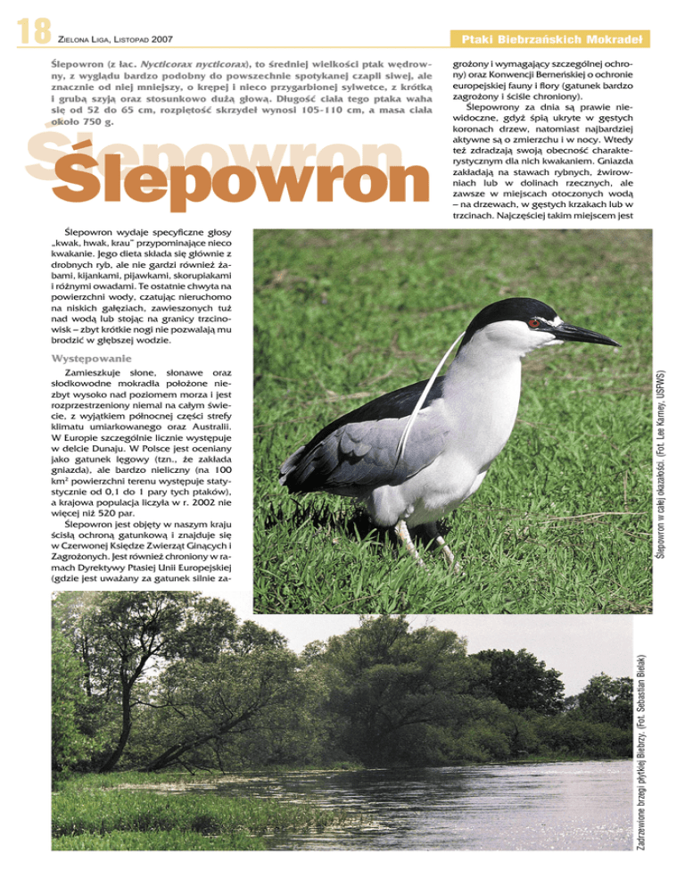18 ZIELONA LIGA, LISTOPAD 2007 Ślepowron (z łac. Nycticorax nycticorax), to średniej wielkości ptak wędrowny, z wyglądu bardzo podobny do powszechnie spotykanej czapli siwej, ale znacznie od niej mniejszy, o krępej i nieco przygarbionej sylwetce, z krótką i grubą szyją oraz stosunkowo dużą głową. Długość ciała tego ptaka waha się od 52 do 65 cm, rozpiętość skrzydeł wynosi 105-110 cm, a masa ciała około 750 g. Ślepowron Ślepowron Ptaki Biebrzañskich Mokrade³ grożony i wymagający szczególnej ochrony) oraz Konwencji Berneńskiej o ochronie europejskiej fauny i flory (gatunek bardzo zagrożony i ściśle chroniony). Ślepowrony za dnia są prawie niewidoczne, gdyż śpią ukryte w gęstych koronach drzew, natomiast najbardziej aktywne są o zmierzchu i w nocy. Wtedy też zdradzają swoją obecność charakterystycznym dla nich kwakaniem. Gniazda zakładają na stawach rybnych, żwirowniach lub w dolinach rzecznych, ale zawsze w miejscach otoczonych wodą – na drzewach, w gęstych krzakach lub w trzcinach. Najczęściej takim miejscem jest Ślepowron wydaje specyficzne głosy „kwak, hwak, krau” przypominające nieco kwakanie. Jego dieta składa się głównie z drobnych ryb, ale nie gardzi również żabami, kijankami, pijawkami, skorupiakami i różnymi owadami. Te ostatnie chwyta na powierzchni wody, czatując nieruchomo na niskich gałęziach, zawieszonych tuż nad wodą lub stojąc na granicy trzcinowisk – zbyt krótkie nogi nie pozwalają mu brodzić w głębszej wodzie. Występowanie Zadrzewione brzegi płytkiej Biebrzy. (Fot. Sebastian Bielak) Ślepowron w całej okazałości. (Fot. Lee Karney, USFWS) Zamieszkuje słone, słonawe oraz słodkowodne mokradła położone niezbyt wysoko nad poziomem morza i jest rozprzestrzeniony niemal na całym świecie, z wyjątkiem północnej części strefy klimatu umiarkowanego oraz Australii. W Europie szczególnie licznie występuje w delcie Dunaju. W Polsce jest oceniany jako gatunek lęgowy (tzn., że zakłada gniazda), ale bardzo nieliczny (na 100 km2 powierzchni terenu występuje statystycznie od 0,1 do 1 pary tych ptaków), a krajowa populacja liczyła w r. 2002 nie więcej niż 520 par. Ślepowron jest objęty w naszym kraju ścisłą ochroną gatunkową i znajduje się w Czerwonej Księdze Zwierząt Ginących i Zagrożonych. Jest również chroniony w ramach Dyrektywy Ptasiej Unii Europejskiej (gdzie jest uważany za gatunek silnie za- Ptaki Biebrzañskich Mokrade³ Ślepowron wypatrujący zdobyczy. (Fot. Steve Farell, USFWS) ZIELONA LIGA, LISTOPAD 2007 19 jej partner donosi gałęzie. W okresie od kwietnia do lipca samica składa w gnieździe od 2 do 5 bladoniebieskich jaj. Po wykluciu pisklęta pozostają w pobliżu gniazda przez ok. 20 dni, w czasie których opiekują się nimi oboje rodzice. Młode ślepowrony uzyskują samodzielność po upływie 42 dni, a w trakcie ich karmienia rodzice znacznie częściej niż zazwyczaj polują za dnia. Ślepowrony wychowują tylko jedno pokolenie potomstwa w ciągu roku. Ślepowrony w Polsce W Polsce ślepowrony pojawiają się rzadko w czasie przelotów, najczęściej na południu kraju, a gniazda zakładają sporadycznie – nawet na terenie Biebrzańskiego Parku Narodowego, uważanego powszechnie za ptasi raj, nie stwierdzono dotychczas gniazd ślepowrona, choć bez wątpienia jest on tutaj obecny. Przylatują do nas w kwietniu lub maju i widywane są wtedy pojedynczo, a spotykane ptaki to najczęściej osobniki niedojrzałe. Po okresie lęgowym znacznie łatwiej jest spotkać samotnego ślepowrona, a nawet niewielką grupę ptaków liczącą kilkanaście sztuk. zadrzewiona wyspa, rzadziej brzeg rzeki. Ślepowrony gniazdują w koloniach, a na jednym drzewie może być stłoczonych nawet do 30 gniazd. Poza sezonem lęgowym żyją samotnie lub w małych grupach. Rzadko kiedy jednak ptaki te przebywają wspólnie z innymi czaplami, a jeżeli nawet sąsiadują z nimi w koronach drzew, to wówczas izolują się i tworzą własną kolonię. Ślepowron w zimowej aurze. (USFWS) Gniazdowanie Portret ślepowrona. (Fot. Lee Karney, USFWS) Ślepowrony z jednej kolonii nie przystępują do lęgów w tym samym czasie, lecz w nieregularnych odstępach, dzięki czemu presja ptaków na najbliższe środowisko jest rozłożona i nie ma zagrożenia, że w bezpośrednim otoczeniu gniazd zabraknie pożywienia dla piskląt. Samo gniazdo przypomina bezładną platformę o średnicy 30-40 cm, powstałą z nagromadzenia w jednym miejscu gałązek oraz łodyg trzcin. Jego budowę rozpoczyna samiec, a kończy samica, podczas gdy Ptaki te zasadniczo nie zimują w Polsce, a jedyny stwierdzony do tej pory taki przypadek miał miejsce w styczniu 1990 roku, kiedy to k. Poznania widziano dorosłego ptaka. Podczas gdy w zachodniej Europie obecność ślepowronów jest zagrożona, w Polsce ptaki te mają się coraz lepiej, a najlepszym tego dowodem jest fakt, iż od lat 80. XX wieku zwiększa się systematycznie ilość ptaków przystępujących do lęgów. W latach 80. stwierdzono w naszym kraju obecność jedynie 20-25 par ślepowronów, w latach 90. było ich już około 100 par, a w roku 2002 aż 520 par! Zdecydowana większość gniazd znajduje się w dolinie górnej Wisły. SEBASTIAN BIELAK Zdjęcia (USFWS) zostały udostępnione dzięki uprzejmości United States Fish and Wildlife Service