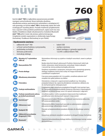 Garmin nüvi® 760 to najbardziej zaawansowany produkt nawigacji samochodowej. Nowa stylistyka obudowy, wbudowana antena, panoramiczny wyświetlacz o przekątnej 4,3 cala sprawiają, że Garmin nüvi® 760 to doskonały wybór dla osób oczekujących wysokiej jakości. Posiada możliwość projektowania tras z użyciem wielu punktów przelotowych, zapisu tych tras oraz śladów. Dodatkowo dzięki wbudowanemu modułowi Bluetooth nüvi® 760 pełnić może rolę zestawu głośnomówiącego. Urządzenie zostało wyposażone w doskonałą mapę Europy Zachodniej i Środkowo-Wschodniej (w tym Polski). Opakowanie zawiera: t odbiornik nüvi® 760 t uchwyt samochodowy z przyssawką t podstawkę na kokpit t skórzany pokrowiec t instrukcję obsługi 4.3” t t t DOSTAWCY MAP: kabel USB zasilacz sieciowy kabel zasilający z gniazda zapalniczki 12/24V z odbiornikiem TMC Wyraźny 4,3” wyświetlacz (400 cd) Wyświetlane informacje są czytelne w każdych warunkach, nawet w pełnym słońcu Baza punktów POI Bardzo duża ilość danych adresowych Punktów Użytecznych takich jak: hotele, restauracje, stacje benzynowe, autousługi, miejsca zakupów i rozrywki itp. tworzy podręczną książkę adresową Prosta obsługa Dotykowy wyświetlacz i przejrzyste, intuicyjne menu gwarantują sprawną obsługę urządzenia nawet przez osoby nie mające doświadczeń z podobnymi urządzeniami Wbudowany akumulator Czas pracy poza pojazdem do 5-ciu godzin, umożliwia zabranie nüvi® wszędzie tam gdzie jedziesz czy idziesz Fotoradary Ostrzeżenia o miejscach z ograniczeniami prędkości np.: fotoradary, przejazdy kolejowe itp. zapewnią dźwiękowe ostrzeżenia o zbliżaniu się do stref potencjalnie niebezpiecznych 5 hrs Automotive 760 Niniejsza publikacja podlega ochronie prawa autorskiego przysługującego „K. Grzegorczyk i B. Górnik EXCEL Systemy Nawigacyjne” Spółka Jawna będącej oficjalnym Dystrybutorem w Polsce odbiorników do nawigacji satelitarnej marki GARMIN. Autor publikacji: Konrad Adamek, Michał Berner nüvi Przeglądarka zdjęć umożliwia przeglądanie fotografii z kart pamięci typu SD. Opcjonalny przewodnik podróży dostarczy informacji o interesujących obiektach na terenie Europy, wraz z ich opisem tekstowym i zdjęciami. Funkcja wyszukiwania adresu po kodach pocztowych Umożliwia szybkie i trafne wyszukanie miejscowości bez możliwości pomyłki przy wielu identycznych nazwach miejscowości GarminLock™ Zabezpieczenie kodem PIN, blokuje możliwość uruchomienia odbiornika GPS przez powołane osoby Odtwarzacz mp3 Odtwarzanie plików muzycznych pozwala na wykorzystanie urządzenia jako przenośnego odtwarzacza muzyki Nadajnik FM Pozwala na bezprzewodowe przesłanie dźwięku do dowolnego systemu Audio Odbiornik komunikatów drogowych (TMC) Gwarantuje ominięcie wszystkich utrudnień na drogach Europy Zachodniej Bluetooth® Zapewnia bezprzewodową obsługę telefonu komórkowego tworząc zestaw głośnomówiący nüvi 760 nüvi Funkcje multimedialne Automotive Cechy fizyczne Wymiary urządzenia, SZER x WYS x GŁĘB: 12.2 x 7.6 x 2.0 cm Wymiary wyświetlacza, SZER x WYS: 9.7 x 5.7 cm, przekątna 4.3 cala (10.9 cm) Rozdzielczość wyświetlacza, SZER x WYS: 480 x 272 pikseli Typ wyświetlacza: dotykowy, kolorowy WQVGA TFT z powłoką antyrefleksyjną i białym podświetleniem Waga: 176 g Bateria: wbudowany akumulator litowo-jonowy Czas pracy na baterii: do 5 godzin Wodoszczelność: Brak, IPX0 Moduł GPS wysokiej czułości: Tak, SiRF Star III (SiRF Instant Fix II) Złącze anteny zewnętrznej: Tak, MCX Porty I/O: 1 x USB Antena wbudowana: Tak, typu quad-helix Mapy i Pamięć Niniejsza publikacja podlega ochronie prawa autorskiego przysługującego „K. Grzegorczyk i B. Górnik EXCEL Systemy Nawigacyjne” Spółka Jawna będącej oficjalnym Dystrybutorem w Polsce odbiorników do nawigacji satelitarnej marki GARMIN. Autor publikacji: Konrad Adamek, Michał Berner Mapa bazowa: Tak, Atlantic Routable Mapy zainstalowane fabrycznie: Tak, City Navigator Europe Możliwość instalacji map dodatkowych: Tak, w pamięci wewnętrznej lub na kartach SD Pamięć wbudowana: 1,85 GB Slot kart pamięci: Tak, SD Pamięć waypointów: 500 punktów Trasy: 10 z wieloma punktami pośrednimi Cechy funkcjonalne Komunikaty głosowe: Tak (poprzez wbudowany głośnik, złącze audio lub nadajnik FM) Wymawianie nazw ulic: Tak Widok mapy w perspektywie (3D): Tak Konfiguracja ilości i zawartości pól danych na ekranie mapy: Nie Automatyczne porządkowanie kolejności punktów pośrednich (optymalizacja trasy): Tak Automatyczna rekalkulacja trasy (po zjechaniu z wytyczonej trasy lub z użyciem opcji objazd): Tak Ustawienia typu trasy (najkrótsza, najszybsza, bezdroże): Tak Ustawienia unikania (unikanie autostrad, dróg płatnych, itp.): Tak Definicja własnych obiektów unikanych: Nie Rejestracja śladu podróży: Tak Obsługa baz własnych punktów POI: Tak, import z plików CSV lub GPX z użyciem oprogramowania POI Loader Alarm punktów niebezpiecznych / fotoradarów: Tak, wymaga instalacji własnych POI Alarmy dźwiękowe: Tak Moduł Bluetooth® do współpracy z telefonem komórkowym: Tak Obsługa komunikatów drogowych TMC: Tak, z zewnętrznym odbiornikiem GTM Odtwarzacz MP3: Tak Odtwarzacz książek mówionych: Tak Przewodnik podróżny: Tak (opcjonalnie) Przewodnik językowy: Tak (opcjonalnie) Przeglądarka zdjęć: Tak Konfigurowalne ikony pojazdu (prezentujące aktualną pozycję na mapie):: Tak Funkcja czas na świecie, przelicznik walut i jednostek, kalkulator: Tak Ekran dotykowy: Tak Automatyczna regulacja jasności ekranu: Nie Pilot zdalnego sterowania: Nie Nadajnik FM: Tak Złącze słuchawkowe / liniowe wyjście dźwięku: Tak Wejście video: Nie Obsługa kamery wstecznej: Nie Nawigacja inercyjna: Nie Zabezpieczenie antykradzieżowe Garmin Lock™: Tak Gotowy do pracy na motocyklu:: Nie Inne: Połączenie z PC odbywa się w trybie pamięci masowej, stąd urządzenie jest kompatybilne z system