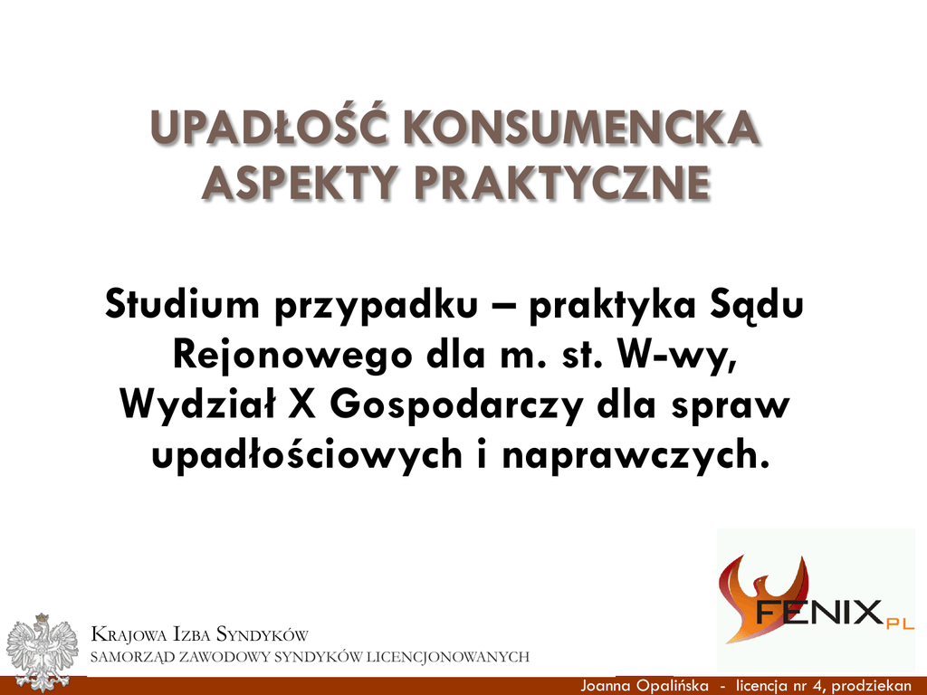 UPADŁOŚĆ KONSUMENCKA ASPEKTY PRAKTYCZNE Studium przypadku – praktyka Sądu Rejonowego dla m. st. W-wy, Wydział X Gospodarczy dla spraw upadłościowych i naprawczych. KRAJOWA YNDYKÓW RAJOWA IZBA ZBA SYNDYKÓW SAMORZĄD SAMORZĄD ZAWODOWY ZAWODOWY SYNDYKÓW SYNDYKÓW LICENCJONOWANYCH LICENCJONOWANYCH Joanna Opalińska - licencja nr 4, prodziekan UPADŁOŚĆ KONSUMENCKA – ASPEKTY PRAKTYCZNE SŁOWO WSTĘPNE Postępowanie upadłościowe wobec osób fizycznych nieprowadzących działalności gospodarczej uregulowane są w tytule V ustawy – Prawo upadłościowe i naprawcze – art. 491¹ Puin i nast. Postępowanie upadłościowe konsumenta dzieli się na trzy zasadnicze fazy: Postępowanie w przedmiocie ogłoszenia upadłości Postępowanie upadłościowe właściwe Okres wykonywania przez upadłego planu spłat wierzycieli Dwie pierwsze fazy są typowe dla wszystkich postępowań upadłościowych, trzecia jest specyficzna wyłącznie dla upadłości konsumenckiej. KRAJOWA RAJOWA IZBA ZBA SYNDYKÓW YNDYKÓW SAMORZĄD SAMORZĄD ZAWODOWY ZAWODOWY SYNDYKÓW SYNDYKÓW LICENCJONOWANYCH LICENCJONOWANYCH Joanna Opalińska - licencja nr 4, prodziekan UPADŁOŚĆ KONSUMENCKA – ASPEKTY PRAKTYCZNE Stan faktyczny sprawy prowadzonej przez warszawski sąd upadłościowy Konsumentka – osoba samotnie wychowująca dziecko w wieku szkolnym jest poręczycielem pożyczki dewizowej, niezabezpieczonej rzeczowo. Firma – pożyczkobiorca przestała funkcjonować, osoby odpowiadające za jej zobowiązania zniknęły, tak, jak pozostali poręczyciele. Poręczycielka została jedyną osobą, z jakiej bank mógł prowadzić egzekucję. Po wszczęciu egzekucji komorniczej konsumentka złożyła w 2005 roku do Banku propozycję zawarcia ugody, nie została ona jednak nigdy rozpatrzona, nie została udzielona jej żadna pisemna odpowiedź. KRAJOWA RAJOWA IZBA ZBA SYNDYKÓW YNDYKÓW SAMORZĄD SAMORZĄD ZAWODOWY ZAWODOWY SYNDYKÓW SYNDYKÓW LICENCJONOWANYCH LICENCJONOWANYCH Joanna Opalińska - licencja nr 4, prodziekan UPADŁOŚĆ KONSUMENCKA – ASPEKTY PRAKTYCZNE Stan faktyczny sprawy prowadzonej przez warszawski sąd upadłościowy Konsumentka zajmowała mieszkanie komunalne. Z uwagi na odzyskanie kamienicy przez byłych właścicieli, czynsz, jaki musiała płacić za najem mieszkania – drastycznie wzrósł do poziomu, w jakim nie mogła już go obsługiwać. Aby pokryć czynsz wysprzedała część wyposażenia mieszkania. Jedynym majątkiem podlegającym egzekucji były uzyskiwane przez nią dochody z tytułu umowy o pracę. Dochody te były nieco powyżej przeciętnego poziomu wynagrodzeń, zmienne, uzależnione od wysokości otrzymanej premii. KRAJOWA RAJOWA IZBA ZBA SYNDYKÓW YNDYKÓW SAMORZĄD SAMORZĄD ZAWODOWY ZAWODOWY SYNDYKÓW SYNDYKÓW LICENCJONOWANYCH LICENCJONOWANYCH Joanna Opalińska - licencja nr 4, prodziekan UPADŁOŚĆ KONSUMENCKA – ASPEKTY PRAKTYCZNE Stan faktyczny sprawy prowadzonej przez warszawski sąd upadłościowy Pozostałe (poza długiem wobec Banku) zadłużenie tej osoby było nieznaczne – wynikały z bieżących kosztów utrzymania mieszkania. Jedynym i podstawowym celem, dla którego konsumentka złożyła wniosek o upadłość była chęć oddłużenia się w stosunku do Banku. Dłużniczka nie potrafiła precyzyjnie określić, jaka jest aktualna wysokość tego zadłużenia, nie posiadała nawet kopii bankowego tytułu egzekucyjnego (BTE), a jedynie korespondencję, jaką prowadziła z Bankiem. Korespondencja potwierdzała istnienie długu, co do zasady, ale nie pozwalała na określenie wysokości zobowiązania. KRAJOWA RAJOWA IZBA ZBA SYNDYKÓW YNDYKÓW SAMORZĄD SAMORZĄD ZAWODOWY ZAWODOWY SYNDYKÓW SYNDYKÓW LICENCJONOWANYCH LICENCJONOWANYCH Joanna Opalińska - licencja nr 4, prodziekan UPADŁOŚĆ KONSUMENCKA – ASPEKTY PRAKTYCZNE Przebieg postępowania upadłościowego Trudności z określeniem wysokości zobowiązań konsumentki, brak woli wierzycieli, aby zgłosić wierzytelność w postępowaniu upadłościowym Likwidacja masy upadłości była niezwykle prosta – obejmowała wyłącznie dochody z tytułu umowy o pracę i nadpłaty podatku dochodowego od osób fizycznych, jakie wpływały na rachunek bankowy upadłej. Żadnego innego majątku podlegającego egzekucji dłużniczka nie posiadała. Syndyk sporządził listę wierzytelności i dwie listy uzupełniające obejmujące łącznie trzech wierzycieli. Wszyscy wierzyciele zostali zaliczeni do tych samych kategorii wg art. 342 ust. 1 Puin – do kategorii IV i częściowo V (starsze odsetki). Nikt nie zgłosił sprzeciwu do ustalonych list wierzytelności. KRAJOWA RAJOWA IZBA ZBA SYNDYKÓW YNDYKÓW SAMORZĄD SAMORZĄD ZAWODOWY ZAWODOWY SYNDYKÓW SYNDYKÓW LICENCJONOWANYCH LICENCJONOWANYCH Joanna Opalińska - licencja nr 4, prodziekan UPADŁOŚĆ KONSUMENCKA – ASPEKTY PRAKTYCZNE Przebieg postępowania upadłościowego Po zatwierdzeniu ostatniej listy wierzytelności, syndyk sporządził plan podziału funduszów masy upadłości, a następnie dokonał podziału funduszów masy upadłości dla wierzycieli kategorii IV. Do podziału przypadła kwota 28.200 zł, co pozwoliło na zaspokojenie roszczeń wierzycieli w kategorii IV - w 5,71%. Po sporządzeniu planu podziału funduszów masy, dłużniczka złożyła wniosek o ustalenie planu spłat. Dłużniczka zaproponowała, że będzie spłacała swoich wierzycieli przez trzy lata w ratach wynoszących miesięcznie 300 zł, a kwota ta będzie podzielona proporcjonalnie pomiędzy wierzycieli, stosunkowo do wysokości przypadających im należności. Została wyznaczona rozprawa w przedmiocie ustalenia planu spłat. Zarzuty wierzycieli. KRAJOWA RAJOWA IZBA ZBA SYNDYKÓW YNDYKÓW SAMORZĄD SAMORZĄD ZAWODOWY ZAWODOWY SYNDYKÓW SYNDYKÓW LICENCJONOWANYCH LICENCJONOWANYCH Joanna Opalińska - licencja nr 4, prodziekan UPADŁOŚĆ KONSUMENCKA – ASPEKTY PRAKTYCZNE Przebieg postępowania upadłościowego Orzeczenie sądu upadłościowego o ustaleniu: Wierzycieli