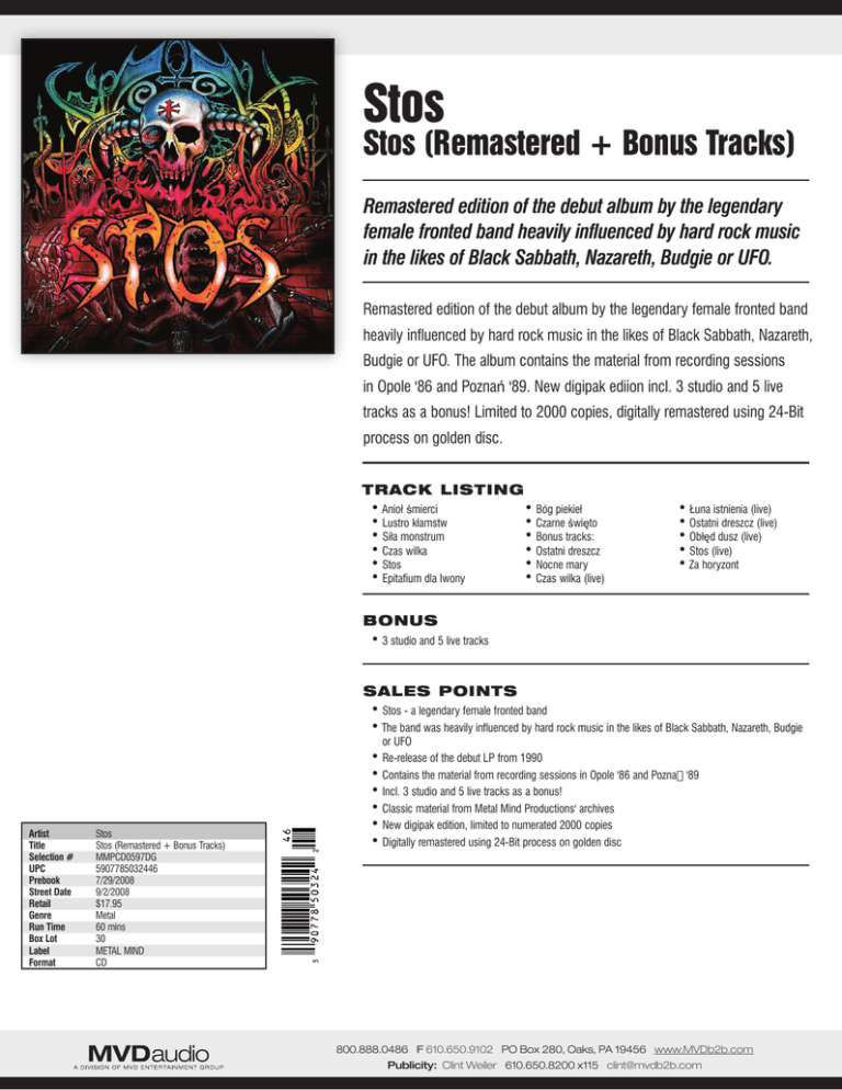 Stos Stos (Remastered + Bonus Tracks) Remastered edition of the debut album by the legendary female fronted band heavily influenced by hard rock music in the likes of Black Sabbath, Nazareth, Budgie or UFO. Remastered edition of the debut album by the legendary female fronted band heavily influenced by hard rock music in the likes of Black Sabbath, Nazareth, Budgie or UFO. The album contains the material from recording sessions in Opole '86 and Poznań '89. New digipak ediion incl. 3 studio and 5 live tracks as a bonus! Limited to 2000 copies, digitally remastered using 24-Bit process on golden disc. TRACK LISTING •Anioł śmierci •Lustro kłamstw •Siła monstrum •Czas wilka •Stos •Epitafium dla Iwony •Bóg piekieł •Czarne święto •Bonus tracks: •Ostatni dreszcz •Nocne mary •Czas wilka (live) •Łuna istnienia (live) •Ostatni dreszcz (live) •Obłęd dusz (live) •Stos (live) •Za horyzont BONUS •3 studio and 5 live tracks Sales Points •Stos - a legendary female fronted band •The band was heavily influenced by hard rock music in the likes of Black Sabbath, Nazareth, Budgie or UFO Artist Title Selection # UPC Prebook Street Date Retail Genre Run Time Box Lot Label Format Stos Stos (Remastered + Bonus Tracks) MMPCD0597DG 5907785032446 7/29/2008 9/2/2008 $17.95 Metal 60 mins 30 METAL MIND CD •Re-release of the debut LP from 1990 •Contains the material from recording sessions in Opole '86 and Poznań '89 •Incl. 3 studio and 5 live tracks as a bonus! •Classic material from Metal Mind Productions' archives •New digipak edition, limited to numerated 2000 copies •Digitally remastered using 24-Bit process on golden disc 800.888.0486 F 610.650.9102 PO Box 280, Oaks, PA 19456 www.MVDb2b.com Publicity: Clint Weiler 610.650.8200 x115 [email protected]