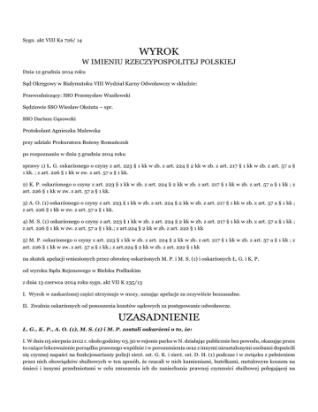 Sygn. akt VIII Ka 726/ 14 WYROK W IMIENIU RZECZYPOSPOLITEJ POLSKIEJ Dnia 12 grudnia 2014 roku Sąd Okręgowy w Białymstoku VIII Wydział Karny Odwoławczy w składzie: Przewodniczący: SSO Przemysław Wasilewski Sędziowie SSO Wiesław Oksiuta – spr. SSO Dariusz Gąsowski Protokolant Agnieszka Malewska przy udziale Prokuratora Bożeny Romańczuk po rozpoznaniu w dniu 5 grudnia 2014 roku sprawy 1) Ł. G. oskarżonego o czyny z art. 223 § 1 kk w zb. z art. 224 § 2 kk w zb. z art. 217 § 1 kk w zb. z art. 57 a § 1 kk. ; z art. 226 § 1 kk w zw. z art. 57 a § 1 kk. 2) K. P. oskarżonego o czyny z art. 223 § 1 kk w zb. z art. 224 § 2 kk w zb. z art. 217 § 1 kk w zb. z art. 57 a § 1 kk ; z art. 226 § 1 kk w zw. z art. 57 a § 1 kk. 3) A. O. (1) oskarżonego o czyny z art. 223 § 1 kk w zb. z art. 224 § 2 kk w zb. z art. 217 § 1 kk w zb. z art. 57 a § 1 kk ; z art. 226 § 1 kk w zw. z art. 57 a § 1 kk. 4) M. S. (1) oskarżonego o czyny z art. 223 § 1 kk w zb. z art. 224 § 2 kk w zb. z art. 217 § 1 kk w zb. z art. 57 a § 1 kk ; z art. 226 § 1 kk w zw. z art. 57 a § 1 kk.; z art.224 § 2 kk w zb. z art. 222 § 1 kk 5) M. P. oskarżonego o czyny z art. 223 § 1 kk w zb. z art. 224 § 2 kk w zb. z art. 217 § 1 kk w zb. z art. 57 a § 1 kk ; z art. 226 § 1 kk w zw. z art. 57 a § 1 kk.; z art.224 § 2 kk w zb. z art. 222 § 1 kk na skutek apelacji wniesionych przez obrońcę oskarżonych M. P. i M. S. (1) i oskarżonych Ł. G. i K. P. od wyroku Sądu Rejonowego w Bielsku Podlaskim z dnia 13 czerwca 2014 roku sygn. akt VII K 235/13 I. Wyrok w zaskarżonej części utrzymuje w mocy, uznając apelacje za oczywiście bezzasadne. II. Zwalnia oskarżonych od ponoszenia kosztów sądowych za postępowanie odwoławcze. UZASADNIENIE Ł. G., K. P., A. O. (1), M. S. (1) i M. P. zostali oskarżeni o to, że: I. W dniu 05 sierpnia 2012 r. około godziny 03.30 w rejonie parku w N. działając publicznie bez powodu, okazując przez to rażące lekceważenie porządku prawnego wspólnie i w porozumieniu oraz z innymi nieustalonymi osobami dopuścili się czynnej napaści na funkcjonariuszy policji sierż. szt. G. K. i sierż. szt. D. H. (1) podczas i w związku z pełnieniem przez nich obowiązków służbowych w ten sposób, że rzucali w nich kamieniami, butelkami, metalowym koszem na śmieci i innymi przedmiotami w celu zmuszenia ich do zaniechania prawnej czynności służbowej polegającej na legitymowaniu w związku z ujawnionym wykroczeniem spożywania alkoholu w miejscu publicznym przy czym w wyniku zdarzenia funkcjonariusz G. K. doznał obrażeń w postaci bolesności uciskowej miejsca pomiędzy stopą a podudziem prawej nogi a D. H. (1) doznał bolesności uciskowej łydki lewej nogi tj. o czyn z art. 223 § 1 kk w zb. z art. 224 § 2 kk w zb. z art. 217 § 1 kk w zb. z art. 57a § 1 kk II. W dniu 5 sierpnia 2012 r. około godziny 3:30 w rejonie parku w N. działając publicznie bez powodu okazując przez to rażące lekceważenie porządku prawnego wspólnie i w porozumieniu oraz z innymi nieustalonymi osobami znieważyli funkcjonariuszy policji sierż. szt. G. K. i sierż. szt. D. H. (1), podczas wykonywania przez nich obowiązków służbowych związanych z podjętą przez w/w interwencją w ten sposób, że wyzywał ich słowami powszechnie uznanymi za obelżywe tj. o czyn z art. 226 § 1 kk w zw. z art. 57a §1 kk nadto M. S. (1) oskarżony o to, że: III. W dniu 5 sierpnia 2012 r. około godz. 4:20 w N. przy ul. (...) w rejonie Szkoły Podstawowej w celu zmuszenia funkcjonariusza Policji, st. post. D. D. do zaniechania prawnej czynności służbowej w postaci jego zatrzymania stosował wobec niego przemoc w ten sposób, że złapał za mundur czym naruszył jego nietykalność cielesną tj. o czyn z art. 224 § 2 kk w zb. z art. 222 § 1 kk nadto M. P. oskarżony o to, że: IV. W dniu 05 sierpnia 2012 r. około godz. 4:20 w N. przy ul. (...) w rejonie Szkoły Podstawowej w celu zmuszenia funkcjonariusza Policji post. T. M. do zaniechania prawnej czynności służbowej w postaci jego zatrzymania stosował wobec niego przemoc w ten sposób, że złapał za ręce, czym naruszył jego nietykalność cielesną tj. o czyn z art. 224 § 2 kk w zb. z art. 222 § 1 kk Sąd Rejonowy w Bielsku Podlaskim wyrokiem z dnia 13 czerwca 2014 r w sprawie VII K 235/13; I. Oskarżonych Ł. G., K. P., A. O. (1), M. S. (1) i M. P. w ramach czynu opisanego w pkt. I uznał za winnych tego, że w dniu 05 sierpnia 2012 r. około godziny 03.30, w rejonie parku w N., działając publicznie i bez powodu, okazując przez to rażące lekceważenie porządku prawnego, wspólnie i w porozumieniu oraz z Ł. D. i innymi nieustalonymi osobami, dopuścili się czynnej napaści na funkcjonariuszy policji sierż. szt. G. K. i sierż. szt. D. H. (1) podczas i w związku z pełnieniem przez nich obowiązków służbowych w ten sposób, że stosując przemoc celem zmuszenia ich do zaniechania prawnej czynności służbowej związanej z podjętą interwencją, w związku ze spożywaniem alkoholu w miejscu publicznym, przyjęli agresywną postawę demonstrującą natychmiastową gotowość do ataku i usiłowali otoczyć policjantów oraz zaatakować ich pięściami, a nadto rzucali w nich kamieniami, butelkami, metalowymi koszami na śmieci i innymi przedmiotami, zmierzając do wywołania u pokrzywdzonych krzywdy fizycznej, przy czym w wyniku zdarzenia funkcjonariusz G. K. doznał obrażeń w postaci bolesności uciskowej miejsca pomiędzy stopą a podudziem prawej nogi a D. H. (1) doznał bolesności uciskowej łydki lewej nogi tj. czynu z art. 223 § 1 kk w zb. z art. 224 § 2 kk w zw. z art. 57a § 1 kk i za to na mocy art. 223 § 1 kk w zb. z art. 224 § 2 kk w zw. z art. 11 § 2 kk w zw. z art. 57a § 1 kk skazał każdego z nich, zaś na mocy art. 223 § 1 kk w zw. z art. 11 § 3 kk w zw. z art. 57a § 1 kk wymierzył każdemu z nich karę 1 (jednego) roku i 6 (sześciu) miesięcy pozbawienia wolności. II. Oskar