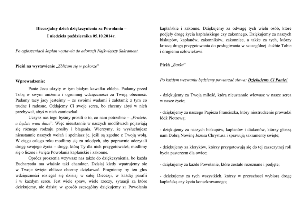 Po ogłoszeniach kapłan wystawia do adoracji Najświętszy Sakrament. kapłańskie i zakonne. Dziękujemy za odwagę tych wielu osób, które podjęły drogę życia kapłańskiego czy zakonnego. Dziękujemy za naszych biskupów, kapłanów, zakonników, zakonnice, a także za tych, którzy kroczą drogą przygotowania do posługiwania w szczególnej służbie Tobie i drugiemu człowiekowi. Pieśń na wystawienie „Zbliżam się w pokorze” Pieśń „Barka” Wprowadzenie: Po każdym wezwaniu będziemy powtarzać słowa: Dziękujemy Ci Panie! Diecezjalny dzień dziękczynienia za Powołania – I niedziela października 05.10.2014r. Panie Jezu ukryty w tym białym kawałku chleba. Padamy przed Tobą w swym uniżeniu i ogromnej wdzięczności za Twoją obecność. Padamy tacy jacy jesteśmy – ze swoimi wadami i zaletami; z tym co trudne i radosne. Oddajemy Ci swoje serca, bo chcemy abyś w nich przebywał, abyś w nich zamieszkał. Uczysz nas tego byśmy prosili o to, co nam potrzebne – „Proście, a będzie wam dane”. Więc nieustannie w naszych modlitwach pojawiają się różnego rodzaju prośby i błagania. Wierzymy, że wysłuchujesz nieustannie naszych wołań i spełniasz je, jeśli są zgodne z Twoją wolą. W ciągu całego roku modlimy się za młodych, aby poprawnie odczytali drogę swojego życia – drogę, którą Ty dla nich przygotowałeś; modlimy się o liczne i święte Powołania kapłańskie i zakonne. Oprócz proszenia wzywasz nas także do dziękczynienia, bo każda Eucharystia ma właśnie taki charakter. Dzisiaj kiedy wpatrujemy się w Twoje święte oblicze chcemy dziękować. Pragniemy by ten głos wdzięczności rozlegał się dzisiaj w całej Diecezji, w każdej parafii i w każdym sercu. Jest wiele spraw, wiele rzeczy, sytuacji za które dziękujemy, ale dzisiaj w sposób szczególny dziękujemy za Powołania - dziękujemy za Twoją miłość, którą nieustannie wlewasz w nasze serca w nasze życie; - dziękujemy za naszego Papieża Franciszka, który niestrudzenie prowadzi łódź Piotrową; - dziękujemy za naszych biskupów, kapłanów i diakonów, którzy głoszą nam Dobrą Nowinę Jezusa Chrystusa i sprawują sakramenty święte; - dziękujemy za kleryków, którzy przygotowują się do tej zaszczytnej roli bycia pasterzem dla owiec; - dziękujemy za każde Powołanie, które zostało rozeznane i podjęte; - dziękujemy za tych wszystkich, którzy w przyszłości wybiorą drogę kapłańską czy życia konsekrowanego; - dziękujemy za to, że nieustannie wysłuchujesz naszych próśb i powołujesz robotników na swoje żniwo; - dziękujemy za tych ośmiu braci, którzy w tym roku rozpoczęli formację do kapłaństwa w naszym Elbląskim Seminarium; - dziękujemy za każde inicjatywy, które pomagają młodym ludziom w odkrywaniu swojego Powołania; - dziękujemy za nasze Elbląskie Seminarium, które przygotowuje młodych mężczyzn do posługi kapłańskiej. Modlitwa końcowa: Panie Jezu, przyjmij nasze dziękczynienia i nie pozwól nam nigdy zwątpić w Twoją miłość i Twoje działanie. Który żyjesz i królujesz z Bogiem Ojcem w jedności Ducha Świętego, Bóg przez wszystkie wieki wieków. Pieśń na repozycję „Przed tak wielkim Sakramentem” Błogosławieństwo i repozycja Pieśń „Idźcie na cały świat”