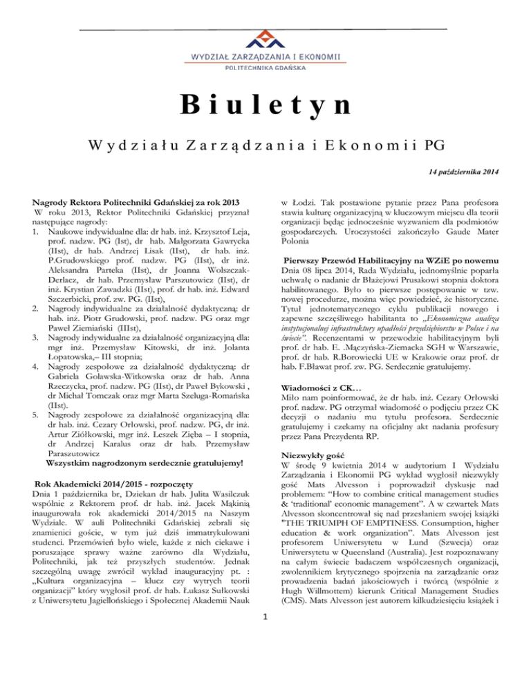 Biuletyn W y d z i a ł u Z a r z ą d z a n i a i E k o n o m i i PG 14 października 2014 Nagrody Rektora Politechniki Gdańskiej za rok 2013 W roku 2013, Rektor Politechniki Gdańskiej przyznał następujące nagrody: 1. Naukowe indywidualne dla: dr hab. inż. Krzysztof Leja, prof. nadzw. PG (Ist), dr hab. Małgorzata Gawrycka (IIst), dr hab. Andrzej Lisak (IIst), dr hab. inż. P.Grudowskiego prof. nadzw. PG (IIst), dr inż. Aleksandra Parteka (IIst), dr Joanna WolszczakDerlacz, dr hab. Przemysław Parszutowicz (IIst), dr inż. Krystian Zawadzki (IIst), prof. dr hab. inż. Edward Szczerbicki, prof. zw. PG. (IIst), 2. Nagrody indywidualne za działalność dydaktyczną: dr hab. inż. Piotr Grudowski, prof. nadzw. PG oraz mgr Paweł Ziemiański (IIIst), 3. Nagrody indywidualne za działalność organizacyjną dla: mgr inż. Przemysław Kitowski, dr inż. Jolanta Łopatowska,– III stopnia; 4. Nagrody zespołowe za działalność dydaktyczną: dr Gabriela Golawska-Witkowska oraz dr hab. Anna Rzeczycka, prof. nadzw. PG (IIst), dr Paweł Bykowski , dr Michał Tomczak oraz mgr Marta Szeluga-Romańska (IIst). 5. Nagrody zespołowe za działalność organizacyjną dla: dr hab. inż. Cezary Orłowski, prof. nadzw. PG, dr inż. Artur Ziółkowski, mgr inż. Leszek Zięba – I stopnia, dr Andrzej Karalus oraz dr hab. Przemysław Paraszutowicz Wszystkim nagrodzonym serdecznie gratulujemy! w Łodzi. Tak postawione pytanie przez Pana profesora stawia kulturę organizacyjną w kluczowym miejscu dla teorii organizacji będąc jednocześnie wyzwaniem dla podmiotów gospodarczych. Uroczystości zakończyło Gaude Mater Polonia Pierwszy Przewód Habilitacyjny na WZiE po nowemu Dnia 08 lipca 2014, Rada Wydziału, jednomyślnie poparła uchwałę o nadanie dr Błażejowi Prusakowi stopnia doktora habilitowanego. Było to pierwsze postępowanie w tzw. nowej procedurze, można więc powiedzieć, że historyczne. Tytuł jednotematycznego cyklu publikacji nowego i zapewne szczęśliwego habilitanta to „Ekonomiczna analiza instytucjonalnej infrastruktury upadłości przedsiębiorstw w Polsce i na świecie”. Recenzentami w przewodzie habilitacyjnym byli prof. dr hab. E. .Mączyńska-Ziemacka SGH w Warszawie, prof. dr hab. R.Borowiecki UE w Krakowie oraz prof. dr hab. F.Bławat prof. zw. PG. Serdecznie gratulujemy. Wiadomości z CK… Miło nam poinformować, że dr hab. inż. Cezary Orłowski prof. nadzw. PG otrzymał wiadomość o podjęciu przez CK decyzji o nadaniu mu tytułu profesora. Serdecznie gratulujemy i czekamy na oficjalny akt nadania profesury przez Pana Prezydenta RP. Niezwykły gość W środę 9 kwietnia 2014 w audytorium I Wydziału Zarządzania i Ekonomii PG wykład wygłosił niezwykły gość Mats Alvesson i poprowadził dyskusje nad problemem: “How to combine critical management studies & ‘traditional’ economic management”. A w czwartek Mats Alvesson skoncentrował się nad przesłaniem swojej książki "THE TRIUMPH OF EMPTINESS. Consumption, higher education & work organization”. Mats Alvesson jest profesorem Uniwersytetu w Lund (Szwecja) oraz Uniwersytetu w Queensland (Australia). Jest rozpoznawany na całym świecie badaczem współczesnych organizacji, zwolennikiem krytycznego spojrzenia na zarządzanie oraz prowadzenia badań jakościowych i twórcą (wspólnie z Hugh Willmottem) kierunk Critical Management Studies (CMS). Mats Alvesson jest autorem kilkudziesięciu książek i Rok Akademicki 2014/2015 - rozpoczęty Dnia 1 października br, Dziekan dr hab. Julita Wasilczuk wspólnie z Rektorem prof. dr hab. inż. Jacek Mąkinią inaugurowała rok akademicki 2014/2015 na Naszym Wydziale. W auli Politechniki Gdańskiej zebrali się znamienici goście, w tym już dziś immatrykulowani studenci. Przemówień było wiele, każde z nich ciekawe i poruszające sprawy ważne zarówno dla Wydziału, Politechniki, jak też przyszłych studentów. Jednak szczególną uwagę zwrócił wykład inauguracyjny pt. : „Kultura organizacyjna – klucz czy wytrych teorii organizacji” który wygłosił prof. dr hab. Łukasz Sułkowski z Uniwersytetu Jagiellońskiego i Społecznej Akademii Nauk 1 artykułów naukowych dotyczących zawiłości organizacyjnych – kultury organizacyjnej, problemów w zarządzaniu, tożsamości w organizacjach, gender, zmian organizacyjnych, konsultingu. Jego najnowsza książka ‘The Triumph of Emptiness’ (‘Triumf pustki’), wydana w 2013 roku, krytycznie przedstawia współczesny świat i istniejące w nim organizacje. Mats Alvesson twierdzi, że organizacje bardzo często składają się z wyolbrzymionych fasad, za którymi niewiele treści się znajduje – mania wielkości, nastawienie na ilość zamiast na jakość to, Jego zdaniem, nasza rzeczywistość. „Gdy informowałem znajomych o wizycie profesora Matsa Alvessona, słyszałem często pytanie: jak Wam udało się Go zaprosić?” mówił dr hab. Krzysztof Leja prof. nadzw. PG. Jeden z profesorów młodszej generacji (jest ich w Polsce coraz więcej!), który miał okazji zetknąć się z twórczością Alvessona stwierdził: „to naprawdę łebski gość”. „Alvesson podczas pobytu miał program pełen wrażeń: szwedzki film niemy ze ścieżką dźwiękową w wykonaniu krakowskiego zespołu UDA, wykład w (niezaplanowanych) ciemnościach wydziałowego audytorium z udziałem zainteresowanych nie tylko Trójmiasta, ale z Krakowa, Poznania, Warszawy a nawet Sheffield i wreszcie seminarium domowe, podczas którego była okazja bliższej rozmowy z naszym Gościem. Myśli, które przekazał były głębokie, odległe od codziennego, powierzchownego oglądu świata i otaczającej nas rzeczywistości, nie tylko tej uczelnianej. Jego najnowsza książka „The triumph of emptiness”, którą sam uważa za najważniejszą w swojej twórczości, pokazuje wyraziście, że bałwochwalstwo polityków, ale i zwykłych ludzi, wszechobecna w organizacjach gra o sumie zerowej, a także triumf imagolog