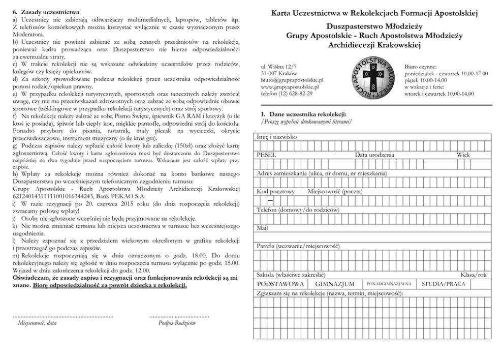 6. Zasady uczestnictwa a) Uczestnicy nie zabierają odtwarzaczy multimedialnych, laptopów, tabletów itp. Z telefonów komórkowych można korzystać wyłącznie w czasie wyznaczonym przez Moderatora. b) Uczestnicy nie powinni zabierać ze sobą cennych przedmiotów na rekolekcje, ponieważ kadra prowadząca oraz Duszpasterstwo nie bierze odpowiedzialności za ewentualne straty. c) W trakcie rekolekcji nie są wskazane odwiedziny uczestników przez rodziców, kolegów czy księży opiekunów. d) Za szkody spowodowane podczas rekolekcji przez uczestnika odpowiedzialność ponosi rodzic/opiekun prawny. e) W przypadku rekolekcji turystycznych, sportowych oraz tanecznych należy zwrócić uwagę, czy nie ma przeciwskazań zdrowotnych oraz zabrać ze sobą odpowiednie obuwie sportowe (trekkingowe w przypadku rekolekcji turystycznych) oraz strój sportowy. f) Na rekolekcje należy zabrać ze sobą Pismo Święte, śpiewnik GA RAM i krzyżyk (o ile ktoś je posiada), śpiwór lub ciepły koc, miękkie pantofle, odpowiedni strój do kościoła. Ponadto przybory do pisania, notatnik, mały plecak na wycieczki, okrycie przeciwdeszczowe, instrument muzyczny (o ile ktoś gra). g) Podczas zapisów należy wpłacić całość kwoty lub zaliczkę (150zł) oraz złożyć kartę zgłoszeniową. Całość kwoty i karta zgłoszeniowa musi być dostarczona do Duszpasterstwa najpóźniej na dwa tygodnie przed rozpoczęciem turnusu. Wskazane jest całość wpłaty przy zapisie. h) Wpłaty za rekolekcje można również dokonać na konto bankowe naszego Duszpasterstwa po wcześniejszym telefonicznym uzgodnieniu turnusu: Grupy Apostolskie - Ruch Apostolstwa Młodzieży Archidiecezji Krakowskiej 62124014311111001016344243, Bank PEKAO S.A. i) W razie rezygnacji po 20. czerwca 2015 roku (do dnia rozpoczęcia rekolekcji) zwracamy połowę wpłaty! j) Osoby nie zgłoszone wcześniej nie będą przyjmowane na rekolekcje. k) Nie można zmieniać terminu lub miejsca uczestnictwa w turnusie bez wcześniejszego uzgodnienia. l) Należy zapoznać się z przedziałem wiekowym określonym w grafiku rekolekcji i przestrzegać go podczas zapisów. m) Rekolekcje rozpoczynają się w dniu oznaczonym o godz. 18.00. Do domu rekolekcyjnego należy się zgłosić w dniu rozpoczęcia turnusu wyłącznie po godz. 15.00. Wyjazd w dniu zakończenia rekolekcji do godz. 12.00. Oświadczam, że zasady zapisu i rezygnacji oraz funkcjonowania rekolekcji są mi znane. Biorę odpowiedzialność za powrót dziecka z rekolekcji. ................................................................ Miejscowość, data ...................................... Podpis Rodziców Karta Uczestnictwa w Rekolekcjach Formacji Apostolskiej Duszpasterstwo Młodzieży Grupy Apostolskie - Ruch Apostolstwa Młodzieży Archidiecezji Krakowskiej ul. Wiślna 12/7 31-007 Kraków [email protected] www.grupyapostolskie.pl telefon (12) 628-82-29 Biuro czynne: poniedziałek - czwartek 10.00-17.00 piątek 10.00-14.00 w wakacje i ferie: wtorek i czwartek 10.00-14.00 1. Dane uczestnika rekolekcji: /Proszę wypełnić drukowanymi literami/ Imię i nazwisko PESEL Data urodzenia Wiek Adres zamieszkania (ulica, nr domu, nr mieszkania) Kod pocztowy Miejscowość (poczta) Telefon (domowy/do rodziców) Mail Parafia (wezwanie/miejscowość) Szkoła (właściwe zakreślić) PONADGIMNAZJALNA PODSTAWOWA GIMNAZJUM Zgłaszam się na rekolekcje (nazwa, termin, miejscowość): Klasa/rok STUDIA/PRACA 2. Informacja rodziców o zdrowiu dziecka oraz zgoda na wyjazd na rekolekcje.1 a) Oświadczam, że na czas Rekolekcji Formacji Apostolskiej zlecam opiekę nad moim dzieckiem wychowawcom skierowanym przez Duszpasterstwo Młodzieży. Równocześnie oświadczam, że zgadzam się na jego wyjazd na Rekolekcje. Informuję, że dziecko może przebywać w zmienionych warunkach klimatycznych. b) Uwagi o stanie zdrowia 2 uczelnie/alergie (na co?) TAK NIE ....................................................................................................................................... ....................................................................................................................................... padaczka TAK NIE choroba lokomocyjna TAK NIE astma TAK NIE ADHD TAK NIE cukrzyca TAK NIE autyzm TAK NIE inne choroby przewlekłe lub zaburzenia:.................................................................... ............................................................................................................................................ ............................................................................................................................................ ............................................................................................................................................ Czy dziecko przyjmuje jakieś stałe leki? Jeśli tak to jakie i w jakich dawkach? Specjalne zalecenia lekarzy:........................................................................................... ............................................................................................................................................ ............................................................................................................................................ c) Podałem/am wszystkie znane mi informacje o dziecku, które mogą pomóc w zapewnieniu właściwej opieki nad dzieckiem na rekolekcjach. Wyrażam zgodę na przetwarzanie danych osobowych do celów Duszpasterstwa Młodzieży. d) Informację, które podaje są zgodne ze stanem rzeczywistym. W przypadku zatajenia informacji o stanie zdrowia dziecka Moderator ma prawo zażądać, aby rodzice odebrali dziecko z rekolekcji. 4. Formacja w Parafii. /Wypełnia Ksiądz z Parafii/ ................................................................ w terminie:................................................................ Miejscowość, data ...................................... 1 2 Dotyczy osób nie