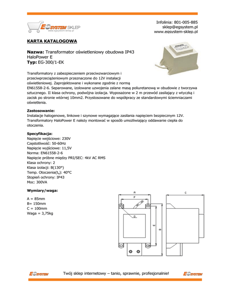 Infolinia: 801-005-885 [email protected] www.egsystem-sklep.pl KARTA KATALOGOWA Nazwa: Transformator oświetleniowy obudowa IP43 HaloPower E Typ: EG-300/1-EK Transformatory z zabezpieczeniem przeciwzwarciowym i przeciwprzeciążeniowym przeznaczone do 12V instalacji oświetleniowej. Zaprojektowane i wykonane zgodnie z normą EN61558-2-6. Separowane, izolowane uzwojenia zalane masą poliuretanową w obudowie z tworzywa sztucznego. II klasa ochrony, podwójna izolacja. Wyposażone w 2 m przewód zasilający z wtyczką i zacisk po stronie wtórnej 10mm2. Przystosowane do współpracy ze standardowymi ściemniaczami oświetlenia. Zastosowanie: Instalacje halogenowe, linkowe i szynowe wymagające zasilania napięciem bezpiecznym 12V. Transformatory HaloPower E należy montować w sposób umożliwiający oddawanie ciepła do otoczenia. Specyfikacja: Napięcie wejściowe: 230V Częstotliwość: 50-60Hz Napięcie wyjściowe: 11,5V Norma: EN61558-2-6 Napięcie próbne między PRI/SEC: 4kV AC RMS Klasa ochrony: 2 Klasa izolacji: B(130°) Temp. Otoczenia(ta): 40°C Stopień ochrony: IP43 Moc: 300VA Wymiary/waga: A = 85mm B= 150mm C = 100mm Waga = 3,75kg Twój sklep internetowy – tanio, sprawnie, profesjonalnie! Infolinia: 801-005-885 [email protected] www.egsystem-sklep.pl Układ połączeń: Program standardowy: Napięcie SEC: 11,5V Prąd SEC: 25,0A Moc: 300VA Zabezpieczenie: PTC Twój sklep internetowy – tanio, sprawnie, profesjonalnie!