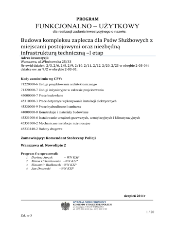 PROGRAM FUNKCJONALNO – UŻYTKOWY dla realizacji zadania inwestycyjnego o nazwie: Budowa kompleksu zaplecza dla Psów Służbowych z miejscami postojowymi oraz niezbędną infrastrukturą techniczną –I etap Adres inwestycji: Warszawa, ul.Włochowska 25/33 Nr ewid działek: 2/3, 2/6, 2/8, 2/9, 2/10, 2/11, 2/12, 2/20, 2/23 w obrębie 2-03-04 i działce ew. nr 9/2 w obrębie 2-03-01. Kody zamówienia wg CPV: 71220000-6 Usługi projektowania architektonicznego 71320000-7 Usługi inżynieryjne w zakresie projektowania 45000000-7 Prace budowlane 45310000-3 Prace dotyczące wykonywania instalacji elektrycznych 45330000-9 Prace hydrauliczne i sanitarne 44000000-0 Konstrukcje i materiały budowlane 45331000-6 Instalowanie urządzeń grzewczych, wentylacyjnych i klimatyzacyjnych 45351000-2 Mechaniczne instalacje inżynieryjne 45233140-2 Roboty drogowe Zamawiający: Komendant Stołeczny Policji Warszawa ul. Nowolipie 2 Program f-u opracowali: 1. Dariusz Jurzyk – WN KSP 2. Maria Urbankowska –WN KSP 3. Sławomir Białkowski –WN KSP 4. Jan Dmowski –WN KSP sierpień 2011r WYDZIAŁ NIERUCHOMOŚCI KOMENDY STOŁECZNEJ POLICJI ul. Nowolipie 2, 00-150 WARSZAWA tel. (022) 603 66 29, fax. (022) 603 74 92 1 / 20 Zał. nr 3 BUDOWA KOMPLEKSU ZAPLECZA DLA PSÓW SŁUŻBOWYCH WARSZAWA-SZCZĘŚLIWICE, UL. WŁOCHOWSKA 25/33 1. Strona tytułowa 2. Spis zawartości Programu Funkcjonalno – Użytkowego 3. Część opisowa 3.1. Opis ogólny przedmiotu zamówienia 3.1.1. Opis stanu istniejącego 3.1.2. Zakres realizacji 3.1.3. Planowane do uzyskania efekty rzeczowe 3.2. Wytyczne do projektowania i wykonawstwa 3.2.1. Wytyczne techniczne do projektowania i wykonawstwa 3.2.1.1. Zespół kojców dla psów służbowych 3.2.1.2. Zaplecze gospodarcze 3.2.1.3. Budynek izolatek dla psów 3.2.1.4. Wybiegi trawiaste 3.2.1.5. Tor przeszkód 3.2.1.6. Teren trawiasty do ćwiczeń 3.2.1.7. Miejsca postojowe 3.2.1.8. Drogi i chodniki 3.2.1.9 Ogrodzenia 3.2.1.10. Infrastruktura 3.2.2. Wytyczne materiałowe do projektowania i wykonawstwa 3.2.2.1. Branża budowlana 3.2.2.2. Branża sanitarna 3.2.2.3. Branża elektryczna 3.2.3. Wymagania w zakresie projektowania i wykonawstwa 3.2.3.1. Wymagania dotyczące zakresu opracowania dokumentacji projektowej 3.2.3.2. Wymagania dla formy opracowania dokumentacji projektowej: 3.2.3.3. Wymagania w zakresie wykonawstwa 4. Część informacyjna Zał.I: Oświadczenie o posiadanym prawie do dysponowania nieruchomością na cele budowlane Rys.II: Kojec – rzut przyziemia, elewacje Rys.III: Zestaw kontenerowy –przyziemie; stan projektowany Rys.IV: Zestaw kontenerowy – stan projektowany (nowy kontener) Rys.V: Izolatki dla psów –widok Rys.VI: Izolatki dla psów –elewacje Rys.VII: Izolatki dla psów –przekroje i elewacje Rys.VIII: Izolatki dla psów –Rzuty przyziemia i dachu Rys.IX: Plan zagospodarowania terenu – sytuacja ( skala rysunku nie zgodna z opisem na rys.) WYDZIAŁ NIERUCHOMOŚCI KOMENDY STOŁECZNEJ POLICJI ul. Nowolipie 2, 00-150 WARSZAWA tel. (022) 603 66 29, fax. (022) 603 74 92 2 / 20 Zał. nr 3 BUDOWA KOMPLEKSU ZAPLECZA DLA PSÓW SŁUŻBOWYCH WARSZAWA-SZCZĘŚLIWICE, UL. WŁOCHOWSKA 25/33 3. Część opisowa 3.1. Opis ogólny przedmiotu zamówienia 3.1.1. Opis stanu istniejącego Obszar przeznaczony na lokalizację przedsięwzięcia znajduje się w północnej części terenu będącego własnością Skarbu Państwa w zarządzie Komendy Stołecznej Policji. Od strony północno-zachodniej obszar przeznaczony pod budowę kompleksu zaplecza dla psów służbowych ograniczony jest wałem ziemnym (wzdłuż granicy działki), od północno-wschodniej sąsiaduje z budynkami magazynowymi (12A i 12B) oraz kotłownią lokalną, południowo-wschodnia granica przebiega wzdłuż drogi wewnętrznej oddzielającej od budynków biurowych 7A i 7C oraz kompleksu parkingowowarsztatowego, natomiast od strony południowo-zachodniej pozostaje terenu niezagospodarowany przeznaczony wg poprzedniego planu zagospodarowania pod zaplecze dla plutonu policji konnej. Na wydzielonym pod zaplecze dla psów służbowych obszarze o powierzchni ok. 14 800 m2 znajduje się wiata z kojcami dla kilku psów służbowych, która obecnie nie jest użytkowana zgodnie z przeznaczeniem a docelowo zostanie rozebrana. 3.1.2. Zakres realizacji W ramach I etap ww. przedsięwzięcia zrealizowane zostaną: - wykonanie dokumentacji projektowej dotyczącej planowanej inwestycji - przygotowanie terenu budowy, w tym rozebranie: - wiaty z kojcami i ogrodzeniem; -kanalizacji w zakresie kolidującym z planowaną inwestycją; - cztery zespoły po 15 kojców z budami – łącznie dla 60 psów; - zaplecze gospodarczego jako zestaw kontenerów; - budynek izolatek dla chorych psów; - sześć wybiegów trawiastych; - tor przeszkód; - otwarty teren trawiasty do ćwiczeń; - osiemnaście miejsc postojowych dla samochodów; - drogi i chodniki jako układ komunikacji wewnętrznej na terenie zaplecza; - ogrodzenia tzn. ogrodzenie zewnętrzne całego obszaru oraz ogrodzenia wewnętrzne wydzielające wyodrębnione funkcjonalnie fragmenty terenu; - infrastruktura niezbędna dla funkcjonowania zaplecza tzn. - uzbrojenie podziemne: kanalizacja sanitarna i deszczowa, sieć wodociągowa, sieć cieplna, sieć energetyczna, instalacja elektryczna i teletechniczna ; WYDZIAŁ NIERUCHOMOŚCI KOMENDY STOŁECZNEJ POLICJI ul. Nowolipie 2, 00-150 WARSZAWA tel. (022) 603 66 29, fax. (022) 603 74 92 3 / 20 Zał. nr 3 BUDOWA KOMPLEKSU ZAPLECZA DLA PSÓW SŁUŻBOWYCH WARSZAWA-SZCZĘŚLIWICE, UL. WŁOCHOWSKA 25/33 - uzbrojenie naziemne terenu: oświetlenie, mała architektura, instalacja odgromowa, teletechniczna i przeciwpożarowa. 3.1.1. Planowane do uzyskania efekty rzeczowe 1. Powierzchnia użytkowa 2. Powierzchnia zabudowy 3. Powierzchnie Kontenery gospodarcze 53,6 Izolatki dla psów 75,63 Kojce dla psów 520,8 ∑ 650,03 Do rozebrania: Stare kojce – obecnie 80 magazyny Kontenery gospodarcze 65 Izolatki dla psów 101 Kojce dla psów 742,9 ∑ 90