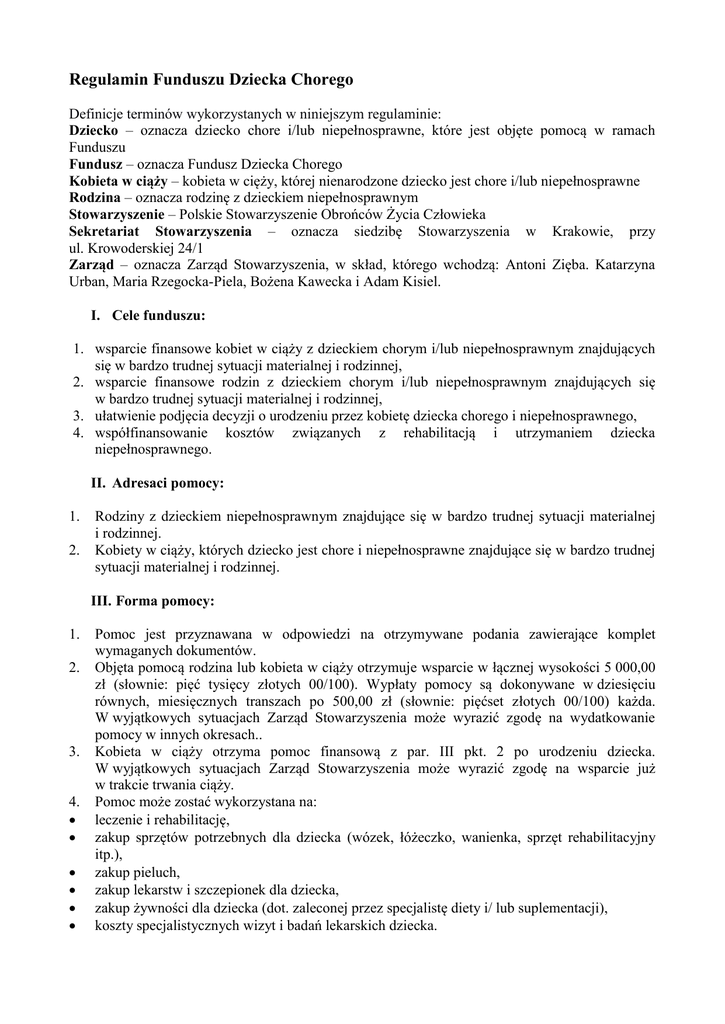 Regulamin Funduszu Dziecka Chorego Definicje terminów wykorzystanych w niniejszym regulaminie: Dziecko – oznacza dziecko chore i/lub niepełnosprawne, które jest objęte pomocą w ramach Funduszu Fundusz – oznacza Fundusz Dziecka Chorego Kobieta w ciąży – kobieta w cięży, której nienarodzone dziecko jest chore i/lub niepełnosprawne Rodzina – oznacza rodzinę z dzieckiem niepełnosprawnym Stowarzyszenie – Polskie Stowarzyszenie Obrońców Życia Człowieka Sekretariat Stowarzyszenia – oznacza siedzibę Stowarzyszenia w Krakowie, przy ul. Krowoderskiej 24/1 Zarząd – oznacza Zarząd Stowarzyszenia, w skład, którego wchodzą: Antoni Zięba. Katarzyna Urban, Maria Rzegocka-Piela, Bożena Kawecka i Adam Kisiel. I. Cele funduszu: 1. wsparcie finansowe kobiet w ciąży z dzieckiem chorym i/lub niepełnosprawnym znajdujących się w bardzo trudnej sytuacji materialnej i rodzinnej, 2. wsparcie finansowe rodzin z dzieckiem chorym i/lub niepełnosprawnym znajdujących się w bardzo trudnej sytuacji materialnej i rodzinnej, 3. ułatwienie podjęcia decyzji o urodzeniu przez kobietę dziecka chorego i niepełnosprawnego, 4. współfinansowanie kosztów związanych z rehabilitacją i utrzymaniem dziecka niepełnosprawnego. II. Adresaci pomocy: 1. 2. Rodziny z dzieckiem niepełnosprawnym znajdujące się w bardzo trudnej sytuacji materialnej i rodzinnej. Kobiety w ciąży, których dziecko jest chore i niepełnosprawne znajdujące się w bardzo trudnej sytuacji materialnej i rodzinnej. III. Forma pomocy: 1. 2. 3. 4. Pomoc jest przyznawana w odpowiedzi na otrzymywane podania zawierające komplet wymaganych dokumentów. Objęta pomocą rodzina lub kobieta w ciąży otrzymuje wsparcie w łącznej wysokości 5 000,00 zł (słownie: pięć tysięcy złotych 00/100). Wypłaty pomocy są dokonywane w dziesięciu równych, miesięcznych transzach po 500,00 zł (słownie: pięćset złotych 00/100) każda. W wyjątkowych sytuacjach Zarząd Stowarzyszenia może wyrazić zgodę na wydatkowanie pomocy w innych okresach.. Kobieta w ciąży otrzyma pomoc finansową z par. III pkt. 2 po urodzeniu dziecka. W wyjątkowych sytuacjach Zarząd Stowarzyszenia może wyrazić zgodę na wsparcie już w trakcie trwania ciąży. Pomoc może zostać wykorzystana na: leczenie i rehabilitację, zakup sprzętów potrzebnych dla dziecka (wózek, łóżeczko, wanienka, sprzęt rehabilitacyjny itp.), zakup pieluch, zakup lekarstw i szczepionek dla dziecka, zakup żywności dla dziecka (dot. zaleconej przez specjalistę diety i/ lub suplementacji), koszty specjalistycznych wizyt i badań lekarskich dziecka. 5. Koszty poniesione w czasie trwania funduszu będą rozliczane do 10-go dnia każdego miesiąca, na podstawie dostarczonych imiennych rachunków/faktur do 5-go dnia każdego miesiąca. Wypłaty będą dokonywane według transz podanych w par. III. punkt 2 niniejszego regulaminu funduszu. IV. Zasady przyznawania pomocy: 1. 2. 3. 4. 5. 6. Wsparcie przyznawane jest decyzją Zarządu Stowarzyszenia w odpowiedzi na otrzymywane podania zawierające komplet wymaganych dokumentów. Zarząd podejmuje decyzje o przyznaniu pomocy po rozpatrzeniu podań, których wzór znajduje się poniżej. Podania można składać przez cały rok. Zarząd zobowiązany jest rozpatrzyć prawidłowo wypełnione i posiadające wszystkie wymagane załączniki podanie do miesiąca od daty rejestracji wniosku w sekretariacie Stowarzyszenia. Podania można składać osobiście lub przesłać pocztą. Wszystkie osoby, które złożyły podania o pomoc zostaną poinformowane pisemnie o decyzji Zarządu. V. 1. 2. 3. 4. Zobowiązania rodziny lub kobiety w ciąży otrzymującej pomoc: Rodzina lub kobieta w ciąży zobowiązuje się złożyć oświadczenie o sprawowaniu opieki nad dzieckiem niepełnosprawnym. Rodzina lub kobieta w ciąży zobowiązuje się wykorzystać otrzymaną pomoc wyłącznie dla dobra dziecka niepełnosprawnego. W przypadku zaprzestania sprawowania opieki nad dzieckiem rodzina lub kobieta w ciąży zobowiązuje się niezwłocznie poinformować o tym Stowarzyszenie. Kobieta w ciąży (w przypadku, gdy Zarząd zadecyduje o wypłatacie pieniędzy jak w par. III pkt. 3) zobowiązuje się dostarczyć w terminie do 90 dni od porodu kserokopię aktu urodzenia dziecka wydanego nie wcześniej niż w 8 tygodniu od urodzenia dziecka. VI. Fundusz finansowany jest ze środków własnych w ramach działalności statutowej Stowarzyszenia. VII. Zarząd może zdecydować o zaprzestaniu wypłacania pomocy: 1. 2. w przypadku podejrzenia zaprzestania przez rodzinę lub kobietę w ciąży sprawowania opieki nad dzieckiem. gdy rodzina lub kobieta w ciąży zaprzestanie rozliczania się za pomocą faktur. VIII. Zarząd rezerwuje sobie prawo kontroli miejsca zamieszkania rodziny z dzieckiem w celu stwierdzenia czy rzeczywiście rodzina sprawuje nad opiekę nad dzieckiem i czy wykorzystuje zakupione z Funduszu sprzęty. Kontroli może dokonać komisja powołana przez Zarząd. Rodzina lub kobieta w ciąży zobowiązana jest umożliwić przeprowadzenie takiej kontroli. Zapoznałam/-łem się z regulaminem Funduszu Dziecka Chorego i akceptuję go. ………………………………….…… /miejscowość i data/ ………………………… /podpis/