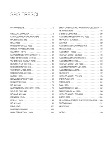 spis treści wprowadzenie . . . . . . . . . . . . . . . . . . . . . . . . . . . . . . . . 6 Broń okresu zimnej wojny i współczesna 114 AK-47/AKM (1949). . . . . . . . . . . . . . . . . . . . . . . . . . . . . . 116 I i II wojna światowa. . . . . . . . . . . . . . . . . . . . . . . . . . . 8 Sterling L2A1 (1953). . . . . . . . . . . . . . . . . . . . . . . . . . 120 Kartaczownica Gatlinga (1878) . . . . . . . . . . . . . . 10 Karabinek maszynowy RPD (1953). . . . . . . . . . . . 124 Mauser C/96 (1895). . . . . . . . . . . . . . . . . . . . . . . . . . . . 14 FN FAL/L1A1 SLR (1954). . . . . . . . . . . . . . . . . . . . . . . . . 128 SMLE (1903). . . . . . . . . . . . . . . . . . . . . . . . . . . . . . . . . . . . 18 Uzi (1954) . . . . . . . . . . . . . . . . . . . . . . . . . . . . . . . . . . . . . 132 M1903 Springfield (1903). . . . . . . . . . . . . . . . . . . . . . 22 Karabin maszynowy M60 (1957). . . . . . . . . . . . . . . 136 Pistole Parabellum (1908). . . . . . . . . . . . . . . . . . . . 26 FN MAG (1958). . . . . . . . . . . . . . . . . . . . . . . . . . . . . . . . . 140 Colt M1911 (1911) . . . . . . . . . . . . . . . . . . . . . . . . . . . . . 30 Karabin M14 (1959). . . . . . . . . . . . . . . . . . . . . . . . . . . . 144 Karabin maszynowy Lewis (1911). . . . . . . . . . . . . . 34 Heckler & Koch G3 (1959). . . . . . . . . . . . . . . . . . . . 148 Winchester Model 12 (1912) . . . . . . . . . . . . . . . . . . 38 Karabin maszynowy PK (1961). . . . . . . . . . . . . . . . 152 Vickers Machine Gun (1912). . . . . . . . . . . . . . . . . . . 42 Karabinek M16 (1963). . . . . . . . . . . . . . . . . . . . . . . . . 156 Bergmann MP 18 (1918). . . . . . . . . . . . . . . . . . . . . . . . 46 Heckler & Koch MP5 (1966). . . . . . . . . . . . . . . . . . . 160 M1919 Browning (1919). . . . . . . . . . . . . . . . . . . . . . . . 50 Karabin wyborowy M21 (1969). . . . . . . . . . . . . . . 164 Thompson M1928 (1928) . . . . . . . . . . . . . . . . . . . . . . . 54 Karabinek Galil (1973). . . . . . . . . . . . . . . . . . . . . . . . 168 M2 Browning .50 (1933). . . . . . . . . . . . . . . . . . . . . . . . 58 AK-74 (1974). . . . . . . . . . . . . . . . . . . . . . . . . . . . . . . . . . . 172 Kar 98k (1935). . . . . . . . . . . . . . . . . . . . . . . . . . . . . . . . . 62 Heckler & Koch P7 (1976). . . . . . . . . . . . . . . . . . . . 176 Browning GP35 HP (1935). . . . . . . . . . . . . . . . . . . . . . 66 Steyr AUG (1977). . . . . . . . . . . . . . . . . . . . . . . . . . . . . . 180 M1 Garand (1936). . . . . . . . . . . . . . . . . . . . . . . . . . . . . . 70 FAMAS (1978). . . . . . . . . . . . . . . . . . . . . . . . . . . . . . . . . . 184 MG 34 (1936) . . . . . . . . . . . . . . . . . . . . . . . . . . . . . . . . . . . 74 SA80 (1985). . . . . . . . . . . . . . . . . . . . . . . . . . . . . . . . . . . . 188 Karabin maszynowy Bren (1938). . . . . . . . . . . . . . 78 Barrett M82A1 (1989). . . . . . . . . . . . . . . . . . . . . . . . . 192 Walther P38 (1938) . . . . . . . . . . . . . . . . . . . . . . . . . . . . 82 Subkarabinek M4 (1994). . . . . . . . . . . . . . . . . . . . . . 196 MP 38/MP 40 (1938). . . . . . . . . . . . . . . . . . . . . . . . . . . . . . 86 Heckler & Koch G36 (1995). . . . . . . . . . . . . . . . . . . 200 Sten Mk 2 (1941). . . . . . . . . . . . . . . . . . . . . . . . . . . . . . . 90 QBZ-03 (2003) . . . . . . . . . . . . . . . . . . . . . . . . . . . . . . . . . 204 PPSh-41 (1941) . . . . . . . . . . . . . . . . . . . . . . . . . . . . . . . . . 94 M110 Semi-Automatic Sniper System (2008). . . 208 MG 42 (1942) . . . . . . . . . . . . . . . . . . . . . . . . . . . . . . . . . . . 98 FN SCAR (2009). . . . . . . . . . . . . . . . . . . . . . . . . . . . . . . . 212 FG 42 (1942). . . . . . . . . . . . . . . . . . . . . . . . . . . . . . . . . . . 102 AK-12 (2010). . . . . . . . . . . . . . . . . . . . . . . . . . . . . . . . . . . 216 Karabinek M1 (1942). . . . . . . . . . . . . . . . . . . . . . . . . . 106 M3A1 ‘Grease Gun’ (1942). . . . . . . . . . . . . . . . . . . . . 110 Indeks . . . . . . . . . . . . . . . . . . . . . . . . . . . . . . . . . . . . . . . 220