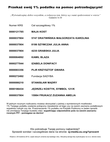 Przekaż swój 1% podatku na pomoc potrzebującym! „Wyświadczajmy dobro wszystkim, a zwłaszcza tym, którzy są z nami spokrewnieni w wierze” Galatów 6:10 Numer KRS Cel szczegółowy 1% 0000121785 MAJA KOST 0000037904 5747 DRATWIŃSKA MAŁGORZATA KAROLINA 0000037904 8186 SZYMCZAK JULIA ANNA 0000037904 4235 GRABSKA JULIA 0000064892 KAMIL BLAZA 0000277044 IZABELA DONIFACY 0000083356 PLiR KRZYSZTOF GWARA 0000272492 Fundacja SADYBA 0000086210 STANISŁAW MĄDRY 0000186434 JĘDRZEJ KOSTYK, SYMBOL 121/K 0000037904 15984 FRUKACZ ZUZANNA AMELIA W jednym rocznym rozliczeniu możesz skorzystać z jednej z wymienionych możliwości. 1% Twojego podatku zostanie potrącony niezależnie od tego czy na swoim zeznaniu podatkowym wypełnisz rubryki czy nie. Przeznaczenie 1% podatku na Pożytek Publiczny w żaden sposób nie zmniejsza Twojego budżetu więc: wypełniając odpowiednie pola na swoim zeznaniu rocznym PIT - pomagasz za darmo! Kto potrzebuje Twojej pomocy najbardziej? Sprawdź sondaż i szczegółowe dane na stronie: sj-media.eu.org/1procent Ważne o 30 kwietnia 2012, część danych zmienia się każdego roku. Aktualną wersję listy wydrukujesz na w.w. stronie www.