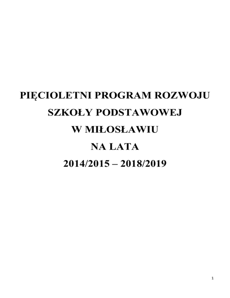 PIĘCIOLETNI PROGRAM ROZWOJU SZKOŁY PODSTAWOWEJ W MIŁOSŁAWIU NA LATA 2014/2015 – 2018/2019 1 Podstawą do opracowania Programu Rozwoju Szkoły były: 1. Rozporządzenie Ministra Edukacji Narodowej i Sportu z dnia 23 kwietnia 2004 r. w sprawie szczegółowych zasad sprawowania nadzoru pedagogicznego, wykazu stanowisk wymagających kwalifikacji pedagogicznych, kwalifikacji niezbędnych do sprawowania nadzoru pedagogicznego, a także kwalifikacji osób, którym można zlecać prowadzenie badań i opracowywanie ekspertyz (Dz.U. z 2004r. nr 89, poz. 845); 2. Rozporządzenie Ministra Edukacji Narodowej z dnia 10 maja 2013 r.(Dz.U. z 14 maja 2013 r., poz. 560); 3. kierunki realizacji polityki oświatowej państwa (priorytety MEN na rok szkolny 2014 / 2015 ogłoszone przez ministra EN – p. Joannę Kluzik-Rostkowską); 4. kierunki realizacji zadań z zakresu nadzoru pedagogicznego (wymagania określone przez Wojewódzkiego Kuratora Oświaty w Poznaniu – p. Elżbietę Walkowiak na rok szkolny 2014 / 2015); 5. wnioski z zespołowej diagnozy dotyczącej realizacji pięcioletniego Programu Rozwoju Szkoły w latach 2009 – 2014. 2 Ad. 3. Kierunki realizacji polityki oświatowej państwa na rok 2014 / 2015 Joanna Kluzik-Rostkowska ustaliła podstawowe kierunki realizacji polityki oświatowej państwa w roku szkolnym 2014/2015. Minister edukacji narodowej co roku, na podstawie przepisów ustawy o systemie oświaty (art. 35 ust. 2 pkt 1), ustala podstawowe kierunki realizacji polityki oświatowej państwa w danym roku szkolnym. 1. Wspieranie rozwoju dziecka młodszego na I-szym i kolejnych etapach edukacyjnych w związku z obniżeniem wieku realizacji obowiązku szkolnego. 2. Podniesienie jakości kształcenia ponadgimnazjalnego w zakresie umiejętności określonych w podstawie programowej, ze szczególnym uwzględnieniem umiejętności w zakresie matematyki. 3. Profilaktyka agresji i przemocy w szkołach. 4. Edukacja włączająca uczniów niepełnosprawnych. Ad. 4. Kierunki realizacji zadań z zakresu nadzoru pedagogicznego – wymagania Kuratorium Oświaty 1. Szkoła lub placówka realizuje koncepcję pracy ukierunkowaną na rozwój uczniów. 2. Procesy edukacyjne są zorganizowane w sposób sprzyjający uczeniu się. 3. Uczniowie nabywają wiadomości i umiejętności określone w podstawie programowej. 4. Uczniowie są aktywni. 5. Respektowane są normy społeczne. 6. Szkoła lub placówka wspomaga rozwój uczniów, z uwzględnieniem ich indywidualnej sytuacji. 7. Nauczyciele współpracują w planowaniu i realizowaniu procesów edukacyjnych. 8. Promowana jest wartość edukacji. 9. Rodzice są partnerami szkoły lub placówki. 10. Wykorzystywane są zasoby szkoły lub placówki oraz środowiska lokalnego na rzecz wzajemnego rozwoju. 11. Szkoła lub placówka, organizując procesy edukacyjne, uwzględnia wnioski z analizy wyników sprawdzianu, egzaminu gimnazjalnego, egzaminu maturalnego, egzaminu potwierdzającego kwalifikacje zawodowe i egzaminu potwierdzającego kwalifikacje w zawodzie oraz innych badań zewnętrznych i wewnętrznych. 12. Zarządzanie szkołą lub placówką służy jej rozwojowi. 13. Uczniowie nabywają wiadomości i umiejętności określone w podstawie programowej. 14. Szkoła lub placówka wspomaga rozwój uczniów z uwzględnieniem ich indywidualnej sytuacji. 15. Szkoła lub placówka organizując procesy edukacyjne uwzględnia wnioski z analizy wyników sprawdzianu, egzaminu gimnazjalnego, egzaminu maturalnego, egzaminu potwierdzającego kwalifikacje zawodowe i egzaminu potwierdzającego kwalifikacje w zawodzie oraz innych badań zewnętrznych i wewnętrznych. 16. Procesy edukacyjne są zorganizowane w sposób sprzyjający uczeniu się. 3 Ad. 5. Wnioski z zespołowej diagnozy dotyczącej realizacji pięcioletniego Programu Rozwoju Szkoły w latach 2009- 2014 OBSZAR I Zarządzanie i organizacja WSKAŹNIKI OCENIONE NAJWYŻEJ WSKAŹNIKI OCENIONE NAJNIŻEJ 1. Kryteria oceny pracy są przeze mnie akceptowane. 1. Zasady przyznawania nagród i dodatków motywacyjnych są mi znane. 2. Nauczyciele w mojej placówce mają możliwość rozwoju zawodowego. 2. Przydział dodatkowych zajęć wpływa na mój rozwój zawodowy. 3. Nauczyciele uzyskują kolejne stopnie awansu zawodowego. 4. Nauczyciele dzielą się doświadczeniami i wiedzą. 5. Strona internetowa spełnia swoją rolę. II szkoły 1. i treści Uczniowie klas pierwszych 1.Cele kształcenia mają zapewnione właściwe dostosowuję do indywidualnych warunki pracy. potrzeb ucznia. 2. Pomieszczenia dla uczniów 2.Uatrakcyjniam zajęcia kl. IV-VI zapewniają pozalekcyjne przez stosowanie właściwą organizację procesu programów multimedialnych. kształcenia. 3. Zajęcia sportowe odbywają się w dobrze wyposażonej hali sportowej. Kształcenie 4.Wspieram uczniów zdolnych i udzielam pomocy dzieciom ze specyficznymi trudnościami. 5.Stosuję różnorodne aktywizujące ucznia. 6.Uczniowie uczęszczania mają na metody możliwość dodatkowe 4 zajęcia pozalekcyjne. 7.Uczniowie są systematycznie przygotowywani do sprawdzianu szóstoklasisty. III Wychowanie i opieka 1.W szkole kultywuje się tradycje 1.Na analizuje się bieżąco patriotyczne i uroczyście i modyfikuje Program obchodzi dni świąteczne. Wychowawczo - Profilaktyczny. 2.Uczniowie mają zapewnioną 2.Aktualizacji podlega system kar właściwą opiekę w świetlicy i nagród. szkolnej. 3.Uczniowie zazwyczaj przestrzegają 3.Uczniowie potrzebujący zasad zachowania, jakie ich pomocy są objęci różnego obowiązują. rodzaju wsparciem. 4.Podczas wystawiania ocen 4.Nauczyciele wspólnie pracują z zachowania nauczyciele biorą pod nad zadaniami objętymi uwagę ustalone kryteria. kalendarzem imprez i uroczystości. 5.Formy współpracy z rodzicami są doskonalone, dzięki czemu rodzice aktywnie włączają się w realizację zadań szkoły (np. festyny). 5 PIĘCIOLETNI PROGRAM ROZWOJU SZKOŁY PODSTAWOWEJ W MIŁOSŁAWIU 2014/2015- 2018/2019 WSTĘP Szkoła Pod