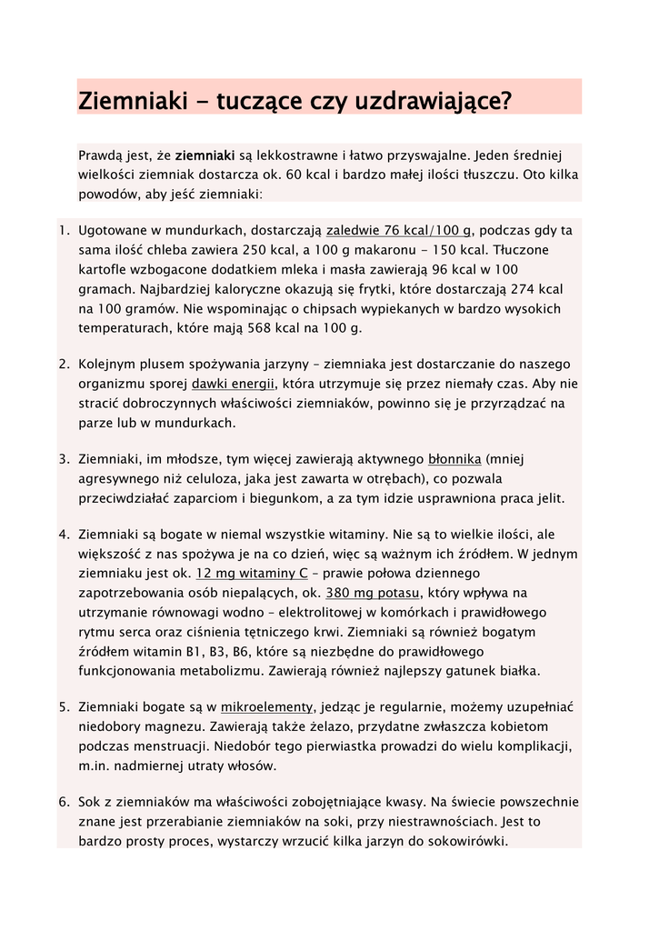 Ziemniaki - tuczące czy uzdrawiające? Prawdą jest, że ziemniaki są lekkostrawne i łatwo przyswajalne. Jeden średniej wielkości ziemniak dostarcza ok. 60 kcal i bardzo małej ilości tłuszczu. Oto kilka powodów, aby jeść ziemniaki: 1. Ugotowane w mundurkach, dostarczają zaledwie 76 kcal/100 g, podczas gdy ta sama ilość chleba zawiera 250 kcal, a 100 g makaronu - 150 kcal. Tłuczone kartofle wzbogacone dodatkiem mleka i masła zawierają 96 kcal w 100 gramach. Najbardziej kaloryczne okazują się frytki, które dostarczają 274 kcal na 100 gramów. Nie wspominając o chipsach wypiekanych w bardzo wysokich temperaturach, które mają 568 kcal na 100 g. 2. Kolejnym plusem spożywania jarzyny – ziemniaka jest dostarczanie do naszego organizmu sporej dawki energii, która utrzymuje się przez niemały czas. Aby nie stracić dobroczynnych właściwości ziemniaków, powinno się je przyrządzać na parze lub w mundurkach. 3. Ziemniaki, im młodsze, tym więcej zawierają aktywnego błonnika (mniej agresywnego niż celuloza, jaka jest zawarta w otrębach), co pozwala przeciwdziałać zaparciom i biegunkom, a za tym idzie usprawniona praca jelit. 4. Ziemniaki są bogate w niemal wszystkie witaminy. Nie są to wielkie ilości, ale większość z nas spożywa je na co dzień, więc są ważnym ich źródłem. W jednym ziemniaku jest ok. 12 mg witaminy C – prawie połowa dziennego zapotrzebowania osób niepalących, ok. 380 mg potasu, który wpływa na utrzymanie równowagi wodno – elektrolitowej w komórkach i prawidłowego rytmu serca oraz ciśnienia tętniczego krwi. Ziemniaki są również bogatym źródłem witamin B1, B3, B6, które są niezbędne do prawidłowego funkcjonowania metabolizmu. Zawierają również najlepszy gatunek białka. 5. Ziemniaki bogate są w mikroelementy, jedząc je regularnie, możemy uzupełniać niedobory magnezu. Zawierają także żelazo, przydatne zwłaszcza kobietom podczas menstruacji. Niedobór tego pierwiastka prowadzi do wielu komplikacji, m.in. nadmiernej utraty włosów. 6. Sok z ziemniaków ma właściwości zobojętniające kwasy. Na świecie powszechnie znane jest przerabianie ziemniaków na soki, przy niestrawnościach. Jest to bardzo prosty proces, wystarczy wrzucić kilka jarzyn do sokowirówki. Dania z ziemniaków: Zapiekanka ziemniaczana (sabaudzka) : Potrzebujemy 8 średniej wielkości ziemniaków, sól, pieprz, gałkę muszkatołową, 2 ząbki czosnku, 2 łyżki tartej bułki, 2 jaja, tłuszcz do wysmarowania naczynia, 1 łyżkę masła lub margaryny, 1 szklankę śmietanki i ok. 25 dag żółtego sera. Ziemniaki obieramy i kroimy na cienkie plastry. Żaroodporne naczynie smarujemy tłuszczem, posypujemy posiekanym czosnkiem i 1 łyżką tartej bułki. Wykładamy warstwami ziemniaki – każdą z nich solimy, przysypujemy serem i polewamy śmietaną roztrzepaną z jajami, szczyptą gałki muszkatołowej i pieprzu. Na warstwy sera kładziemy kilka wiórków masła. Wierzchnią warstwę powinien stanowić ser polany śmietaną i przysypany łyżką tartej bułki. Wstawiamy do piekarnika rozgrzanego do 200 stopni i pieczemy przez ok. 30 minut pod przykryciem, następnie jeszcze przez ok. 15 minut bez przykrycia. Ziemniaki duszone w śmietanie: 1 kg ziemniaków, 2 cebule, sól, pieprz, 2 szklanki śmietany, koperek. Obrane ziemniaki kroimy w plasterki i na 5 minut wrzucamy do wrzącej wody. Odcedzamy, solimy i doprawiamy pieprzem, aby były pikantne. Wkładamy do garnka, dodajemy cienko pokrojone cebule. Całość zalewamy śmietaną i dusimy do miękkości. Przed podaniem posypujemy siekanym koperkiem. Sałatka z ziemniaków, jaj i sera : 6 ugotowanych, średniej wielkości ziemniaków, 4 jaja ugotowane na twardo, 1 jabłko winne, 1 ścisła główka sałaty, 10 dag sera, 1 ogórek konserwowy, sól. Sos: 4 łyżki oleju, pół łyżki octu winnego, pół łyżeczki musztardy, sól, pieprz. Jaja obieramy ze skorupek i dzielimy na ćwiartki. Ziemniaki kroimy na plasterki. Jabłko obieramy i kroimy w paseczki. Z opłukanej i osączonej sałaty bierzemy środek i kroimy go na nieduże cząstki, zewnętrzne liście zostawiając do dekoracji. Ser również kroimy w paski. Wszystkie składniki mieszamy, dodajemy sos. Całość dekorujemy liśćmi sałaty i ogórkiem.