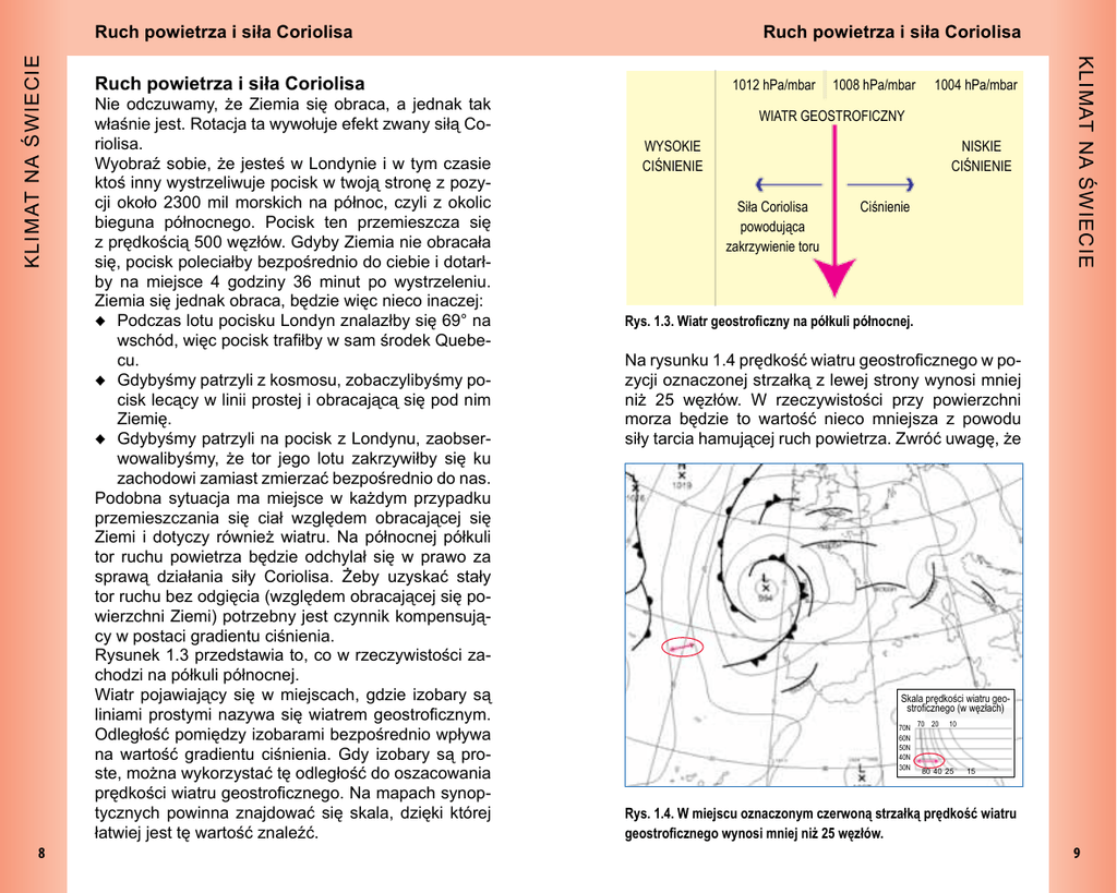 8 Ruch powietrza i siła Coriolisa Ruch powietrza i siła Coriolisa Nie odczuwamy, że Ziemia się obraca, a jednak tak właśnie jest. Rotacja ta wywołuje efekt zwany siłą Coriolisa. Wyobraź sobie, że jesteś w Londynie i w tym czasie ktoś inny wystrzeliwuje pocisk w twoją stronę z pozycji około 2300 mil morskich na północ, czyli z okolic bieguna północnego. Pocisk ten przemieszcza się z prędkością 500 węzłów. Gdyby Ziemia nie obracała się, pocisk poleciałby bezpośrednio do ciebie i dotarłby na miejsce 4 godziny 36 minut po wystrzeleniu. Ziemia się jednak obraca, będzie więc nieco inaczej: ♦ Podczas lotu pocisku Londyn znalazłby się 69° na wschód, więc pocisk trafiłby w sam środek Quebecu. ♦ Gdybyśmy patrzyli z kosmosu, zobaczylibyśmy pocisk lecący w linii prostej i obracającą się pod nim Ziemię. ♦ Gdybyśmy patrzyli na pocisk z Londynu, zaobserwowalibyśmy, że tor jego lotu zakrzywiłby się ku zachodowi zamiast zmierzać bezpośrednio do nas. Podobna sytuacja ma miejsce w każdym przypadku przemieszczania się ciał względem obracającej się Ziemi i dotyczy również wiatru. Na północnej półkuli tor ruchu powietrza będzie odchylał się w prawo za sprawą działania siły Coriolisa. Żeby uzyskać stały tor ruchu bez odgięcia (względem obracającej się powierzchni Ziemi) potrzebny jest czynnik kompensujący w postaci gradientu ciśnienia. Rysunek 1.3 przedstawia to, co w rzeczywistości zachodzi na półkuli północnej. Wiatr pojawiający się w miejscach, gdzie izobary są liniami prostymi nazywa się wiatrem geostroficznym. Odległość pomiędzy izobarami bezpośrednio wpływa na wartość gradientu ciśnienia. Gdy izobary są proste, można wykorzystać tę odległość do oszacowania prędkości wiatru geostroficznego. Na mapach synoptycznych powinna znajdować się skala, dzięki której łatwiej jest tę wartość znaleźć. 1012 hPa/mbar 1008 hPa/mbar 1004 hPa/mbar Wiatr geostroficzny Wysokie ciśnienie Niskie ciśnienie Siła Coriolisa powodująca zakrzywienie toru Ciśnienie klimat na Świecie klimat na Świecie Ruch powietrza i siła Coriolisa Rys. 1.3. Wiatr geostroficzny na półkuli północnej. Na rysunku 1.4 prędkość wiatru geostroficznego w pozycji oznaczonej strzałką z lewej strony wynosi mniej niż 25 węzłów. W rzeczywistości przy powierzchni morza będzie to wartość nieco mniejsza z powodu siły tarcia hamującej ruch powietrza. Zwróć uwagę, że Skala prędkości wiatru geostroficznego (w węzłach) 70N 60N 50N 40N 30N 70 20 10 80 40 25 15 Rys. 1.4. W miejscu oznaczonym czerwoną strzałką prędkość wiatru geostroficznego wynosi mniej niż 25 węzłów. 9
