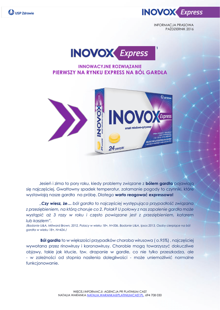 INFORMACJA PRASOWA PAŹDZIERNIK 2016 1 INNOWACYJNE ROZWIĄZANIE PIERWSZY NA RYNKU EXPRESS NA BÓL GARDŁA Jesień i zima to pory roku, kiedy problemy związane z bólem gardła pojawiają się najczęściej. Gwałtowny spadek temperatur, załamanie pogody to czynniki, które wystawiają nasze gardła na próbę. Dlatego warto reagować expressowo! ,,Czy wiesz, że… ból gardła to najczęściej występująca przypadłość związana z przeziębieniem, na którą choruje co 2. Polak? U połowy z nas zapalenie gardła może wystąpić aż 3 razy w roku i często powiązane jest z przeziębieniem, katarem lub kaszlem”. /Badanie U&A, Millward Brown, 2012, Polacy w wieku 18+, N=506. Badanie U&A, Ipsos 2013, Osoby cierpiące na ból gardła w wieku 18+, N=424./ Ból gardła to w większości przypadków choroba wirusowa ( o.95%) , najczęściej wywołana przez rinowirusy i koronawirusy. Chorobie mogą towarzyszyć dokuczliwe objawy, takie jak kłucie, tzw. drapanie w gardle, co nie tylko przeszkadza, ale - w zależności od stopnia nasilenia dolegliwości - może uniemożliwić normalne funkcjonowanie. WIĘCEJ INFORMACJI: AGENCJA PR PLATINIUM CAST NATALIA WARANKA [email protected], 694 708 030 INFORMACJA PRASOWA PAŹDZIERNIK 2016 1 INOVOX EXPRESS1 to rewolucyjny produkt na rynku preparatów na ból gardła. Dzięki innowacyjnemu połączeniu trzech, synergicznie działających składników aktywnych, miejscowo znieczula i łagodzi odczuwanie bólu gardła dzięki zawartości lidokainy. Zawiera także dwie substancje antyseptyczne (amylometakrezol oraz alkohol 2,4 dichlorobenzylowy), które osiągają swoje maksymalne stężenie już po 3 minutach od zastosowania2. LIDOKAINA AMYLOMETAKREZOL łagodzi odczuwanie bólu gardła działa antyseptycznie ALKOHOL 2,4-DICHLOROBENZYLOWY działa antyseptycznie Inovox Express smak miodowo-cytrynowy, Inovox Express smak pomarańczowy Inovox Express smak miętowy 2 mg + 0,6 mg + 1,20 mg 2 mg + 0,6 mg + 1,20 mg 2 mg + 0,6 mg + 1,20 mg Lidokainy chlorowodorek, amylometakrezol, alkohol 2,4-dichlorobenzylowy 2 mg + 0,6 mg + 1,20 mg, pastylki twarde. WSKAZANIA DO STOSOWANIA: Łagodzenie bólu gardła u dorosłych i młodzieży w wieku powyżej 12 lat. PRZECIWWSKAZANIA: Nadwrażliwość na substancje czynne lub którąkolwiek z substancji pomocniczych. Ze względu na zawartość lidokainy produkt jest przeciwskazany do stosowania u dzieci poniżej 12 lat. CENA: 16,99 zł max./24 pastylki PODMIOT ODPOWIEDZIALNY: US Pharmacia Sp. z o.o. INFORMACJE PRASOWE, ZDJĘCIA PRODUKTÓW ORAZ ARTYKUŁY: www.serwisprasowy.platiniumcast.pl 1Przed użyciem zapoznaj się z ulotką, która zawiera wskazania, przeciwwskazania, dane dotyczące działań niepożądanych i dawkowanie oraz informacje dotyczące stosowania produktu leczniczego, bądź skonsultuj się z lekarzem lub farmaceutą, gdyż każdy lek niewłaściwie stosowany zagraża Twojemu życiu lub zdrowiu. 2 Dotyczy Amylometakrezolu oraz Alkoholu 2,4 dichlorobenzylowego, które osiągają maksymalne stężenie w ślinie po 3-4 minutach WIĘCEJ INFORMACJI: AGENCJA PR PLATINIUM CAST NATALIA WARANKA [email protected], 694 708 030