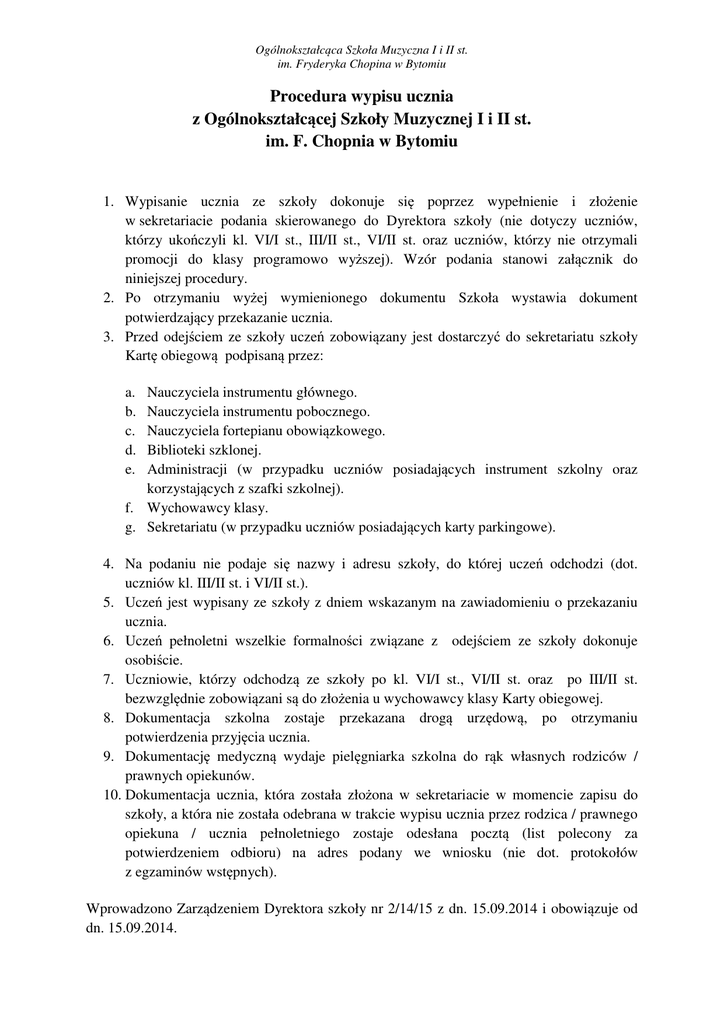 Ogólnokształcąca Szkoła Muzyczna I i II st. im. Fryderyka Chopina w Bytomiu Procedura wypisu ucznia z Ogólnokształcącej Szkoły Muzycznej I i II st. im. F. Chopnia w Bytomiu 1. Wypisanie ucznia ze szkoły dokonuje się poprzez wypełnienie i złożenie w sekretariacie podania skierowanego do Dyrektora szkoły (nie dotyczy uczniów, którzy ukończyli kl. VI/I st., III/II st., VI/II st. oraz uczniów, którzy nie otrzymali promocji do klasy programowo wyższej). Wzór podania stanowi załącznik do niniejszej procedury. 2. Po otrzymaniu wyżej wymienionego dokumentu Szkoła wystawia dokument potwierdzający przekazanie ucznia. 3. Przed odejściem ze szkoły uczeń zobowiązany jest dostarczyć do sekretariatu szkoły Kartę obiegową podpisaną przez: a. b. c. d. e. Nauczyciela instrumentu głównego. Nauczyciela instrumentu pobocznego. Nauczyciela fortepianu obowiązkowego. Biblioteki szklonej. Administracji (w przypadku uczniów posiadających instrument szkolny oraz korzystających z szafki szkolnej). f. Wychowawcy klasy. g. Sekretariatu (w przypadku uczniów posiadających karty parkingowe). 4. Na podaniu nie podaje się nazwy i adresu szkoły, do której uczeń odchodzi (dot. uczniów kl. III/II st. i VI/II st.). 5. Uczeń jest wypisany ze szkoły z dniem wskazanym na zawiadomieniu o przekazaniu ucznia. 6. Uczeń pełnoletni wszelkie formalności związane z odejściem ze szkoły dokonuje osobiście. 7. Uczniowie, którzy odchodzą ze szkoły po kl. VI/I st., VI/II st. oraz po III/II st. bezwzględnie zobowiązani są do złożenia u wychowawcy klasy Karty obiegowej. 8. Dokumentacja szkolna zostaje przekazana drogą urzędową, po otrzymaniu potwierdzenia przyjęcia ucznia. 9. Dokumentację medyczną wydaje pielęgniarka szkolna do rąk własnych rodziców / prawnych opiekunów. 10. Dokumentacja ucznia, która została złożona w sekretariacie w momencie zapisu do szkoły, a która nie została odebrana w trakcie wypisu ucznia przez rodzica / prawnego opiekuna / ucznia pełnoletniego zostaje odesłana pocztą (list polecony za potwierdzeniem odbioru) na adres podany we wniosku (nie dot. protokołów z egzaminów wstępnych). Wprowadzono Zarządzeniem Dyrektora szkoły nr 2/14/15 z dn. 15.09.2014 i obowiązuje od dn. 15.09.2014. Ogólnokształcąca Szkoła Muzyczna I i II st. im. Fryderyka Chopina w Bytomiu WZÓR Bytom, dn. …………………… ……………………………………………………… (imię i nazwisko rodzica/prawnego opiekuna/ucznia pełnoletniego) ……………………………………………………… ……………………………………………………… (adres zamieszkania) Dyrektor Ogólnokształcącej Szkoły Muzycznej I i II stopnia im. Fryderyka Chopina w Bytomiu Oświadczam, że syn/córka* …………………………………………………………………… (imię, nazwisko ucznia) ur. ………………………………… nie będzie uczęszczał/uczęszczała* do Ogólnokształcącej Szkoły Muzycznej I i II stopnia w Bytomiu. Obowiązek szkolny/nauki będzie realizowany od dnia …………………………………… w ………………………………………………………………………………………………… ………………………………………………………………………………………………… (adres szkoły) Powodem wypisania ze szkoły jest ………………………………………………………………………………………………… ………………………………………………………………………………………………… …………………………………………………………………… (czytelny podpis rodzica/prawnego opiekuna/ucznia pełnoletniego) * Podkreśl właściwe