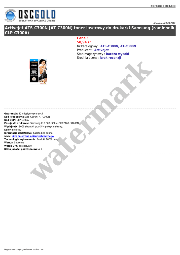 Informacje o produkcie Utworzono 03-03-2017 ActiveJet ATS-C300N [AT-C300N] toner laserowy do drukarki Samsung (zamiennik CLP-C300A) Cena : 58,94 zł er m ar k Nr katalogowy : ATS-C300N, AT-C300N Producent : ActiveJet Stan magazynowy : bardzo wysoki Średnia ocena : brak recenzji w at Gwarancja: 60 miesięcy gwarancji Kod Producenta: ATS-C300N, AT-C300N Kod OEM: CLP-C300A Pasuje do drukarek:: Samsung CLP 300, 300N. CLX 2160, 3160FN. Wydajność: 1000 stron A4 przy 5 % pokryciu strony. Kolor: Błękitny Informacje dodatkowe: Kaseta bez bębna www: Link na stronę opisu technicznego Technologia wytworzenia: Produkt 100% nowy Wersja: Supreme Wałek OPC: Nie dotyczy Klasa jakości podzespołów: A + Wygenerowano w programie www.oscGold.com