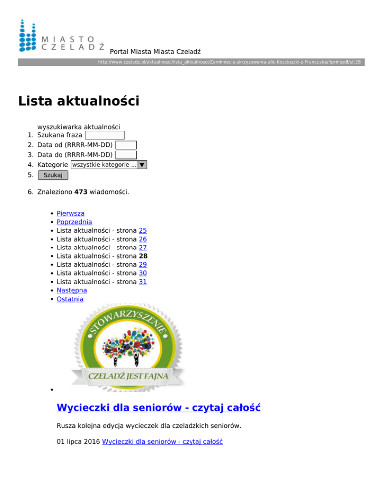 Portal Miasta Miasta Czeladź http://www.czeladz.pl/aktualnosci/lista_aktualnosci/Zamkniecie-skrzyzowania-ulic-Kosciuszki-z-Francuska/i/printpdf/st:28 Lista aktualności wyszukiwarka aktualności 1. Szukana fraza 2. Data od (RRRR-MM-DD) 3. Data do (RRRR-MM-DD) 4. Kategorie wszystkie kategorie ... ▼ 5. Szukaj 6. Znaleziono 473 wiadomości. Pierwsza Poprzednia Lista aktualności - strona 25 Lista aktualności - strona 26 Lista aktualności - strona 27 Lista aktualności - strona 28 Lista aktualności - strona 29 Lista aktualności - strona 30 Lista aktualności - strona 31 Następna Ostatnia Wycieczki dla seniorów - czytaj całość Rusza kolejna edycja wycieczek dla czeladzkich seniorów. 01 lipca 2016 Wycieczki dla seniorów - czytaj całość Został już tylko 1 dzień na złożenie wniosku na świadczenie wychowawcze 500+ - czytaj całość Jeśli chcecie otrzymać wypłatę świadczenia wychowawczego od kwietnia 2016 roku to złóżcie wniosek w terminie do 1 lipca 2016 włącznie! 30 czerwca 2016 Został już tylko 1 dzień na złożenie wniosku na świadczenie wychowawcze 500+ - czytaj całość I Edycja Programu Pomocy Mieszkaniowej - czytaj całość Burmistrz Miasta Czeladź ogłasza I OGRANICZONY KONKURS OFERT NA NAJEM LOKALU DO REMONTU organizowany w ramach I edycji Programu Pomocy Mieszkaniowej 29 czerwca 2016 I Edycja Programu Pomocy Mieszkaniowej - czytaj całość Ścieżka przyrodniczo-dydaktyczna „Rodzime i obce gatunki drzew Parku im. Tadeusza Kościuszki w Czeladzi” - czytaj całość W parku im. Tadeusza Kościuszki utworzono ścieżkę przyrodniczo-dydaktyczną umożliwiającą zapoznanie się z rodzimymi (właściwymi dla danego obszaru geograficznego) i obcymi (napływowymi) gatunkami drzew. Przedmiotowa ścieżka została wyznaczona wzdłuż głównych alejek parkowych i rozpoczyna się ogólną tablicą informacyjną zlokalizowaną przy Placu Konstytucji 3 Maja. 29 czerwca 2016 Ścieżka przyrodniczo-dydaktyczna „Rodzime i obce gatunki drzew Parku im. Tadeusza Kościuszki w Czeladzi” - czytaj całość XXI Nieobozowa Akcja Letnia rozpoczęta - czytaj całość W poniedziałek, 27 czerwca rozpoczęła się organizowana po raz jedenasty „Nieobozowa Akcja Letnia”. 28 czerwca 2016 XXI Nieobozowa Akcja Letnia rozpoczęta - czytaj całość Graffiti opanowało Park Grabek - czytaj całość 25 czerwca na terenie Parku Grabek odbyła się impreza „Stań Pod Murem Vol.11 / Graffiti Jam”. To już kolejna edycja tego niezwykle barwnego wydarzenia, które od kilku lat odbywa się w mieście. 28 czerwca 2016 Graffiti opanowało Park Grabek - czytaj całość Finisaż wystawy papierowych sukien historycznych czytaj całość Muzeum Saturn w Czeladzi serdecznie zaprasza 30 czerwca o godz. 17.00 na uroczyste zakończenie wystawy papierowych sukien historycznych prezentowanej od dnia 14 maja. 27 czerwca 2016 Finisaż wystawy papierowych sukien historycznych - czytaj całość Zakończenie roku szkolnego - czytaj całość 24 czerwca 2016 roku w Gimnazjum Nr 2 w Czeladzi odbyło się miejskie zakończenie roku szkolnego 2015/2016. 27 czerwca 2016 Zakończenie roku szkolnego - czytaj całość Znamy nowego radnego - czytaj całość W niedzielę 26 czerwca br. odbyły się wybory uzupełniające do Rady Miejskiej w Czeladzi w okręgu nr 17. 27 czerwca 2016 Znamy nowego radnego - czytaj całość Burmistrz otrzymał absolutorium - czytaj całość 23 czerwca 2016 roku Rada Miejska w Czeladzi udzieliła burmistrzowi Zbigniewowi Szaleńcowi absolutorium za 2015 rok. 24 czerwca 2016 Burmistrz otrzymał absolutorium - czytaj całość Pierwsza Poprzednia Lista aktualności - strona 25 Lista aktualności - strona 26 Lista aktualności - strona 27 Lista aktualności - strona 28 Lista aktualności - strona 29 Lista aktualności - strona 30 Lista aktualności - strona 31 Następna Ostatnia