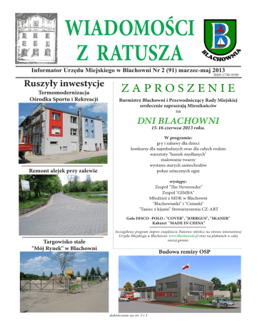 WIADOMOŚCI Z RATUSZA Informator Urzędu Miejskiego w Blachowni Nr 2 (91) marzec-maj 2013 Ruszyły inwestycje Termomodernizacja Ośrodka Sportu i Rekreacji ISSN 1730-9190 ZAPROSZENIE Burmistrz Blachowni i Przewodniczący Rady Miejskiej serdecznie zapraszają Mieszkańców na DNI BLACHOWNI 15-16 czerwca 2013 roku. Remont alejek przy zalewie W programie: gry i zabawy dla dzieci konkursy dla najmłodszych oraz dla całych rodzin warsztaty "baniek mydlanych" malowanie twarzy wystawa starych samochodów pokaz sztucznych ogni występy: Zespoł "The Neverender" Zespoł "GIMBA" Młodzież z MDK w Blachowni "Blachowianki" i "Cisianki" "Taniec z kijami" Stowarzyszenia CZ-ART Gala DISCO -POLO : "COVER", "JORRGUS", "SKANER" Kabaret "MADE IN CHINA" Targowisko stałe "Mój Rynek" w Blachowni Szczegółowy program imprez znajdziecie Państwo wkrótce na stronie internetowej Urzędu Miejskiego w Blachowni: www.blachownia.pl oraz na plakatach w całej naszej gminie. Budowa remizy OSP dokończenie na str. 2 i 3 Remont alejek przy zalewie W kwietniu rozpoczęła się rewitalizacja terenów przy zalewie. Wszystkie prace nad przywróceniem świetności tamtych terenów zostały podzielone na etapy. Pierwszym etapem jest renowacja alejek spacerowych. Alejki, które znamy zostały wybudowane w czynie społecznym w latach siedemdziesiątych dwudziestego wieku. Od tamtej pory straciły one wiele ze swojej urokliwości, pozarastały trawą, dzieła zniszczenia dopełniła trąba powietrzna, która nie oszczędziła drzew tuż przy zbiorniku. W pierwszym etapie do całkowitego remontu zostały zaplanowane alejki od przedłużenia ul. Kubowicza do stanicy harcerskiej. Prace mają zakończyć się w połowie czerwca, a wykonawcą jest firma INSTAL BUDOTECH z Lubszy, która złożyła podczas przetargu najkorzystniejszą ofertę. Przy nowych alejkach staną nowe ławeczki, kosze na śmieci i stylowe latarnie, co powinno nadać nadbrzeżnym alejkom niepowtarzalnego klimatu. Wygaśnięcie mandatu radnego Dnia 6 marca 2013 roku odbyła się nadzwyczajna sesja Rady Miejskiej w Blachowni, na której podjęta została uchwała nr 177/XXX/2013 w sprawie stwierdzenia wygaśnięcia mandatu radnego Marka Kułakowskiego. Wygaśnięcie mandatu spowodował fakt, iż radny jest członkiem zarządu dwóch wspólnot mieszkaniowych, w których Gmina Blachownia posiada swoje udziały. Ustawa z dnia 8 marca 1990 roku o samorządzie gminnym w art. 24f ust. 1 wprowadza zakaz prowadzenia przez radnych działalności gospodarczej na własny rachunek lub wspólnie z innymi osobami z wykorzystaniem mienia komunalnego gminy, w której radny uzyskał mandat, a także zarządzania przez radnych taką działalnością lub bycie przez nich przedstawicielem czy pełnomocnikiem w prowadzeniu takiej działalności. Radny Marek Kułakowski nie zgodził się z opinią Rady Miejskiej w Blachowni i zaskarżył uchwałę do Wojewódzkiego Sądu Administracyjnego w Gliwicach. Wojewódzki Sąd Administracyjny w Gliwicach po rozpoznaniu na rozprawie w dniu 9 maja 2013 r. sprawy oddalił skargę radnego. W związku z wygaśnięciem mandatu, po uprawomocnieniu się wyroku Wojewoda Śląski w ciągu 90 dni zarządza wybory uzupełniające do Rady Miejskiej w Blachowni. 2 WIA DO MO ŚCI Z RATUSZA Budowa remizy OSP Stara remiza jest w bardzo złym stanie. Po deszczu woda zalewała pomieszczenia niszcząc sprzęt, a sypiące się fragmenty ścian zagrażały strażakom przebywającym w budynku. Pod koniec 2012 roku wykonano prace remontowe, by druhowie mogli bezpiecznie wykonywać swoje obowiązki. Nowa strażnica zostanie wzniesiona na Placu Wolności. 29 kwietnia rozpoczęły się prace przy stawianiu ogrodzenia placu budowy a obecnie trwają pierwsze prace ziemne. W budynku nowej remizy będzie się znajdowała sala szkoleniowa, pomieszczenia socjalne, szatnie, magazyny, toalety, dyżurka. Hala garażowa pomieści 4 samochody. Zostanie zmieniona lokalizacja pomnika św. Floriana. Koniec prac budowlanych jest planowany na czwarty kwartał 2015 roku. Remizę wybuduje firma COPPER-POL z Pabianic, a koszt budowy to 1,3 mln zł. Targowisko stałe "Mój Rynek" w Blachowni W marcu br. rozpoczęły się roboty budowlane związane z budową targowiska stałego „Mój rynek w miejscowości Blachownia”. Wykonawca ww. zadania jest Firma Usługowo Handlowa - Maciej Dobosz z Krzepic. Zadanie to jest współfinansowane z środków Unii Europejskiej w ramach PROF. Na lata 2007-2013. Dofinansowanie zadania wynosi 50 %, pozostałe koszty pokryje Gmina Blachownia ze środków własnych. Termin zakończenia zgodnie z umową w drugiej połowie 2014 roku. Targowisko zlokalizowane jest przy ulicy Kubowicza na terenie dawnej oczyszczalni ścieków. W skład targowiska wchodzić będą 3 wiaty stałe z ladami stoisk handlowych wydzielone przegrodami zapewniającymi podział na 40 straganów oraz 3 wiaty handlowe umożliwiające handel z 18-u samochodów dostawczych pod zadaszeniem. Zadaszone stoiska zajmują 65 % powierzchni handlowej targowiska. Projekt przewiduje możliwości prowadzenia handlu bezpośrednio z samochodów - 17 stanowisk handlowych bez zadaszenia. Targowisko będzie utwardzone, oświetlone oraz posiadać będzie przyłącza do sieci wodociągowej, kanalizacyjnej i elektroenergetycznej. Projekt przewiduje również wykonanie zaplecza socjalno-sanitarnego na terenie placu targowego. Zagospodarowanie terenu targowiska przewiduje 33 miejsca parkingowe w tym również miejsca parkingowe dla osób niepełnosprawnych. Wyznaczone zostały również miejsca, w których mogą zostać ustawione stałe pawilony handlowe. Jest 15 takich miejsc i zostały zaplanowane z myślą o handlujących na targowisku przy ulicy Sportowej. Zaprojektowane targowisko zapewni dobre warunki higieniczne przyszłym użytkownikom. Łączna powierzchnia inwestycji wynosi 6.029m2 ZDRÓJ ULICZNY Przy ulicy Sienkiewicza w Blachowni wykonany został zdrój uliczny. Jest to urządzenie, które ma słu