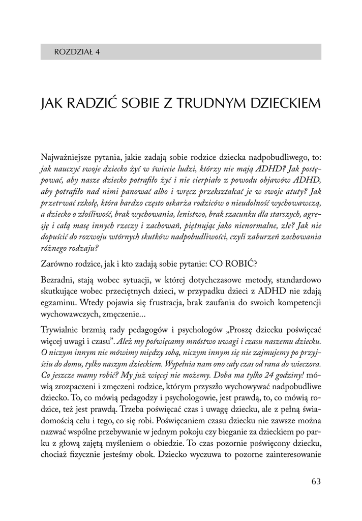 ROZDZIAŁ 4 JAK RADZIĆ SOBIE Z TRUDNYM DZIECKIEM Najważniejsze pytania, jakie zadają sobie rodzice dziecka nadpobudliwego, to: jak nauczyć swoje dziecko żyć w świecie ludzi, którzy nie mają ADHD? Jak postępować, aby nasze dziecko potrafiło żyć i nie cierpiało z powodu objawów ADHD, aby potrafiło nad nimi panować albo i wręcz przekształcać je w swoje atuty? Jak przetrwać szkołę, która bardzo często oskarża rodziców o nieudolność wychowawczą, a dziecko o złośliwość, brak wychowania, lenistwo, brak szacunku dla starszych, agresję i całą masę innych rzeczy i zachowań, piętnując jako nienormalne, złe? Jak nie dopuścić do rozwoju wtórnych skutków nadpobudliwości, czyli zaburzeń zachowania różnego rodzaju? Zarówno rodzice, jak i kto zadają sobie pytanie: CO ROBIĆ? Bezradni, stają wobec sytuacji, w której dotychczasowe metody, standardowo skutkujące wobec przeciętnych dzieci, w przypadku dzieci z ADHD nie zdają egzaminu. Wtedy pojawia się frustracja, brak zaufania do swoich kompetencji wychowawczych, zmęczenie... Trywialnie brzmią rady pedagogów i psychologów „Proszę dziecku poświęcać więcej uwagi i czasu”. Ależ my poświęcamy mnóstwo uwagi i czasu naszemu dziecku. O niczym innym nie mówimy między sobą, niczym innym się nie zajmujemy po przyjściu do domu, tylko naszym dzieckiem. Wypełnia nam ono cały czas od rana do wieczora. Co jeszcze mamy robić? My już więcej nie możemy. Doba ma tylko 24 godziny! mówią zrozpaczeni i zmęczeni rodzice, którym przyszło wychowywać nadpobudliwe dziecko. To, co mówią pedagodzy i psychologowie, jest prawdą, to, co mówią rodzice, też jest prawdą. Trzeba poświęcać czas i uwagę dziecku, ale z pełną świadomością celu i tego, co się robi. Poświęcaniem czasu dziecku nie zawsze można nazwać wspólne przebywanie w jednym pokoju czy bieganie za dzieckiem po parku z głową zajętą myśleniem o obiedzie. To czas pozornie poświęcony dziecku, chociaż fizycznie jesteśmy obok. Dziecko wyczuwa to pozorne zainteresowanie 63 i za wszelką cenę chce przyciągnąć uwagę dorosłego, wobec czego zaczyna się tak zachowywać, żeby rodzic poświęcił mu całą swoją uwagę i oderwał się od swoich myśli. Zachowuje się więc tak, że dorosły w końcu musi się nim zająć, zażegnując np. konflikt między dziećmi. Nawet wspólne pójście do kina nie zawsze można nazwać poświęcaniem czasu dziecku. Tata zaaferowany kupowaniem biletów, pogrążony w swoich myślach, tak naprawdę jest obok dziecka, chociaż w swoim przekonaniu może myśleć, że to jest właśnie to, o co prosił psycholog na ostatniej wizycie. Jest obecny, ale tak naprawdę nie ma go przy dziecku. Poświęcanie czasu i uwagi to bycie z dzieckiem, rozmawianie, wspólne robienie czegoś. Poświęcanie uwagi dziecku z nadpobudliwością psychoruchową jest na ogół czasochłonne, ale nie musi być udręką dla dorosłego, zwłaszcza jeśli rodzice rozsądnie podzielą się obowiązkami. Dziecko z ADHD wymaga od wszystkich dorosłych przebywających razem z nim większej uważności i mimo wszystko większej ilości czasu. Czy tak czy siak, rodzice będą poświęcać dziecku nadpobudliwemu więcej czasu niż jego nienadpobudliwemu rodzeństwu. Chodzi o to, żeby robić to tak, aby obie strony odnosiły z tego jakieś korzyści, czyli żeby dziecko zaczęło się lepiej zachowywać, a rodzice nie byli tak strasznie umęczeni. Czas dla dziecka z ADHD musi być czasem dość dobrze zaplanowanym. Plan pomoże rodzicom zapanować nad czasem, świadomość tego, co i kiedy będziemy robić, pozwala uniknąć niespodzianek, których dzieci z ADHD nie lubią, zapewni też pewien komfort psychiczny, najlepiej przecież wychodzą improwizacje dobrze zaplanowane. Rodzice mający świadomość tego, co i dlaczego robią, nie spalają się emocjonalnie tak bardzo jak rodzice działający jedynie intuicyjnie. Czas poświęcony dziecku sprzyja budowaniu więzi, pozwala zapobiegać niepożądanym zachowaniom i chronić rodzicielskie nerwy, a także daje dziecku poczucie, że może na dorosłego liczyć. 4.1. Metody, które się sprawdzają 4.1.1. Jak się uczymy? Jaś jak każde dziecko chce być grzeczny. Codziennie to słyszy. Już uszy go bolą od ciągłego wysłuchiwania Bądź grzeczny! Bądź grzeczny! Kiedy znowu słyszy słowo „grzeczny”, odwraca głowę albo zaczyna uśmiechać się nerwowo. To ściąga na niego gniew dorosłych, bo jest podejrzewany o złośliwość. 64 Dzisiaj nie wytrzymał i wykrzyczał mamie: Ale co to znaczy „Bądź grzeczny?”!!!! Co to znaczy??!!! Mamo powiedz mi, co to znaczy „Bądź grzeczny”?! Naucz mnie być grzecznym!! Ja chcę być grzeczny! Tylko nie wiem jak!! Potem się rozpłakał. Jakże wiele dzieci przeżywa to samo, co Jaś. To dorośli powinni nauczyć dzieci, jak być grzecznym. Zanim jednak to zrobią, sami powinni sobie powiedzieć jasno i wyraźnie, co to znaczy być grzecznym. 4.1.2. No, właśnie, co to znaczy być grzecznym? To znaczy podporządkowywać się wymaganiom społecznym. A jakie są te wymagania? Jest ich tak dużo, że nie sposób byłoby ich skatalogować, bo to i „nie trzaskaj drzwiami”, i „nie biegaj”, i „nie hałasuj”, i „mów dzień dobry”, i „nie odpowiadaj niepytany”, i „zachowuj dystans do dorosłych i przełożonych”, i „zakładaj kapcie w domu” – od najbardziej ogólnych do bardzo szczegółowych. My na co dzień tych reguł sobie nie uświadamiamy i stosujemy się do nich odruchowo. Większość dzieci przyswaja sobie je bardzo szybko, nie powiem, że bezboleśnie, bo niekiedy muszą zderzyć się z twardym rodzicielskim „nie”, ale dość szybko orientują się, co wolno, a czego nie wolno robić. Ta wiedza pomaga przetrwać najpierw w grupie rówieśniczej, a potem w społeczeństwie, pozwala na znalezienie partnera życiowego, pracy, odczuwanie satysfakcji z tego, co się robi. Dzie