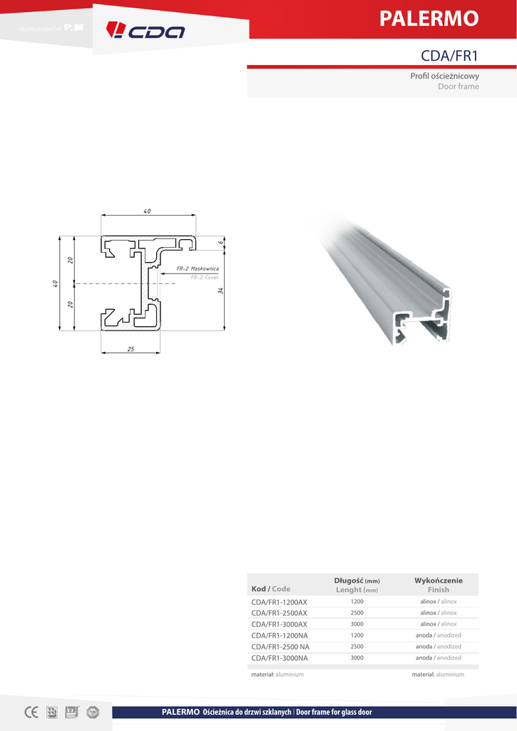 PALERMO Quality product of CDA/FR1 Profil ościeżnicowy Door frame 20 6 40 20 34 40 FR-2 Maskownica FR-2 Cover 25 Kod / Code CDA/FR1-1200AX CDA/FR1-2500AX CDA/FR1-3000AX CDA/FR1-1200NA CDA/FR1-2500 NA CDA/FR1-3000NA Długość (mm) Lenght (mm) Wykończenie Finish 1200 alinox / alinox 2500 alinox / alinox 3000 alinox / alinox 1200 anoda / anodized 2500 anoda / anodized 3000 anoda / anodized materiał: aluminium PALERMO Ościeżnica do drzwi szklanych І Door frame for glass door material: aluminium PALERMO Quality product of PALERMO Ościeżnica do drzwi szklanych, stosowana przy szklanych ścianach działowych Door frame, installed on glass partition walls Detal 1 / Detail 1 FCM lub DRM Listwa montażowa FCM or DRM Panel rail FR-F BRACKET Kątownik stabilizujący FR-F BRACKET Corner bracket Detal 1 / Detail 1 FR-BRACKET Kątownik montażowy górny FR-BRACKET Top mounting bracket FR1 Profil ościeżnicowy FR1 Door frame FR2 Maskownica FR2 Cover FR-U01 lub FR-U02 Uszczelka ościeżnicowa FR1 Profil ościeżnicowy FR-U01 or FR-U02 Door frame seal FR1 Door frame Detal 2 / Detail 2 FR2 Maskownica FR2 Cover Detal 2 / Detail 2 FR-U01 lub FR-U02 Uszczelka ościeżnicowa Uszczelka FCMRS Seal FCMRS FR-U01 or FR-U02 Door frame seal Uszczelka międzyszybowa Interpanel seal FCM lub DRM Listwa montażowa FCM or DRM Panel Rail FR1 Profil ościeżnicowy FR1 Door frame FR-M-BRACKET Kątownik montażowy podłogowy FR-M-BRACKET Floor mounting bracket Akcesoria: montaż ościeżnicy do szklanych ścian działowych Accesories: montage glass door frame to glass partition walls Produkt / Produkt Sztuk / Pcs profil ościeżnicowy / door frame zgodnie z projektem according to project maskownica / cover zgodnie z projektem according to project kątownik stabilizujący / corner bracket 2 kątownik montażowy górny / top mounting bracket 2 kątownik montażowy podłogowy / floor mounting bracket 2 uszczelka ościeżnicowa FR-U01 lub FR-U02 door frame seal FR-U01 or FR-U02 zgodnie z projektem according to project uszczelka boczna do montażu panela szklanego ścianki FCMRS side door frame seal FCMRS for glass of partition walls zgodnie z projektem according to project grubość szkła (mm): 8; 10; 12 glass thickness (mm): 8; 10; 12 Przycięcie profili na wymiar wg indywidualnych wskazań Profiles can be cut according to project PALERMO Ościeżnica do drzwi szklanych І Door frame for glass door PALERMO Quality product of PALERMO Ościeżnica do drzwi szklanych montowana do ściany Door frame, wall montage Detal 1 / Detail 1 FR-F BRACKET Kątownik stabilizujący FR-F BRACKET Corner bracket FR-BRACKET Kątownik montażowy górny FR-BRACKET Top mounting bracket Detal 1 / Detail 1 FR1 Profil ościeżnicowy FR1 Door frame FR2 Maskownica FR2 Cover FR-U01 lub FR-U02 Uszczelka ościeżnicowa FR-U01 or FR-U02 Door frame seal FR1 Profil ościeżnicowy FR1 Door frame Akcesoria: montaż ościeżnicy do ściany Accesories: montage glass frame door to wall Produkt / Produkt Sztuk / Pcs profil ościeżnicowy / door frame zgodnie z projektem according to project maskownica / cover zgodnie z projektem according to project kątownik stabilizujący / corner bracket kątownik montażowy górny / top mounting bracket uszczelka ościeżnicowa FR-U01 lub FR-U02 door frame seal FR-U01 or FR-U02 2 2 zgodnie z projektem according to project grubość szkła (mm): 8; 10; 12 glass thickness (mm): 8; 10; 12 Przycięcie profili na wymiar wg indywidualnych wskazań Profiles can be cut according to project PALERMO Ościeżnica do drzwi szklanych І Door frame for glass door PALERMO Quality product of Profil ościeżnicowy PALERMO A Widok: profil ościeżnicowy PALERMO View: door frame PALERMO Zalecane / Recommended DRM Listwa montażowa DRM Panel rail Panel stały Side fixed panel Naświetle Overpanel Drzwi Door IS10-180 Uszczelka międzyszybowa IS10-180 Interpanel seal Panel stały Side fixed panel FR1 Profil ościeżnicowy FR1 Door frame B Opcjonalnie: profil dolny ze szczotką przeciwkurzową, seria FROSINONE Optional: bottom panel rail with bristle FROSINONE series A FCM lub DRM Listwa montażowa FCM or DRM Panel rail Zalecane / Recommended DRM Listwa montażowa DRM Panel rail Panel stały Side fixed panel IS10-180 Uszczelka międzyszybowa IS10-180 Interpanel seal Drzwi Door FR1 Profil ościeżnicowy FR1 Door frame B FCM lub DRM Listwa montażowa FCM or DRM Panel rail Opcjonalnie: profil dolny ze szczotką przeciwkurzową, seria FROSINONE Optional: bottom panel rail with bristle FROSINONE series Panel stały Side fixed panel PALERMO Ościeżnica do drzwi szklanych І Door frame for glass door PALERMO Quality product of Profil ościeżnicowy PALERMO Przekrój: profil ościeżnicowy PALERMO Section: door frame PALERMO A-A B-B 21 34 4 H 25 48 FR1 Profil ościeżnicowy FR1 Door frame H 5 Zalecane / Recommended DRM 38 Listwa montażowa DRM 38 Panel rail FR1 Profil ościeżnicowy FR1 Door frame ≈8 ≈8 Profil dolny FCM lub DRM Bottom profile FCM or DRM PALERMO Ościeżnica do drzwi szklanych І Door frame for glass door