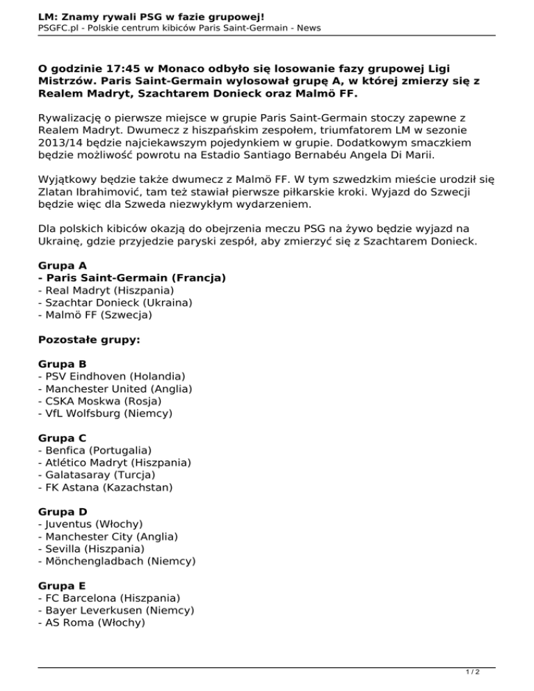 LM: Znamy rywali PSG w fazie grupowej! PSGFC.pl - Polskie centrum kibiców Paris Saint-Germain - News O godzinie 17:45 w Monaco odbyło się losowanie fazy grupowej Ligi Mistrzów. Paris Saint-Germain wylosował grupę A, w której zmierzy się z Realem Madryt, Szachtarem Donieck oraz Malmö FF. Rywalizację o pierwsze miejsce w grupie Paris Saint-Germain stoczy zapewne z Realem Madryt. Dwumecz z hiszpańskim zespołem, triumfatorem LM w sezonie 2013/14 będzie najciekawszym pojedynkiem w grupie. Dodatkowym smaczkiem będzie możliwość powrotu na Estadio Santiago Bernabéu Angela Di Marii. Wyjątkowy będzie także dwumecz z Malmö FF. W tym szwedzkim mieście urodził się Zlatan Ibrahimović, tam też stawiał pierwsze piłkarskie kroki. Wyjazd do Szwecji będzie więc dla Szweda niezwykłym wydarzeniem. Dla polskich kibiców okazją do obejrzenia meczu PSG na żywo będzie wyjazd na Ukrainę, gdzie przyjedzie paryski zespół, aby zmierzyć się z Szachtarem Donieck. Grupa A - Paris Saint-Germain (Francja) - Real Madryt (Hiszpania) - Szachtar Donieck (Ukraina) - Malmö FF (Szwecja) Pozostałe grupy: Grupa B - PSV Eindhoven (Holandia) - Manchester United (Anglia) - CSKA Moskwa (Rosja) - VfL Wolfsburg (Niemcy) Grupa C - Benfica (Portugalia) - Atlético Madryt (Hiszpania) - Galatasaray (Turcja) - FK Astana (Kazachstan) Grupa D - Juventus (Włochy) - Manchester City (Anglia) - Sevilla (Hiszpania) - Mönchengladbach (Niemcy) Grupa E - FC Barcelona (Hiszpania) - Bayer Leverkusen (Niemcy) - AS Roma (Włochy) 1/2 LM: Znamy rywali PSG w fazie grupowej! PSGFC.pl - Polskie centrum kibiców Paris Saint-Germain - News - BATE Borysów (Białoruś) Grupa F - Bayern Monachium (Niemcy) - Arsenal FC (Anglia) - Olympiakos (Grecja) - Dinamo Zagrzeb (Chorwacja) Grupa G - Chelsea FC (Anglia) - FC Porto (Portugalia) - Dynamo Kijów (Ukraina) - Maccabi Tel-Aviv (Izrael) Grupa H - Zenit Sankt-Petersburg (Rosja) - Valencia CF (Hiszpania) - Olympique Lyon (Francja) - KAA Gent (Belgia) Pierwsza kolejka fazy grupowej LM odbędzie się w dniach 15-16 września 2015. Pełny terminarz spotkań PSG dostępny tutaj. Autor: Bercik 2/2 Powered by TCPDF (www.tcpdf.org)
