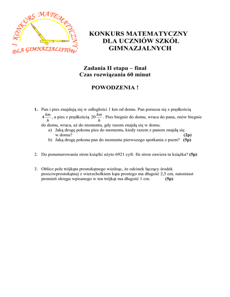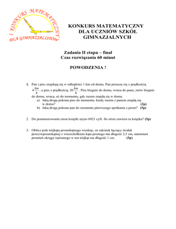 KONKURS MATEMATYCZNY DLA UCZNIÓW SZKÓŁ GIMNAZJALNYCH Zadania II etapu – finał Czas rozwiązania 60 minut POWODZENIA ! 1. Pan i pies znajdują się w odległości 1 km od domu. Pan porusza się z prędkością km km 4 , a pies z prędkością 20 . Pies biegnie do domu, wraca do pana, znów biegnie h h do domu, wraca, aż do momentu, gdy razem znajdą się w domu. a) Jaką drogę pokona pies do momentu, kiedy razem z panem znajdą się w domu? (2p) b) Jaką drogę pokona pan do momentu pierwszego spotkania z psem? (5p) 2. Do ponumerowania stron książki użyto 6921 cyfr. Ile stron zawiera ta książka? (5p) 3. Oblicz pole trójkąta prostokątnego wiedząc, że odcinek łączący środek przeciwprostokątnej z wierzchołkiem kąta prostego ma długość 2,5 cm, natomiast promień okręgu wpisanego w ten trójkąt ma długość 1 cm. (5p) ROZWIĄZANIA ZADAŃ Zadanie 1. Oznaczmy: V1 – prędkość pana V2 – prędkość psa S- droga t - czas 1 km 1 = h . W tym czasie km 4 4 h km km 1 pies poruszający się z prędkością V2 = 20 pokona drogę S = 20 ⋅ h = 5 km h h 4 Odpowiedź do a) Pies pokona drogę 5km. a) Ze wzoru S = V ⋅ t , obliczamy czas dojścia pana do domu t1 = b) Pies pokona drogę 1 km do domu z prędkością V2 = 20 t= km w czasie h 1 km 1 = h. km 20 20 h W tym samym czasie pan przejdzie drogę S = 4 km 1 1 ⋅ h = km , więc do domu 5 h 20 pozostało mu 0,8 km. Pan 0,2 km Pies Sx 0,8 - Sx Miejsce spotkania pana i psa Oznaczmy: Sx – droga pokonana przez pana do momentu pierwszego spotkania z psem 0,8 – Sx - droga pokonana przez psa do momentu spotkania Sx 0,8 − s x = . Rozwiązując powyższe Czasy poruszania się psa i pana są takie same, więc km km 4 20 h h 2 równanie otrzymujemy S x = km . Łączna droga pokonana przez pana do momentu 15 1 2 1 pierwszego spotkania z psem: S = km + km = km 5 15 3 Zadanie 2. Ilość cyfr potrzebnych do ponumerowania stron od 1 do 9 1*9 cyfr = 9 cyfr Ilość cyfr potrzebnych do ponumerowania stron od 10 do 99 2* 90 cyfr = 180 cyfr Ilość cyfr potrzebnych do ponumerowania stron od 100 do 999 3*900 cyfr = 2700 cyfr Ilość cyfr potrzebnych do ponumerowania stron od 1000 do 1999 4*1000 cyfr = 4000 cyfr Daje to razem 6889 cyfr. Z treści zadania wynika, że użyto 6921 cyfr, a więc musimy jeszcze użyć 6921-6889=32 cyfr. Ponieważ numerujemy już strony od 2000, więc 32 cyframi ponumerujemy jeszcze 8 stron. Tak więc książka ma 1999+8=2007 stron. Odp. Książka ma 20007 stron. Zadanie 3. Ponieważ środkowa z wierzchołka kąta A prostego jest równa 2,5 cm, więc przeciwprostokatna tego trójkąta jest G równa 5 cm. D Ponieważ okrąg jest wpisany w trójkąt O prostokątny, więc ze wzoru F 1 r = (a + b − c ) , gdzie a,b są 2 C B przyprostokątnymi trójkąta prostokątnego, E c – przeciwprostokątna, r- promień okręgu wpisanego w ten trójkąt, otrzymujemy 1 1 = (a + b − 5) , stąd a + b = 7 2 Z twierdzenia Pitagorasa otrzymujemy: a 2 + b 2 = 5 2 . Przekształcając ten wzór otrzymujemy: (a + b )2 − 2ab = 25 , 7 2 − 2ab = 25 , 2ab = 24 , 2ab = 24 , 1 ab = 6 2 2 Odpowiedź: Pole trójkąta wynosi 6cm .