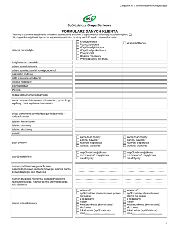 Załącznik nr 3 do Podręcznika kredytowego FORMULARZ DANYCH KLIENTA Prosimy o czytelne wypełnienie wniosku i zaznaczenie znakiem X odpowiednich informacji w polach wyboru W przypadku wątpliwości podczas wypełniania wniosku prosimy zwrócić się do pracownika banku. relacja do kredytu: Kredytobiorca PoŜyczkobiorca Współkredytobiorca WspólpoŜyczkobiorca Poręczyciel DłuŜnik rzeczowy Przystępujący do długu . WspółmałŜonek imię/imiona i nazwisko adres zameldowania adres zamieszkania/ korespondencji nazwisko rodowe data i miejsce urodzenia imiona rodziców obywatelstwo PESEL rodzaj dokumentu toŜsamości seria i numer dokumentu toŜsamości, przez kogo wydany, data wydania dokumentu drugi dokument potwierdzający toŜsamość – rodzaj i numer telefon komórkowy telefon domowy telefon słuŜbowy e-mail stan cywilny ustrój małŜeński numer podstawowego rachunku oszczędnościowo-rozliczeniowego, nazwa banku prowadzącego, rok otwarcia numer drugiego rachunku oszczędnościoworozliczeniowego, nazwa banku prowadzącego, rok otwarcia status mieszkaniowy zamęŜna/ Ŝonaty panna/ kawaler rozwód/ separacja wdowa/ wdowiec zamęŜna/ Ŝonaty panna/ kawaler rozwód/ separacja wdowa/ wdowiec wspólność majątkowa rozdzielność majątkowa nie dotyczy wspólność majątkowa rozdzielność majątkowa nie dotyczy ………………..……………… ……………………………….. ……………………………… …………………………….... ................................................ ............................................ ……………………………… ……………………………… własność spółdzielcze własnościowe prawo do lokalu z rodzicami najem kwaterunkowe (komunalne) słuŜbowe lokatorskie (spółdzielcze) inne…………………………… własność spółdzielcze własnościowe prawo do lokalu z rodzicami najem kwaterunkowe (komunalne) słuŜbowe lokatorskie (spółdzielcze) inne…………………………… 1 podstawowe gimnazjalne zawodowe średnie/ pomaturalne inŜynier/ licencjat wyŜsze inne…………………… wykształcenie podstawowe gimnazjalne zawodowe średnie/ pomaturalne inŜynier/ licencjat wyŜsze inne…………………… zawód wykonywany nazwa pracodawcy adres zatrudnienia/ prowadzenia działalności gospodarczej, numer telefonu data zatrudnienia w obecnym miejscu pracy/data rozpoczęcia działalności gospodarczej; zajmowane stanowisko miesięczny podstawowy dochód netto z podstawowego źródła dochodu miesięczny dodatkowy dochód netto źródło dodatkowych dochodów stałe obciąŜenia dochodu z tytułu wyroków sądowych, świadczeń alimentacyjnych – wysokość obciąŜenia miesięcznego i ostateczny termin spłaty zobowiązania podatkowe – zaległe (kwota) i bieŜące (wysokość zobowiązania miesięcznego) przeciętne wydatki miesięczne z tytułu czynszu, energii, telefonu, itp. przeciętne wydatki miesięczne z tytułu utrzymania członków gospodarstwa domowego: wyŜywienie, odzieŜ, kultura itp. ( bez opłat z tyt. utrzymania mieszkania) liczba osób pozostających na utrzymaniu nie posiadających własnych dochodów Informacje o posiadanym majątku nieruchomości – adres rodzaj nieruchomości – wartość rynkowa lokaty (kwoty, waluta, okres, nazwa banku) udziały w przedsiębiorstwach, akcje, obligacje posiadane jednostki uczestnictwa TFI (kwota, nazwa Funduszu) Posiadane zobowiązania finansowe Zaciągnięte kredyty, poŜyczki kredyt poŜyczka kwota, waluta aktualnego zadłuŜenia miesięczna rata nazwa banku/oddział 2 data zaciągnięcia zobowiązania (data umowy) data spłaty zobowiązania (z umowy) kredyt poŜyczka kwota, waluta aktualnego zadłuŜenia miesięczna rata nazwa banku/oddział data zaciągnięcia zobowiązania (data umowy) data spłaty zobowiązania (z umowy) Przyznane limity kredytowe kwota, waluta przyznanego limitu nazwa banku/oddział data zaciągnięcia zobowiązania (data umowy) data spłaty zobowiązania (z umowy) kwota, waluta przyznanego limitu nazwa banku/oddział data zaciągnięcia zobowiązania (data umowy) data spłaty zobowiązania (z umowy) Zobowiązania z tytułu udzielonych poręczeń kredyt poŜyczka kwota, waluta aktualnego zadłuŜenia miesięczna rata nazwa banku/oddział data zaciągnięcia zobowiązania (data umowy) data spłaty zobowiązania (z umowy) kwota, waluta aktualnego zadłuŜenia miesięczna rata nazwa banku/oddział data zaciągnięcia zobowiązania (data umowy) data spłaty zobowiązania (z umowy) kredyt poŜyczka Ubiegam się o kredyt/poŜyczkę w innym banku: nie tak podać nazwę banku i adres oddziału Inne zobowiązania: nie tak podać tytuł zobowiązania, rodzaj zobowiązania, kwotę obecnego zadłuŜenia, datę zaciągnięcia zobowiązania, datę spłaty zobowiązania itp. Korespondencja: zgoda tylko na materiały informacyjne brak ograniczeń brak zgody na materiały informacyjne Oświadczam, Ŝe moja kondycja finansowa jest / nie jest uzaleŜniona pośrednio lub bezpośrednio od powiązania z członkiem organu banku (Zarządu Banku, Rady Nadzorczej Banku) lub osobą zajmującą stanowisko kierownicze w banku (pracownik banku podlegający bezpośrednio członkom Zarządu Banku oraz dyrektorzy oddziałów banku, ich zastępcy i główni księgowi). Rodzaj powiązania ………. Pobiedzisko-Gośliński Bank Spółdzielczy w Pobiedziskach (dalej Bank) zgodnie z art. 24 ust. 1 ustawy z dnia 29 sierpnia 1997 r. o ochronie danych osobowych (j. t. Dz. U. z 2002 r., nr 101, poz. 926 ze zm.) informuje, iŜ jest Administratorem podanych przez Pana/Panią danych osobowych. Dane będą przetwarzane przez bank w celu oceny zdolności kredytowej oraz analizy ryzyka kredytowego, zawierania i wykonywania czynności bankowych, a takŜe w celu promocji i marketingu działalności prowadzonej przez bank. Na podstawie art. 32 ustawy o ochronie danych osobowych ma Pan/Pani prawo do dostępu do treści oraz poprawian