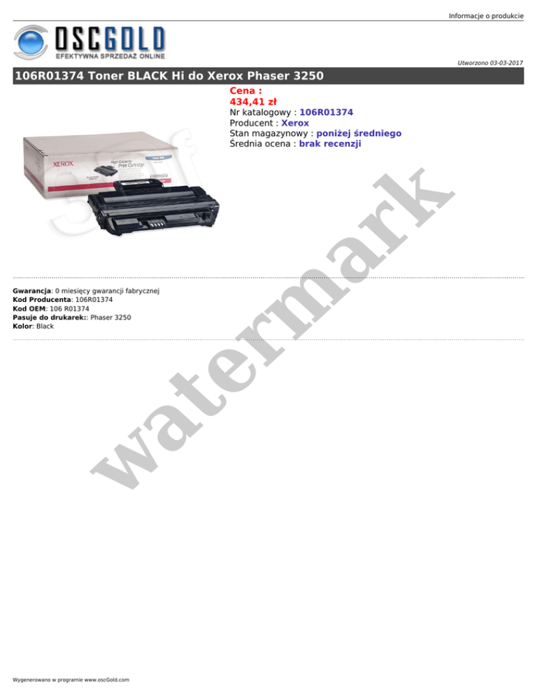 Informacje o produkcie Utworzono 03-03-2017 106R01374 Toner BLACK Hi do Xerox Phaser 3250 Cena : 434,41 zł er m ar k Nr katalogowy : 106R01374 Producent : Xerox Stan magazynowy : poniżej średniego Średnia ocena : brak recenzji w at Gwarancja: 0 miesięcy gwarancji fabrycznej Kod Producenta: 106R01374 Kod OEM: 106 R01374 Pasuje do drukarek:: Phaser 3250 Kolor: Black Wygenerowano w programie www.oscGold.com