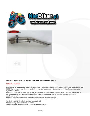 Wydech Dominator do Suzuki Gsxf 600 1988-06 MotoGP II SYMBOL: SU023D Dominator to nowa era wydechów. Zostały w nim zastosowane profesjonalne wełny wygłuszające do 1100'C oraz wełny nierdzewne co jest gwarancją idealnego i równomiernego tłumienia przez całą żywotność tłumika. Nowe tłoczone dekle zawdzięczające bardzo mocne połączenie nitowe. Dzięki licznym modyfikacją rur dolotowych mamy mniej połączeń sprawnych, pomogły w tym giętarki trzepieniowe oraz roztłaczarki rur. Poprzez wprowadzenie tych ulepszeń poprawił się również design. Wydech MotoGP II krótki, poziom hałasu 94dB W zestawie poza końcówką są także: - obejma podtrzymuje tłumik (z gumą amortyzującą) Strona 1 z 2 - rura dolotowa - obejma na kolektor - obejma na łączenie wydechu z rurą dolotową GWARANCJA 5 LAT !!! UWAGA! Przy zapłacie z góry rabat 7% - (529zł - 7% = 492 zł plus 15zł wysyłka czyli razem 507zł przy pobraniu 529zł plus 25zł wysyłka 554zł) Akcesoria ( dodatki) to tłumika : - DBkiller Dominator Hard - DBkiller Dominator Medium - Poszycie Carbonowe tłumika Dominator - Poszycie satynowe tłumika Dominator - Poszycie tytanowe tłumika Dominator Strona 2 z 2
