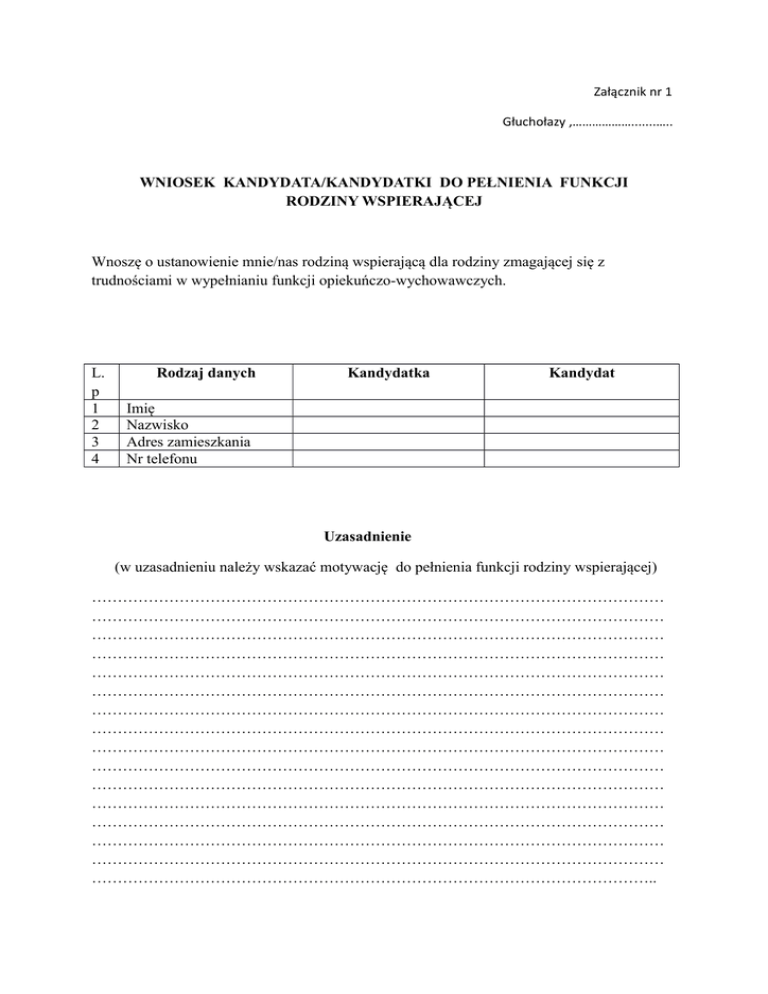 Załącznik nr 1 Głuchołazy ,……………….......….. WNIOSEK KANDYDATA/KANDYDATKI DO PEŁNIENIA FUNKCJI RODZINY WSPIERAJĄCEJ Wnoszę o ustanowienie mnie/nas rodziną wspierającą dla rodziny zmagającej się z trudnościami w wypełnianiu funkcji opiekuńczo-wychowawczych. L. p 1 2 3 4 Rodzaj danych Kandydatka Kandydat Imię Nazwisko Adres zamieszkania Nr telefonu Uzasadnienie (w uzasadnieniu należy wskazać motywację do pełnienia funkcji rodziny wspierającej) ………………………………………………………………………………………………… ………………………………………………………………………………………………… ………………………………………………………………………………………………… ………………………………………………………………………………………………… ………………………………………………………………………………………………… ………………………………………………………………………………………………… ………………………………………………………………………………………………… ………………………………………………………………………………………………… ………………………………………………………………………………………………… ………………………………………………………………………………………………… ………………………………………………………………………………………………… ………………………………………………………………………………………………… ………………………………………………………………………………………………… ………………………………………………………………………………………………… ………………………………………………………………………………………………… ………………………………………………………………………………………………..