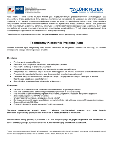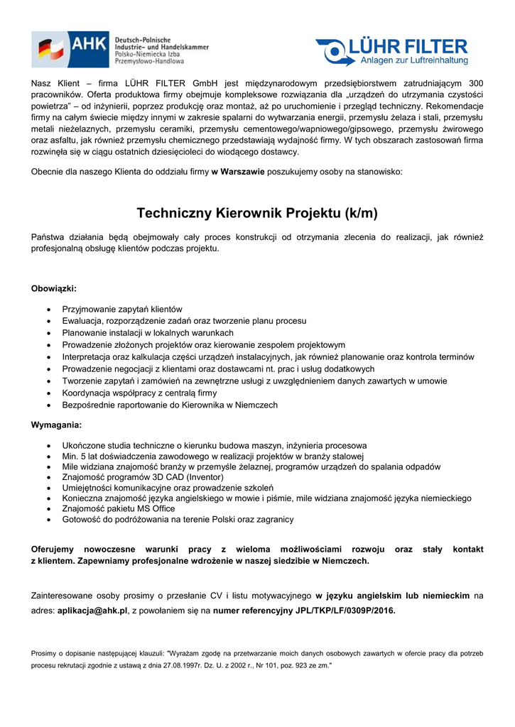 Nasz Klient – firma LÜHR FILTER GmbH jest międzynarodowym przedsiębiorstwem zatrudniającym 300 pracowników. Oferta produktowa firmy obejmuje kompleksowe rozwiązania dla „urządzeń do utrzymania czystości powietrza” – od inżynierii, poprzez produkcję oraz montaż, aż po uruchomienie i przegląd techniczny. Rekomendacje firmy na całym świecie między innymi w zakresie spalarni do wytwarzania energii, przemysłu żelaza i stali, przemysłu metali nieżelaznych, przemysłu ceramiki, przemysłu cementowego/wapniowego/gipsowego, przemysłu żwirowego oraz asfaltu, jak również przemysłu chemicznego przedstawiają wydajność firmy. W tych obszarach zastosowań firma rozwinęła się w ciągu ostatnich dziesięcioleci do wiodącego dostawcy. Obecnie dla naszego Klienta do oddziału firmy w Warszawie poszukujemy osoby na stanowisko: Techniczny Kierownik Projektu (k/m) Państwa działania będą obejmowały cały proces konstrukcji od otrzymania zlecenia do realizacji, jak również profesjonalną obsługę klientów podczas projektu. Obowiązki: Przyjmowanie zapytań klientów Ewaluacja, rozporządzenie zadań oraz tworzenie planu procesu Planowanie instalacji w lokalnych warunkach Prowadzenie złożonych projektów oraz kierowanie zespołem projektowym Interpretacja oraz kalkulacja części urządzeń instalacyjnych, jak również planowanie oraz kontrola terminów Prowadzenie negocjacji z klientami oraz dostawcami nt. prac i usług dodatkowych Tworzenie zapytań i zamówień na zewnętrzne usługi z uwzględnieniem danych zawartych w umowie Koordynacja współpracy z centralą firmy Bezpośrednie raportowanie do Kierownika w Niemczech Wymagania: Ukończone studia techniczne o kierunku budowa maszyn, inżynieria procesowa Min. 5 lat doświadczenia zawodowego w realizacji projektów w branży stalowej Mile widziana znajomość branży w przemyśle żelaznej, programów urządzeń do spalania odpadów Znajomość programów 3D CAD (Inventor) Umiejętności komunikacyjne oraz prowadzenie szkoleń Konieczna znajomość języka angielskiego w mowie i piśmie, mile widziana znajomość języka niemieckiego Znajomość pakietu MS Office Gotowość do podróżowania na terenie Polski oraz zagranicy Oferujemy nowoczesne warunki pracy z wieloma możliwościami rozwoju z klientem. Zapewniamy profesjonalne wdrożenie w naszej siedzibie w Niemczech. oraz stały kontakt Zainteresowane osoby prosimy o przesłanie CV i listu motywacyjnego w języku angielskim lub niemieckim na adres: [email protected], z powołaniem się na numer referencyjny JPL/TKP/LF/0309P/2016. Prosimy o dopisanie następującej klauzuli: "Wyrażam zgodę na przetwarzanie moich danych osobowych zawartych w ofercie pracy dla potrzeb procesu rekrutacji zgodnie z ustawą z dnia 27.08.1997r. Dz. U. z 2002 r., Nr 101, poz. 923 ze zm."