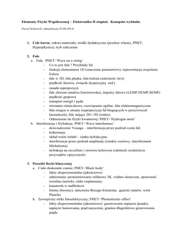 Elementy Fizyki Współczesnej – Elektronika II stopień. Konspekt wykładu. Paweł Scharoch; aktualizacja 02.06.2014r. 1. Cele kursu; zakres materiału; środki dydaktyczne (przekaz własny, PHET, Hyperphysics); tryb zaliczenia 2. Fale a. Fala. PHET-‘Wave on a string’ - Co to jest fala ? Przykłady fal - funkcja elementarna 1D (znaczenie parametrów); reprezentacja zespolona Eulera - fale w 3D; fala płaska, fala kulista (zależność A(r)) - prędkość fazowa; związek dyspersyjny (k ) - zasada superpozycji fale złożone (analiza fourierowska), impulsy falowe (LEMP,NEMP,SEMP) prędkość grupowa transport energii i pędu równanie różniczkowe, rozwiązanie ogólne; fala elektromagnetyczna fala stojąca w strunie (superpozycja fal biegnących w przeciwnych kierunkach); fale stojące 2D i 3D (wideo). - Odniesienie do fizyki kwantowej: PHET-‘Hydrogen atom’ b. Interferencja i Dyfrakcja. PHET-‘Wave interference’ - doświadczenie Younga – interferencja przez podział czoła fali - koherencja - układ wielu źródeł – siatka dyfrakcyjna - interferencja przez podział amplitudy (cienkie warstwy, interferometr Michelsona) - dyfrakcja na szczelinie i otworze kołowym (zdolność rozdzielcza przyrządów optycznych) 3. Porażki fizyki klasycznej a. Ciało doskonale czarne; PHET-‘Black body’ - fakty eksperymentalne (jakościowe) - odniesienia: promieniowanie reliktowe 3K, widmo słoneczne, sprawność świetlna żarówki, efekt cieplarniany - katastrofa w nadfiolecie - fotony (bozony), statystyka Bozego-Einsteina, gęstość stanów, wzór Plancka b. Zewnętrzny efekt fotoelektryczny; PHET-‘Photoelectric effect’ - fakty eksperymentalne (jakościowe): generowanie napięcia (prądu), napięcie hamowania, prąd nasycenia, granica długofalowa generowania prądu - hipoteza Einsteina c. Widma liniowe promieniowania zjonizowanych gazów; PHET-‘Hydrogen atom’ - fakty doświadczalne – odniesienie do budowy atomu - pierwsze modele (kula bilardowa, „ciastko z rodzynkami”, modele planetarne - odkrycie jadra atomowego (Rutheford, 1907) - model atomu wodoru Bohra - hipoteza de Broglie’a - eksperyment Davissona-Germera - odniesienie do modelu Bohra 4. Idee mechaniki kwantowej. Wideo - „Diffraction of electrons on a double slit” a. Dyskusja i interpretacja obrazu dyfrakcyjnego - koncepcja funkcji falowej - interpretacja probabilistyczna Borna - zasada superpozycji (układ kwantowy jednocześnie w wielu stanach) - pomiar w fizyce kwantowej: kolaps funkcji falowej (detekcja przejścia przez szczelinę, ekran jako „miernik” położenia) - koherencja – dekoherencja - eksperyment myślowy: paradoks Kota Schrödingera - problem przyczynowości (hipoteza ukrytych zmiennych) i lokalności; paradoks EPR (na przykładzie dwóch splątanych fotonów) b. Równanie Schrödingera - cząstka swobodna - obecność studni potencjału - niezależne od czasu (stacjonarne ) równanie Schrödingera; zagadnienie własne - przykład: nieskończona studnia potencjału c. Wielkości fizyczne (obserwable) i reprezentujące je operatory - przestrzeń liniowa funkcji (Hilberta), iloczyn wewnętrzny - operatory samosprzężone; zagadnienie własne -> twierdzenie spektralne - przykłady operatorów: energii, pędu, położenia, momentu pędu - wartości pomiarów wielkości fizycznej dla układu w stanie ψ; wartość średnia (oczekiwana) wielkości fizycznej - nieoznaczoność wielkości fizycznej (odchylenie standardowe), odróżnienie od niepewności pomiaru - operatory komutujące i niekomutujące - zasada nieoznaczoności Heisenberga 5. Elementarne układy kwantowe, modelowe i rzeczywiste a. Atom wodoru b. Atomy wieloelektronowe: zasada tworzenia układu okresowego c. Pojedyncza studnia kwantowa: prostokątna, paraboliczna, 1/r (elementarny model atomu) d. Podwójna studnia: elementarny model cząsteczki (wiązanie kowalencyjne vs. wiązanie jonowe) e. Układ jednakowych studni: elementarny model kryształu, pasma energetyczne; metale, dielektryki, półprzewodniki w obrazie modelu elementarnego; wzbudzenia elektryczne (metale vs. dielektryki); wzbudzenia termiczne -> rozkład Fermiego-Diraca, poziom Fermiego (zależność przewodnictwa od temperatury w metalach i półprzewodnikach) ; wzbudzenia optyczne (absorpcja i rekombinacja międzypasmowa , inne rodzaje absorpcji, transmisja, odbicie) 6. Elementy fizyki układów atomowych a. Periodyczne, nieskończone układy atomowe (3D,2D 1D) b. Równanie Schrödingera; funkcja Blocha; struktura pasmowa; przerwa wzbroniona c. Półprzewodniki domieszkowane, typu n i typu p d. Stopy półprzewodnikowe (sterowanie własnościami elektronowymi) 7. Wybrane zastosowania układów kwantowych a. LASER – zasada działania b. Złącze p-n: podstawowe własności fizyczne i ich zastosowania; tworzenia naturalnej bariery potencjału (własności prostujące w obwodach); separacja generowanych optycznie par elektron-dziura (baterie słoneczne, detektory); optyczna rekombinacja międzypasmowa w obszarze złącza (LEDy, lasery półprzewodnikowe) c. Tranzystor; sterowanie, przetwarzanie informacji (bramki logiczne) e. Spojrzenie w przyszłość: kropki kwantowe; solotronika -> przykład: tranzystor na pojedynczym atomie (atom fosforu na powierzchni krzemu)
