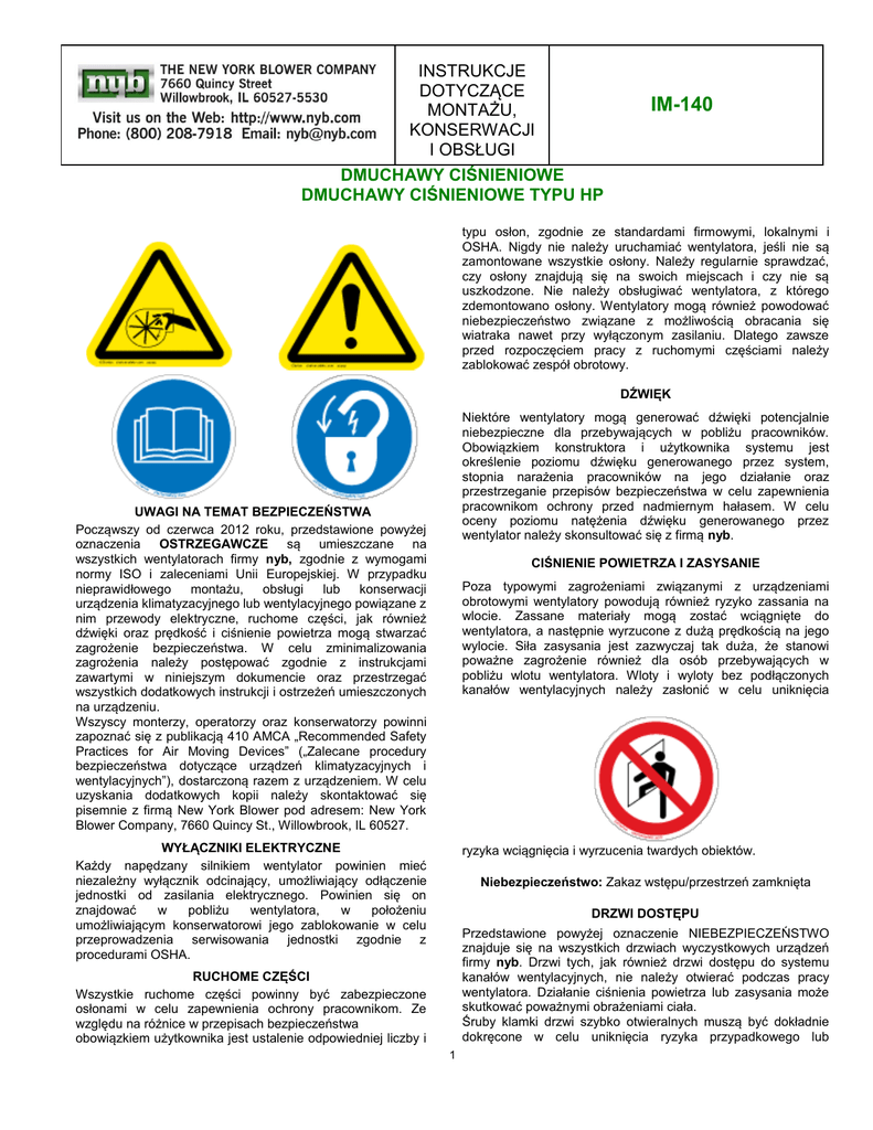 INSTRUKCJE DOTYCZĄCE MONTAŻU, KONSERWACJI I OBSŁUGI DMUCHAWY CIŚNIENIOWE DMUCHAWY CIŚNIENIOWE TYPU HP IM-140 typu osłon, zgodnie ze standardami firmowymi, lokalnymi i OSHA. Nigdy nie należy uruchamiać wentylatora, jeśli nie są zamontowane wszystkie osłony. Należy regularnie sprawdzać, czy osłony znajdują się na swoich miejscach i czy nie są uszkodzone. Nie należy obsługiwać wentylatora, z którego zdemontowano osłony. Wentylatory mogą również powodować niebezpieczeństwo związane z możliwością obracania się wiatraka nawet przy wyłączonym zasilaniu. Dlatego zawsze przed rozpoczęciem pracy z ruchomymi częściami należy zablokować zespół obrotowy. DŹWIĘK Niektóre wentylatory mogą generować dźwięki potencjalnie niebezpieczne dla przebywających w pobliżu pracowników. Obowiązkiem konstruktora i użytkownika systemu jest określenie poziomu dźwięku generowanego przez system, stopnia narażenia pracowników na jego działanie oraz przestrzeganie przepisów bezpieczeństwa w celu zapewnienia pracownikom ochrony przed nadmiernym hałasem. W celu oceny poziomu natężenia dźwięku generowanego przez wentylator należy skonsultować się z firmą nyb. UWAGI NA TEMAT BEZPIECZEŃSTWA Począwszy od czerwca 2012 roku, przedstawione powyżej oznaczenia OSTRZEGAWCZE są umieszczane na wszystkich wentylatorach firmy nyb, zgodnie z wymogami normy ISO i zaleceniami Unii Europejskiej. W przypadku nieprawidłowego montażu, obsługi lub konserwacji urządzenia klimatyzacyjnego lub wentylacyjnego powiązane z nim przewody elektryczne, ruchome części, jak również dźwięki oraz prędkość i ciśnienie powietrza mogą stwarzać zagrożenie bezpieczeństwa. W celu zminimalizowania zagrożenia należy postępować zgodnie z instrukcjami zawartymi w niniejszym dokumencie oraz przestrzegać wszystkich dodatkowych instrukcji i ostrzeżeń umieszczonych na urządzeniu. Wszyscy monterzy, operatorzy oraz konserwatorzy powinni zapoznać się z publikacją 410 AMCA „Recommended Safety Practices for Air Moving Devices” („Zalecane procedury bezpieczeństwa dotyczące urządzeń klimatyzacyjnych i wentylacyjnych”), dostarczoną razem z urządzeniem. W celu uzyskania dodatkowych kopii należy skontaktować się pisemnie z firmą New York Blower pod adresem: New York Blower Company, 7660 Quincy St., Willowbrook, IL 60527. CIŚNIENIE POWIETRZA I ZASYSANIE Poza typowymi zagrożeniami związanymi z urządzeniami obrotowymi wentylatory powodują również ryzyko zassania na wlocie. Zassane materiały mogą zostać wciągnięte do wentylatora, a następnie wyrzucone z dużą prędkością na jego wylocie. Siła zasysania jest zazwyczaj tak duża, że stanowi poważne zagrożenie również dla osób przebywających w pobliżu wlotu wentylatora. Wloty i wyloty bez podłączonych kanałów wentylacyjnych należy zasłonić w celu uniknięcia WYŁĄCZNIKI ELEKTRYCZNE Każdy napędzany silnikiem wentylator powinien mieć niezależny wyłącznik odcinający, umożliwiający odłączenie jednostki od zasilania elektrycznego. Powinien się on znajdować w pobliżu wentylatora, w położeniu umożliwiającym konserwatorowi jego zablokowanie w celu przeprowadzenia serwisowania jednostki zgodnie z procedurami OSHA. ryzyka wciągnięcia i wyrzucenia twardych obiektów. Niebezpieczeństwo: Zakaz wstępu/przestrzeń zamknięta DRZWI DOSTĘPU Przedstawione powyżej oznaczenie NIEBEZPIECZEŃSTWO znajduje się na wszystkich drzwiach wyczystkowych urządzeń firmy nyb. Drzwi tych, jak również drzwi dostępu do systemu kanałów wentylacyjnych, nie należy otwierać podczas pracy wentylatora. Działanie ciśnienia powietrza lub zasysania może skutkować poważnymi obrażeniami ciała. Śruby klamki drzwi szybko otwieralnych muszą być dokładnie dokręcone w celu uniknięcia ryzyka przypadkowego lub RUCHOME CZĘŚCI Wszystkie ruchome części powinny być zabezpieczone osłonami w celu zapewnienia ochrony pracownikom. Ze względu na różnice w przepisach bezpieczeństwa obowiązkiem użytkownika jest ustalenie odpowiedniej liczby i 1 zespół spełnia normy firmy nyb, dotyczące limitów wibracji. Niemniej jednak w celu zagwarantowania płynnego działania wszystkim jednostkom należy zapewnić odpowiednie wsparcie. Przewody wentylacyjne lub rury wydechowe powinny mieć niezależne wsparcie, ponieważ nadmierna masa może przyczynić się do zniekształcenia obudowy wentylatora i stykania się ruchomych części. W przypadku używania tłumików drgań należy zapoznać się z certyfikowanym rysunkiem firmy nyb w celu prawidłowego określenia lokalizacji i wykonania regulacji. nieautoryzowanego ich otwarcia. Z tego samego powodu należy również dokładnie dokręcić śruby mocujące drzwi. ODBIÓR I INSPEKCJA Przy odbiorze należy sprawdzić, czy wentylator ani akcesoria nie zostały uszkodzone podczas transportu. Należy ręcznie obrócić koło, aby upewnić się, czy obraca się swobodnie, bez zacinania się. Jeśli dołączone są tłumiki drgań lub pokrywy, należy sprawdzić, czy pozwalają na swobodną pracę wszystkich ruchomych części. Zgodnie z fabrycznymi warunkami dostawy F.O.B. obowiązkiem odbiorcy jest przeprowadzenie inspekcji sprzętu natychmiast po jego dostarczeniu. Informacje na temat wszelkich uszkodzeń lub braków należy zawrzeć na konosamencie oraz złożyć wniosek o roszczenia z tytułu uszkodzeń lub strat powstałych podczas przewozu. nyb udzieli klientom pomocy w najszerszym możliwym zakresie; jednakże wszelkie roszczenia należy zgłosić w momencie dostawy. Jednostki montowane na płycie Prawidłowo wykonana i pozioma podstawa betonowa jest najlepszym miejscem do zamontowania wentylatorów przeznaczonych do montażu na posadzce. Masa podstawy musi umożliwiać zachowanie regulacji wentylatora/napędu, pochłanianie normalnych wibracji i zapewnienie odporności na obciążenia poprzeczne. Ogólne wymiary podstawy betonowej muszą być co najmn