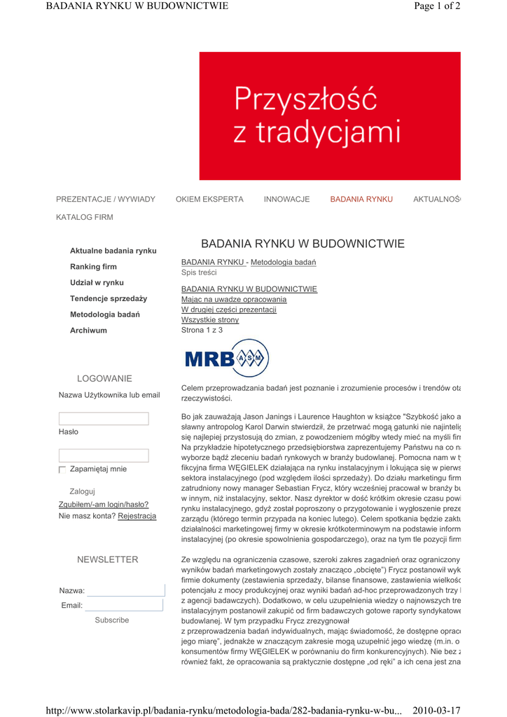 BADANIA RYNKU W BUDOWNICTWIE PREZENTACJE / WYWIADY OKIEM EKSPERTA Page 1 of 2 INNOWACJE BADANIA RYNKU AKTUALNOŚCI KATALOG FIRM Aktualne badania rynku Ranking firm Udział w rynku Tendencje sprzedaŜy Metodologia badań Archiwum BADANIA RYNKU W BUDOWNICTWIE BADANIA RYNKU - Metodologia badań Spis treści BADANIA RYNKU W BUDOWNICTWIE Mając na uwadze opracowania W drugiej części prezentacji Wszystkie strony Strona 1 z 3 LOGOWANIE Nazwa UŜytkownika lub email Hasło c Zapamiętaj mnie d e f g Zaloguj Zgubiłem/-am login/hasło? Nie masz konta? Rejestracja NEWSLETTER Nazwa: Email: Subscribe Celem przeprowadzania badań jest poznanie i zrozumienie procesów i trendów otaczaj rzeczywistości. Bo jak zauwaŜają Jason Janings i Laurence Haughton w ksiąŜce "Szybkość jako atut w sławny antropolog Karol Darwin stwierdził, Ŝe przetrwać mogą gatunki nie najinteligentniejsze, le się najlepiej przystosują do zmian, z powodzeniem mógłby wtedy mieć na myśli firmy. Na przykładzie hipotetycznego przedsiębiorstwa zaprezentujemy Państwu na co nale wyborze bądź zleceniu badań rynkowych w branŜy budowlanej. Pomocna nam w tym zakresie b fikcyjna firma WĘGIELEK działająca na rynku instalacyjnym i lokująca się w pierwszej sektora instalacyjnego (pod względem ilości sprzedaŜy). Do działu marketingu firmy W zatrudniony nowy manager Sebastian Frycz, który wcześniej pracował w branŜy budowlanej w innym, niŜ instalacyjny, sektor. Nasz dyrektor w dość krótkim okresie czasu powinien pozna rynku instalacyjnego, gdyŜ został poproszony o przygotowanie i wygłoszenie prezentacji na spot zarządu (którego termin przypada na koniec lutego). Celem spotkania będzie zaktualizowanie działalności marketingowej firmy w okresie krótkoterminowym na podstawie informacji o kondycj instalacyjnej (po okresie spowolnienia gospodarczego), oraz na tym tle pozycji firmy W Ze względu na ograniczenia czasowe, szeroki zakres zagadnień oraz ograniczony bud wyników badań marketingowych zostały znacząco „obcięte”) Frycz postanowił wykorzysta firmie dokumenty (zestawienia sprzedaŜy, bilanse finansowe, zastawienia wielkości potencjału z mocy produkcyjnej oraz wyniki badań ad-hoc przeprowadzonych trzy lata wcze z agencji badawczych). Dodatkowo, w celu uzupełnienia wiedzy o najnowszych trendach w sekto instalacyjnym postanowił zakupić od firm badawczych gotowe raporty syndykatowe dedykowane budowlanej. W tym przypadku Frycz zrezygnował z przeprowadzenia badań indywidualnych, mając świadomość, Ŝe dostępne opracowania jego miarę”, jednakŜe w znaczącym zakresie mogą uzupełnić jego wiedzę (m.in. o postrzeganiu konsumentów firmy WĘGIELEK w porównaniu do firm konkurencyjnych). Nie bez znaczenia poz równieŜ fakt, Ŝe opracowania są praktycznie dostępne „od ręki” a ich cena jest znacz http://www.stolarkavip.pl/badania-rynku/metodologia-bada/282-badania-rynku-w-bu... 2010-03-17 BADANIA RYNKU W BUDOWNICTWIE Page 2 of 2 przypadku indywidualnego zlecenia. Frycz pomyślał równieŜ, Ŝe w dalszej perspektywie zakupio opracowania mogą zostać wykorzystane jako podstawa do przeprowadzenia szczegó WĘGIELEK, których wyniki będą dostępne wyłącznie dla nich. Kontakt Warunki rejestracji Partnerzy Regulamin Współpraca http://www.stolarkavip.pl/badania-rynku/metodologia-bada/282-badania-rynku-w-bu... 2010-03-17