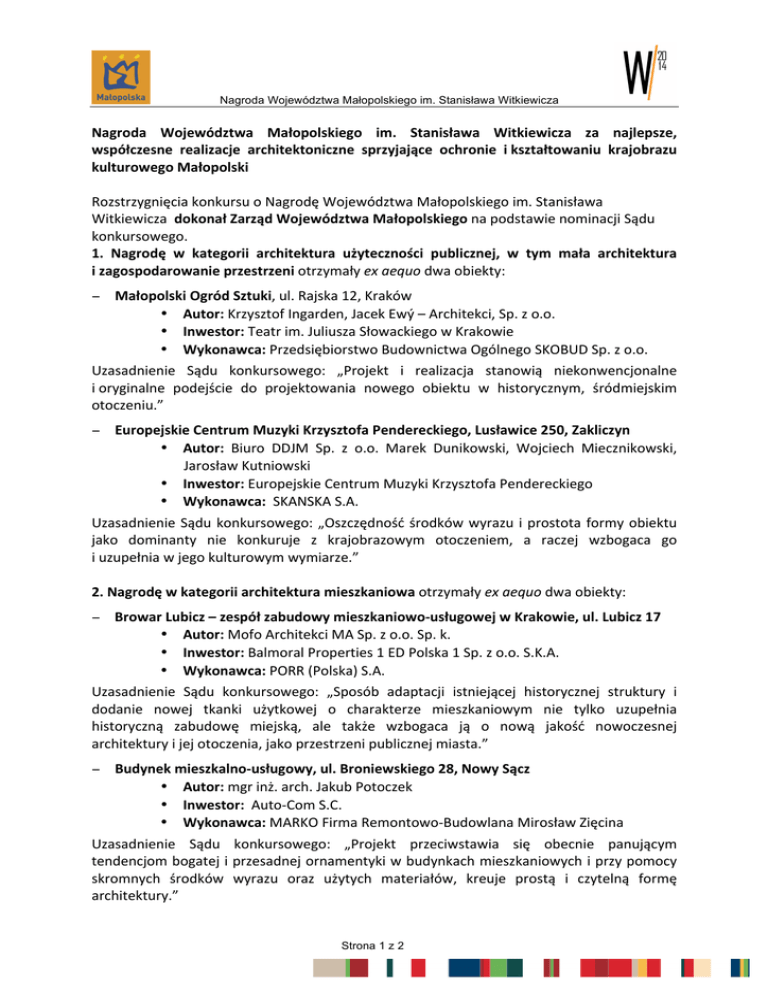 Nagroda Województwa Małopolskiego im. Stanisława Witkiewicza Nagroda Województwa Małopolskiego im. Stanisława Witkiewicza za najlepsze, współczesne realizacje architektoniczne sprzyjające ochronie i kształtowaniu krajobrazu kulturowego Małopolski Rozstrzygnięcia konkursu o Nagrodę Województwa Małopolskiego im. Stanisława Witkiewicza dokonał Zarząd Województwa Małopolskiego na podstawie nominacji Sądu konkursowego. 1. Nagrodę w kategorii architektura użyteczności publicznej, w tym mała architektura i zagospodarowanie przestrzeni otrzymały ex aequo dwa obiekty: − Małopolski Ogród Sztuki, ul. Rajska 12, Kraków • Autor: Krzysztof Ingarden, Jacek Ewý – Architekci, Sp. z o.o. • Inwestor: Teatr im. Juliusza Słowackiego w Krakowie • Wykonawca: Przedsiębiorstwo Budownictwa Ogólnego SKOBUD Sp. z o.o. Uzasadnienie Sądu konkursowego: „Projekt i realizacja stanowią niekonwencjonalne i oryginalne podejście do projektowania nowego obiektu w historycznym, śródmiejskim otoczeniu.” − Europejskie Centrum Muzyki Krzysztofa Pendereckiego, Lusławice 250, Zakliczyn • Autor: Biuro DDJM Sp. z o.o. Marek Dunikowski, Wojciech Miecznikowski, Jarosław Kutniowski • Inwestor: Europejskie Centrum Muzyki Krzysztofa Pendereckiego • Wykonawca: SKANSKA S.A. Uzasadnienie Sądu konkursowego: „Oszczędność środków wyrazu i prostota formy obiektu jako dominanty nie konkuruje z krajobrazowym otoczeniem, a raczej wzbogaca go i uzupełnia w jego kulturowym wymiarze.” 2. Nagrodę w kategorii architektura mieszkaniowa otrzymały ex aequo dwa obiekty: − Browar Lubicz – zespół zabudowy mieszkaniowo-‐usługowej w Krakowie, ul. Lubicz 17 • Autor: Mofo Architekci MA Sp. z o.o. Sp. k. • Inwestor: Balmoral Properties 1 ED Polska 1 Sp. z o.o. S.K.A. • Wykonawca: PORR (Polska) S.A. Uzasadnienie Sądu konkursowego: „Sposób adaptacji istniejącej historycznej struktury i dodanie nowej tkanki użytkowej o charakterze mieszkaniowym nie tylko uzupełnia historyczną zabudowę miejską, ale także wzbogaca ją o nową jakość nowoczesnej architektury i jej otoczenia, jako przestrzeni publicznej miasta.” − Budynek mieszkalno-‐usługowy, ul. Broniewskiego 28, Nowy Sącz • Autor: mgr inż. arch. Jakub Potoczek • Inwestor: Auto-‐Com S.C. • Wykonawca: MARKO Firma Remontowo-‐Budowlana Mirosław Zięcina Uzasadnienie Sądu konkursowego: „Projekt przeciwstawia się obecnie panującym tendencjom bogatej i przesadnej ornamentyki w budynkach mieszkaniowych i przy pomocy skromnych środków wyrazu oraz użytych materiałów, kreuje prostą i czytelną formę architektury.” Strona 1 z 2 Nagroda Województwa Małopolskiego im. Stanisława Witkiewicza 3. Cztery wyróżnienia: − Sala Gimnastyczna, Maciejowa 83, Łabowa • Autor: Biuro Architekt Kaczmarczyk • Inwestor: Gmina Łabowa • Wykonawca: LEGBUD Mieczysław Legutko Uzasadnienie Sądu konkursowego: „Współczesny sposób użycia drewna jako materiału wystroju architektonicznego wnętrza, oddaje „klimat” architektury tej miejscowości i nawiązuje do lokalnej tradycji.” − Centrum Komputerowe (Centrum Informatyki) AGH, ul. Nawojki 11 w Krakowie • Autor: APA Czech Duliński Wróbel Agencja Projektowa Architektura Sp. z o.o. • Inwestor: Akademia Górniczo-‐Hutnicza im. St. Staszica w Krakowie • Wykonawca: Konsorcjum: Mostostal Warszawa S.A. (lider), WPBP nr 2 Wrobis S.A. Uzasadnienie Sądu konkursowego: „Architekturę tę cechuje dystyngowany charakter, właściwy dla obiektu dydaktycznego dobrze wpisanego w krajobraz miejsca.” − Plac Targowy w Mszanie Dolnej, ul. Władysława Orkana, Mszana Dolna • Autor: Em4. Pracownia Architektury. Brataniec • Inwestor: Gmina – Miasto Mszana Dolna • Wykonawca: F.U.H. BRUK BUD S.C. Kotarba Eugeniusz, Stożek Janusz Uzasadnienie Sądu konkursowego: „Przy użyciu skromnych środków formalnych i technicznych, osiągnięto wysoki poziom estetyczny całego architektonicznego założenia.” − Punkt Informacji Turystycznej w Krynicy-‐Zdroju, ul. Zdrojowa 4/2 • Autor: Pracownia Projektowa TARKO • Inwestor: Gmina Krynica-‐Zdrój • Wykonawca: MPGK Sp. z o.o. w Krynicy-‐Zdroju Uzasadnienie Sądu konkursowego: „Projekt i realizacja stanowią przykład dobrej kontynuacji tradycyjnej architektury miejsca i regionu.” Strona 2 z 2