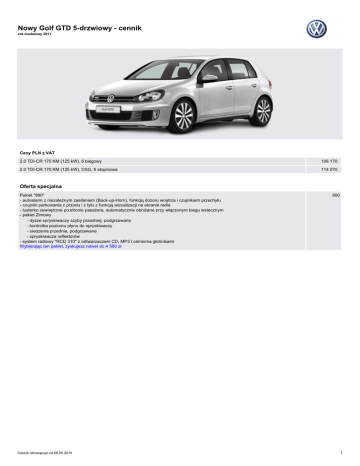 Nowy Golf GTD 5-drzwiowy - cennik rok modelowy 2011 Ceny PLN z VAT 2.0 TDI-CR 170 KM (125 kW), 6 biegowy 106 170 2.0 TDI-CR 170 KM (125 kW), DSG, 6 stopniowa 114 070 Oferta specjalna Pakiet "990" - autoalarm z niezależnym zasilaniem (Back-up-Horn), funkcją dozoru wnętrza i czujnikiem przechyłu - czujniki parkowania z przodu i z tyłu z funkcją wizualizacji na ekranie radia - lusterko zewnętrzne po stronie pasażera, automatycznie obniżane przy włączonym biegu wstecznym - pakiet Zimowy - dysze spryskiwaczy szyby przedniej, podgrzewane - kontrolka poziomu płynu do spryskiwaczy - siedzenia przednie, podgrzewane - spryskiwacze reflektorów - system radiowy "RCD 310" z odtwarzaczem CD, MP3 i ośmioma głośnikami Wybierając ten pakiet, zyskujesz nawet do 4 580 zł Cennik obowiązuje od 06.05.2010 990 1 Nowy Golf GTD 5-drzwiowy - cennik Wyposażenie standardowe Zewnętrzne Antena dachowa, aktywna Emblematy GTD z przodu i z tyłu, chromowane Końcówki układu wydechowego, dwie chromowane Lakiery specjalne: czerwony lub czarny Listwy na osłonie chłodnicy, dwie srebrne Obudowy lusterek i klamki lakierowane w kolorze nadwozia Osłona wlotu powietrza w kształcie plastra miodu, lakierowana w kolorze czarnym Spojlery: przedni, tylny oraz progowe Spojler dachowy, powiększony Szyby termoizolacyjne, zielone Światła tylne, przyciemniane, wykonane w technologii LED Wewnętrzne Aplikacje dekoracyjne "Black Stripe" Dywaniki materiałowe z przodu i tyłu Dźwignia hamulca ręcznego obszyta skórą Dźwignia zmiany biegów z elementami aluminium, obszyta skórą Kierownica multifunkcyjna, trójramienna, obszyta skórą, z elementami aluminium i emblematem GTD Lusterka "make-up" w osłonach przeciwsłonecznych po stronie kierowcy i pasażera, podświetlane Obsługą Tiptronic przyciskami na kierownicy - tylko dla automatycznej skrzyni biegów Oparcie tylnej kanapy z podłokietnikiem i otworem do przewożenia długich przedmiotów Pedały hamulca, sprzęgła i gazu wykończone aluminium Podłokietnik z przodu ze schowkiem Podsufitka w kolorze czarnym Siedzenia sportowe z przodu, podparcie odcinka lędźwiowego kręgosłupa regulowane manualnie Tapicerka siedzeń "Jacky" Bezpieczeństwo ABS z EBV (elektroniczny rozdział siły hamowania) ASR (system przeciwdziałający ślizganiu się kół samochodu przy przyspieszaniu) Asystent podjazdu - tylko dla automatycznej skrzyni biegów ESP (elektroniczny system stabilizacji toru jazdy) Hamulce tarczowe z przodu i z tyłu, z przodu wentylowane Isofix - przygotowanie do montażu dwóch fotelików dziecięcych na zewnętrznych siedzeniach z tyłu Kurtyny powietrzne MSR (system przeciwdziałający blokowaniu kół napędowych podczas hamowania silnikiem) Pasy bezpieczeństwa dla foteli przednich, bezwładnościowe, 3-punktowe, z regulacją wysokości Pasy bezpieczeństwa dla siedzeń tylnych, trzy bezwładnosciowe, 3-punktowe Poduszka kolanowa dla kierowcy Poduszka powietrzna dla pasażera - deaktywacja Poduszki powietrzne dla kierowcy i pasażera Poduszki powietrzne z przodu, boczne Światła bi-ksenonowe z funkcją doświetlania zakrętów, spryskiwacze reflektorów Światła przeciwmgielne (zintegrowane w zderzaku) Zabezpieczenie antykradzieżowe (Immobiliser) Zagłówki z przodu, z regulacją wysokości Zagłówki z tyłu, środkowy obniżony Cennik obowiązuje od 06.05.2010 2 Elektryczne i funkcjonalne Centralny zamek sterowany drogą radiową Czujnik deszczu z lusterkiem wstecznym, przyciemnianym automatycznie Czujnik zmierzchowości świateł z funkcją Coming / Leaving Home Gniazdo zasilające 12V w bagażnku Klimatyzacja z regulacją automatyczną "Climatronic" Kolumna kierownicy z możliwością regulacji w dwóch płaszczyznach Komputer pokładowy "MFA Plus" Lusterka boczne, elektrycznie ustawiane i podgrzewane, lewe lusterko asferyczne Sygnalizator niewyłączonych świateł, akustyczny Sygnalizator niezapiętych pasów bezpieczeństwa dla kierowcy i pasażera z przodu, akustyczny System radiowy "RCD 210" z odtwarzaczem CD, MP3 i 4 głośnikami Szyby z przodu sterowane elektrycznie Wspomaganie układu kierowniczego regulowane w zależności od prędkości samochodu, elektromechaniczne Koła i opony Obręcze ze stopu metali lekkich "Seattle" 7,5J x 17 - wewnętrzna część obręczy lakierowana na czarno - opony 225/45 R 17 - zawieszenie sportowe, obniżone o 15 mm - śruby kół z zabezpieczeniem antykradzieżowym "Thatcham" - koło zapasowe, dojazdowe Cennik obowiązuje od 06.05.2010 3 Nowy Golf GTD 5-drzwiowy - cennik Wyposażenie dodatkowe Pakiety specjalne Pakiet "990" - autoalarm z niezależnym zasilaniem (Back-up-Horn), funkcją dozoru wnętrza i czujnikiem przechyłu - czujniki parkowania z przodu i z tyłu z funkcją wizualizacji na ekranie radia - lusterko zewnętrzne po stronie pasażera, automatycznie obniżane przy włączonym biegu wstecznym - pakiet Zimowy - dysze spryskiwaczy szyby przedniej, podgrzewane - kontrolka poziomu płynu do spryskiwaczy - siedzenia przednie, podgrzewane - spryskiwacze reflektorów - system radiowy "RCD 310" z odtwarzaczem CD, MP3 i ośmioma głośnikami Wybierając ten pakiet, zyskujesz nawet do 4 580 zł 990 Zewnętrzne Dach szklany, elektrycznie otwierany 4 590 "DCC" - Adaptacyjna regulacja zawieszenia 3 770 Światła tylne wykonane w technologii LED 1 600 Bezpieczeństwo Poduszki powietrzne dla pasażerów z tyłu, boczne 1 250 Elektryczne i funkcjonalne Autoalarm z niezależnym zasilaniem (Back-up-Horn), funkcją dozoru wnętrza i czujnikiem przechyłu 710 Instalacja telefonu Premium 1 700 System nawigacji satelitarnej "RNS 310" 2 950 System nawigacji satelitarnej "RNS 310" - dla pakietu specjalnego "990" 2 200 System nawigacji satelitarnej "RNS 510" 7 250 System nawigacji satelitarnej "RNS 510" - dla pakietu specjalnego "990" 6 500 System nawigacji satelitarnej "RNS 510 Dynaudio Excite" 9 050 System nawigacji satelitarnej "RNS 510 Dynaudio Excite" - dla pakietu specjalnego "990" 8 300 System radi
