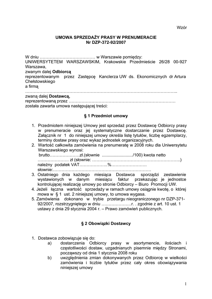 Wzór UMOWA SPRZEDAŻY PRASY W PRENUMERACIE Nr DZP-372-92/2007 W dniu ………………………………… w Warszawie pomiędzy: UNIWERSYTETEM WARSZAWSKIM, Krakowskie Przedmieście 26/28 00-927 Warszawa, zwanym dalej Odbiorcą reprezentowanym przez Zastępcę Kanclerza UW ds. Ekonomicznych dr Artura Chełstowskiego a firmą …………………………………………………………………………………………….. zwaną dalej Dostawcą, reprezentowaną przez ………………………………………………………………… została zawarta umowa następującej treści: § 1 Przedmiot umowy 1. Przedmiotem niniejszej Umowy jest sprzedaż przez Dostawcę Odbiorcy prasy w prenumeracie oraz jej systematyczne dostarczanie przez Dostawcę. Załącznik nr 1 do niniejszej umowy określa listę tytułów, liczbę egzemplarzy, terminy dostaw prasy oraz wykaz jednostek organizacyjnych. 2. Wartość całkowita zamówienia na prenumeratę w 2008 roku dla Uniwersytetu Warszawskiego wynosi: brutto…………………zł.(słownie ........................../100) kwota netto …………………. zł (słownie: ……………………………………………………..) należny podatek VAT………………..%……………………. słownie:…………………………………………………………… 3. Ostatniego dnia każdego miesiąca Dostawca sporządzi zestawienie wystawionych w danym miesiącu faktur przekazując je jednostce kontrolującej realizację umowy po stronie Odbiorcy – Biuro Promocji UW. 4. Jeżeli łączna wartość sprzedaży w ramach umowy osiągnie kwotę, o której mowa w § 1 ust. 2 niniejszej umowy, to umowa wygasa. 5. Zamówienia dokonano w trybie przetargu nieograniczonego nr DZP-37192/2007, rozstrzygniętego w dniu …………………r. . zgodnie z art. 10 ust. 1 ustawy z dnia 29 stycznia 2004 r. – Prawo zamówień publicznych. § 2 Obowiązki Dostawcy 1. Dostawca zobowiązuje się do: a) dostarczenia Odbiorcy prasy w asortymencie, ilościach i częstotliwości dostaw, uzgadnianych pisemnie między Stronami, począwszy od dnia 1 stycznia 2008 roku b) uwzględnienia zmian dokonywanych przez Odbiorcę w wielkości zamówienia i liczbie tytułów przez cały okres obowiązywania niniejszej umowy 1 c) 2. 3. 4. 5. zmiany, o których mowa w lit. b nie mogą powodować wzrostu wartości określonej w § 1 ust. 2 Dostawca zobowiązuje się do dołożenia wszelkich starań w transportowaniu i pakowaniu zamówionej, na podstawie niniejszej Umowy, prasy, tak aby w chwili jej dostawy Odbiorcy prasa znajdowała się w stanie nie pogorszonym. Dostawca zobowiązuje się rozdzielać prasę na poszczególne jednostki organizacyjne Odbiorcy, zgodnie z wykazem stanowiącym załącznik nr 1 do niniejszej umowy. Dostawca zobowiązuje się zapłacić Odbiorcy karę umowną w wysokościach podanych poniżej w następujących przypadkach: a) zwłoki w dostarczaniu prasy – w wysokości 1 % (słownie: jeden procent) całkowitej wartości zamówienia, gdy zwłoka ta wyniosła odpowiednio: co najmniej jeden dzień roboczy dla dzienników licząc od daty wydawniczej danego dziennika; co najmniej dwa dni robocze dla tygodników i co najmniej cztery dni robocze dla czasopism ukazujących się rzadziej niż raz na tydzień licząc od pierwszego dnia sprzedaży czasopisma określonego przez odpowiedniego wydawcę, za każdy dzień zwłoki b) błędów dotyczących liczby egzemplarzy, asortymentu i częstotliwości dostarczania prasy – w wysokości 0,1 % (jedna dziesiąta procenta) całkowitej wartości zamówienia, gdy reklamacja Odbiorcy dotycząca wymienionych wyżej błędów nie została rozpatrzona przez Dostawcę odpowiednio: w dniu zgłoszenia dla dzienników, w dwa dni od daty zgłoszenia dla tygodników i w cztery dni od daty zgłoszenia dla czasopism ukazujących się rzadziej niż raz na tydzień. c) niedostarczenie prasy – 50 zł (słownie: pięćdziesiąt złotych) za każdy nie dostarczony egzemplarz dziennika lub czasopisma; przez niedostarczenie rozumie się zwłokę wynoszącą dwa dni dla dzienników, siedem dni dla tygodników i czternaście dni dla czasopism ukazujących się rzadziej niż raz na tydzień oraz czasopism ukazujących się nieregularnie. Odbiorca może rozwiązać Umowę bez wypowiedzenia, jeśli opisane w ust. 4 przypadki zdarzać się będą co najmniej dwa razy w miesiącu. § 3 Obowiązki Odbiorcy 1. Odbiorca zobowiązuje się do terminowego regulowania należności z tytułu sprzedaży prasy zgodnie z fakturami VAT w terminie 14 dni od daty jej doręczenia. 2. Strony ustalają następujący system rozliczeń: faktury będą wystawiane „z dołu” w ostatnim dniu każdego miesiąca. 3. W przypadku zwłoki w regulowaniu należności przez Odbiorcę Dostawca zastrzega sobie prawo do naliczania odsetek ustawowych za każdy dzień zwłoki. 4. Odbiorca wskazuje Pana Kamila Melcera jako osobę odpowiedzialną za kontakty i koordynację współpracy Odbiorcy z Dostawcą. 5. W przypadku zmiany liczby i rodzaju zamawianej prasy, Odbiorca zobowiązuje się do zachowania, pod rygorem nieważności, jednej z następujących form: telefaksowa, elektroniczna (e-mail), listowna. 2 § 4 Oświadczenia 1. Dostawca oświadcza, że posiada niezbędną wiedzę i doświadczenie, aby rzetelnie zrealizować przedmiot niniejszej Umowy. 2. Odbiorca oświadcza, że adresem właściwym dla dostaw zamówionej prasy jest: ul. Krakowskie Przedmieście 26/28, 00-927 Warszawa, Kancelaria Główna, Audytorium Maximum, z zastrzeżeniem ust. 3. 3. Dostawca będzie dostarczać prasę przeznaczoną dla: a) Sekcji ds. Ewidencji Obronnej Biura Spraw Pracowniczych, Działu Inwentaryzacji, Działu Gospodarki Materiałowej do ich siedziby: ul. Żwirki i Wigury 93, Warszawa b) Domu Studenta nr 2, ul. Żwirki i Wigury 95/97, Warszawa (recepcja) c) „Hera”, ul. Belwederska 26/30, Warszawa (recepcja) d) „Sokrates”, ul. Smyczkowa 9, Warszawa (recepcj